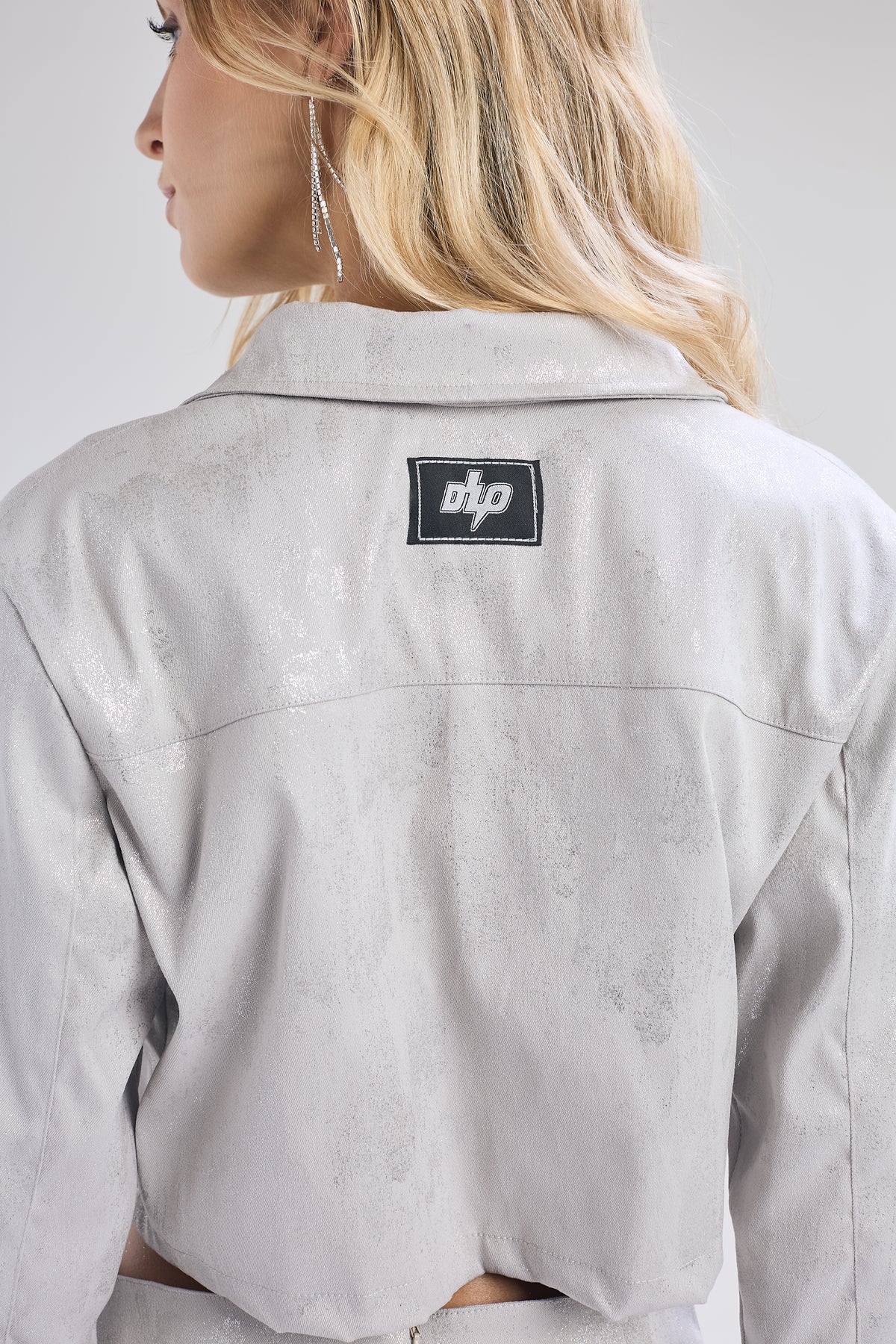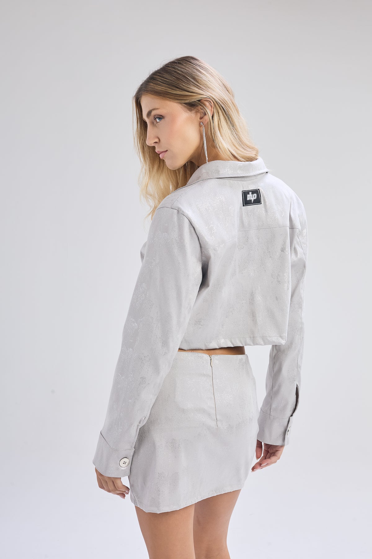 Chaqueta de gabardina con foil color plata, calce regular, largo por la cintura. Cuenta con cuello solapa y mangas largas. Detalle de etiqueta tejida personalizada en espalda. Acceso a la prenda mediante hebilla metálica con tira regulable en frente. Llévalo en conjunto con su falda!