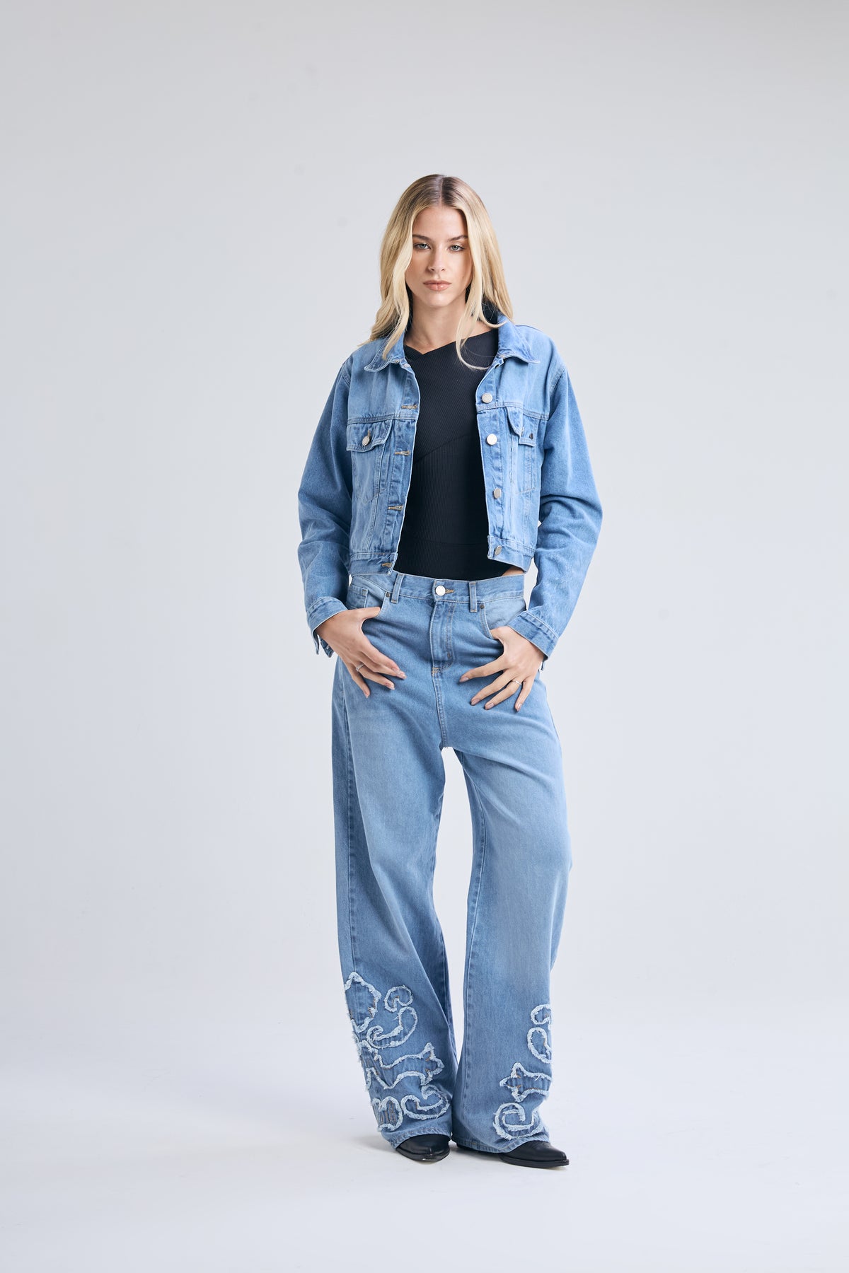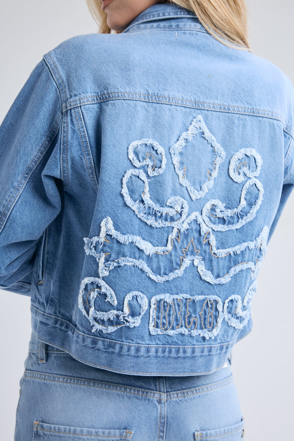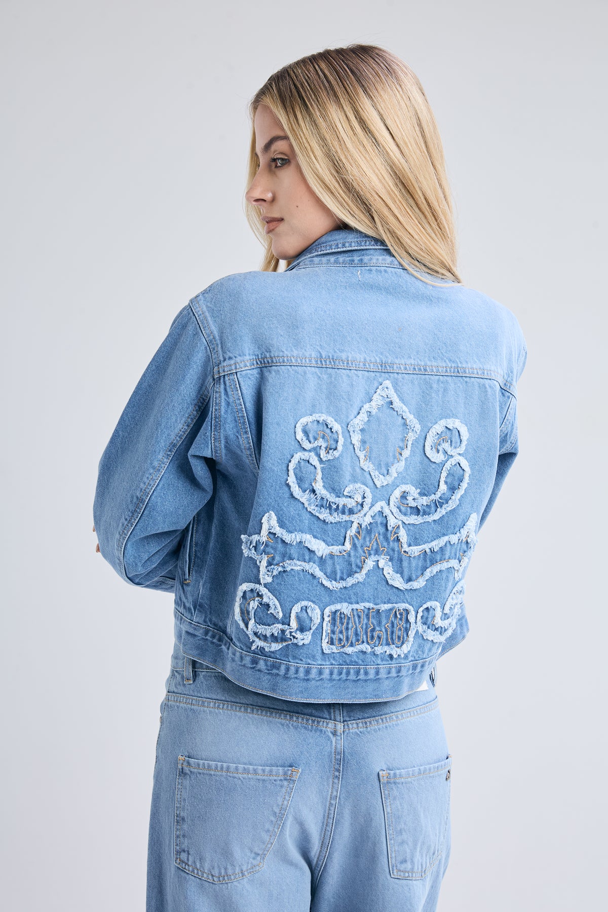 Campera de denim con aplique en espalda desflecado y bordado en conjunto con jean diana.