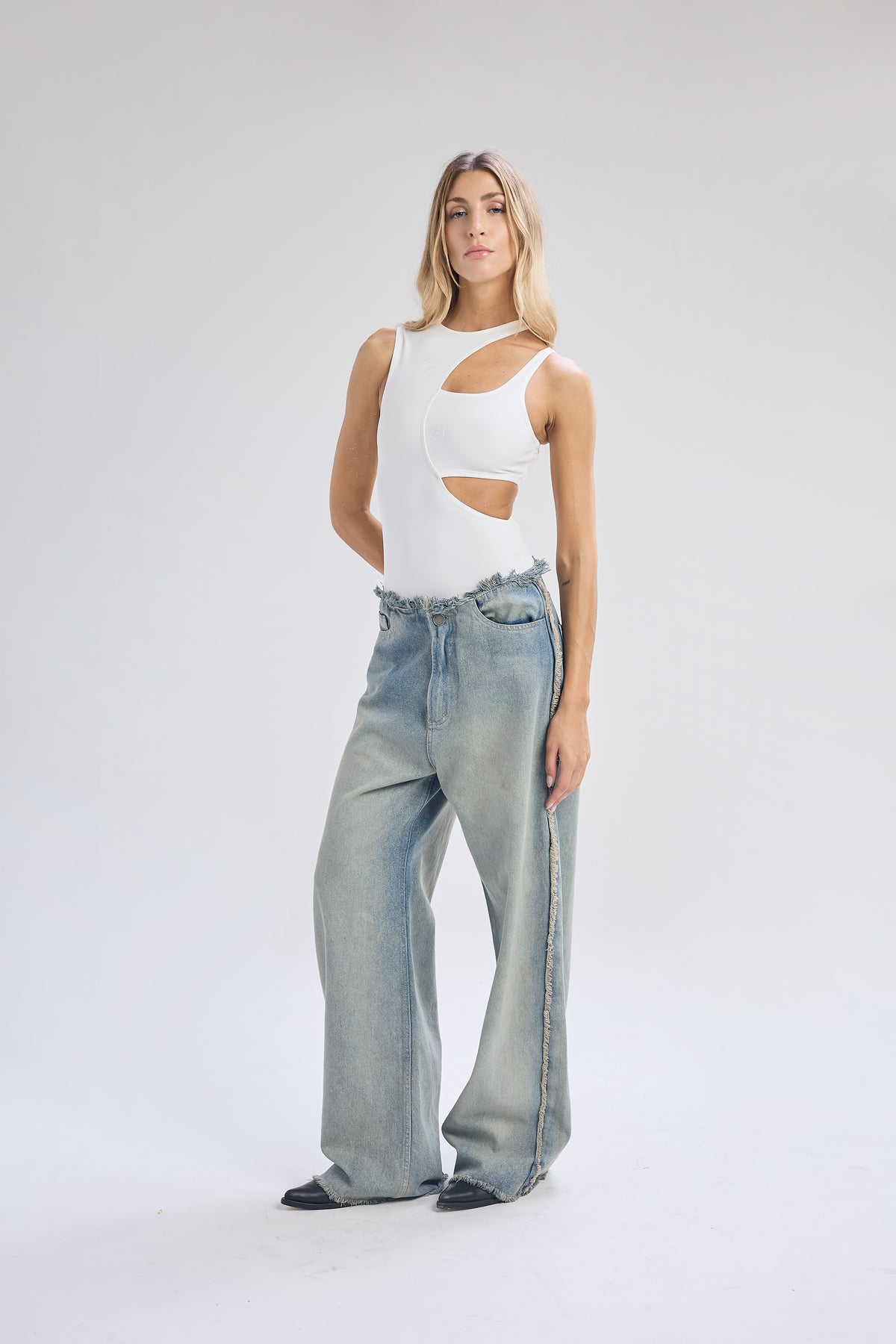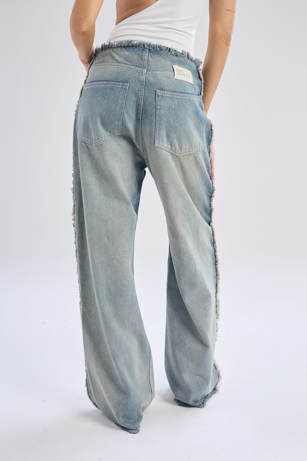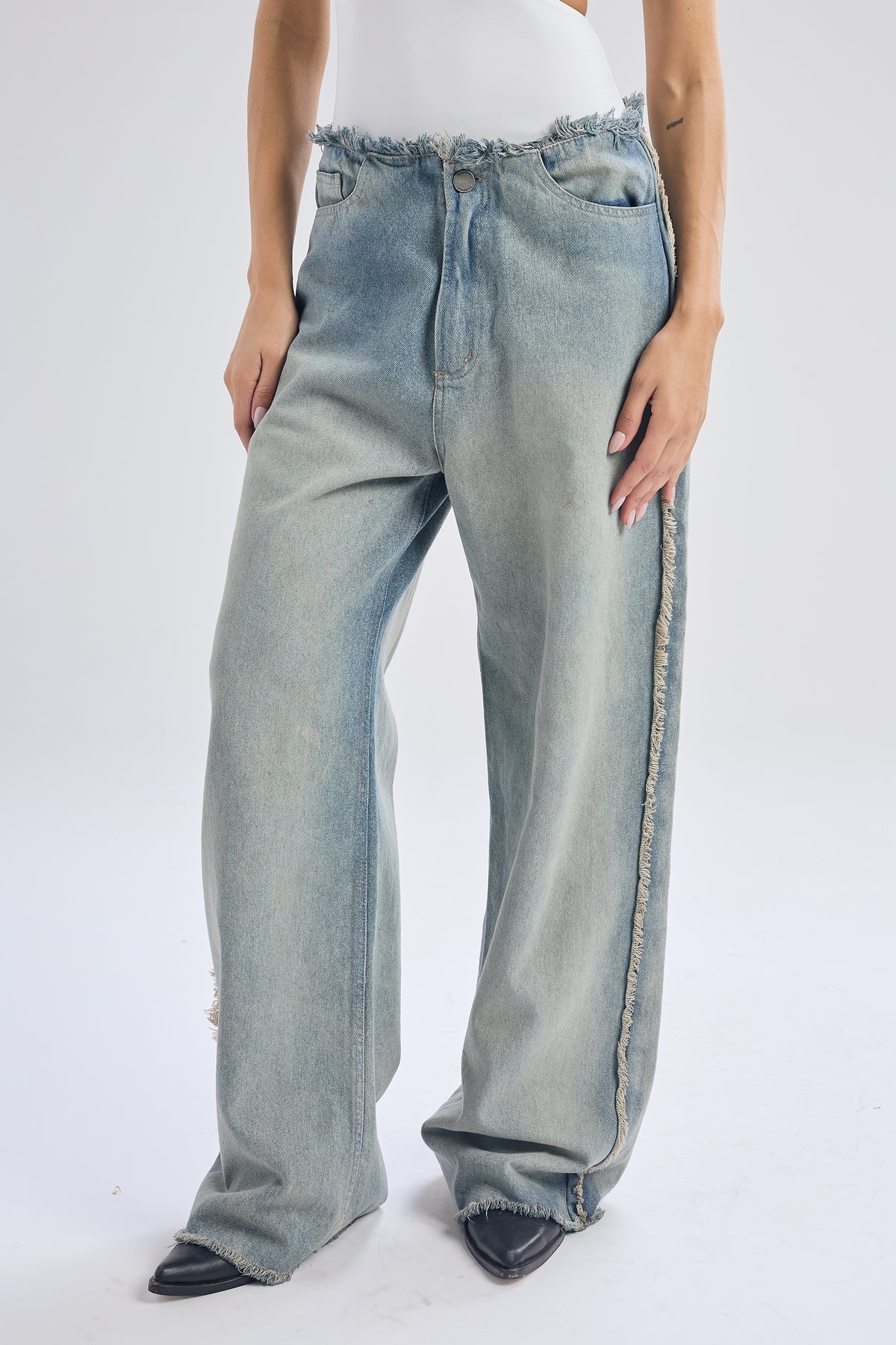 JEAN TIRO MEDIO CON CINCO BOLSILLOS, CORTE WIDE LEG LAVADO GRISACEO CON TERMINACIONES DESFLECADAS