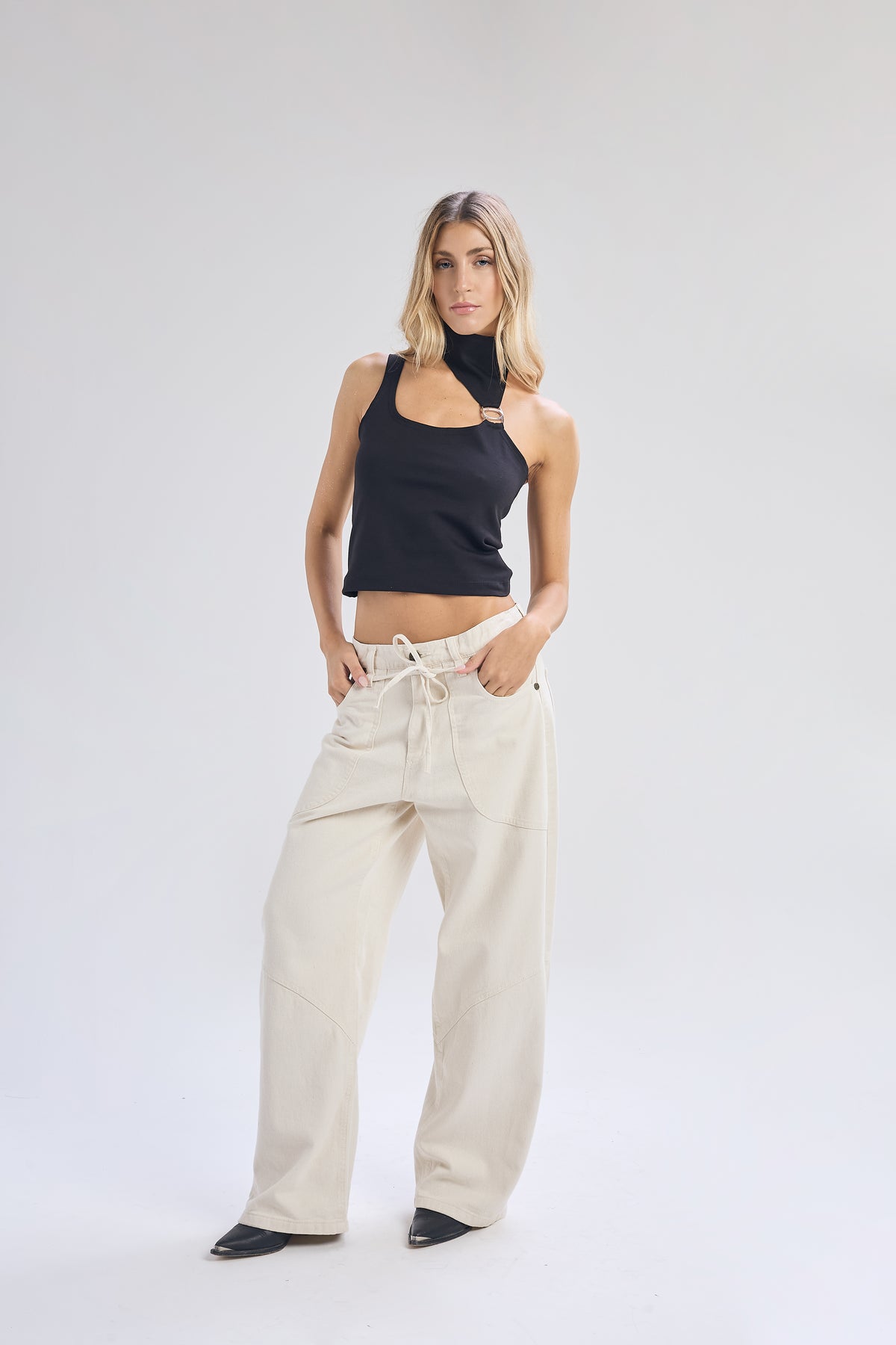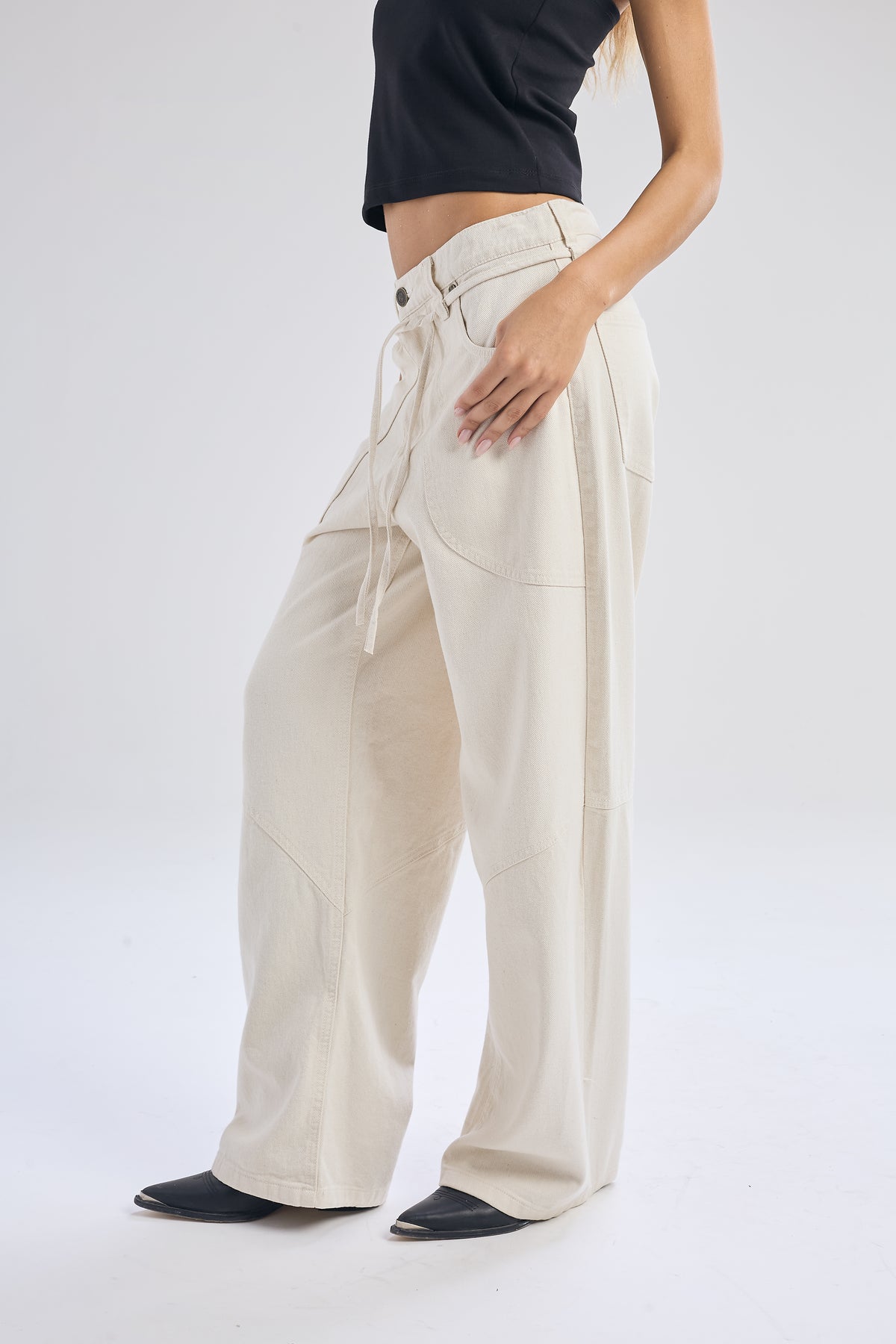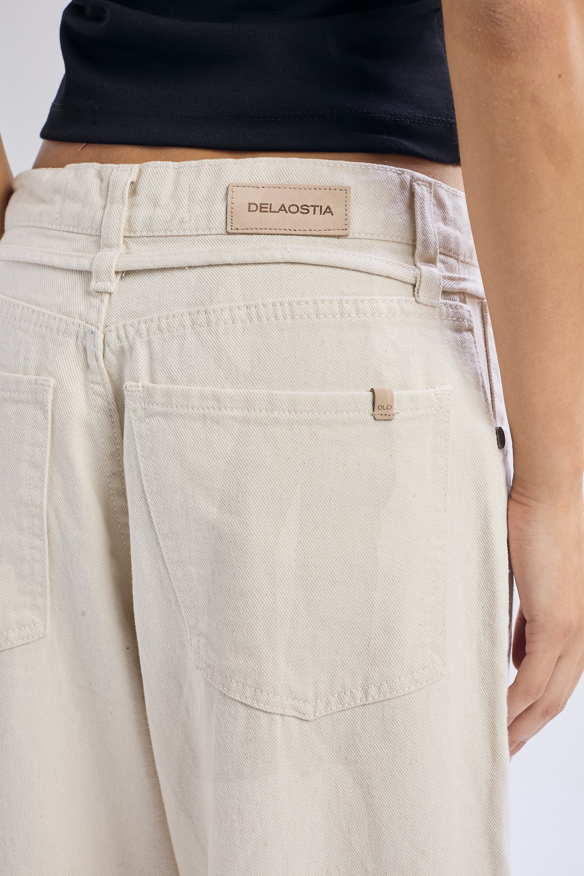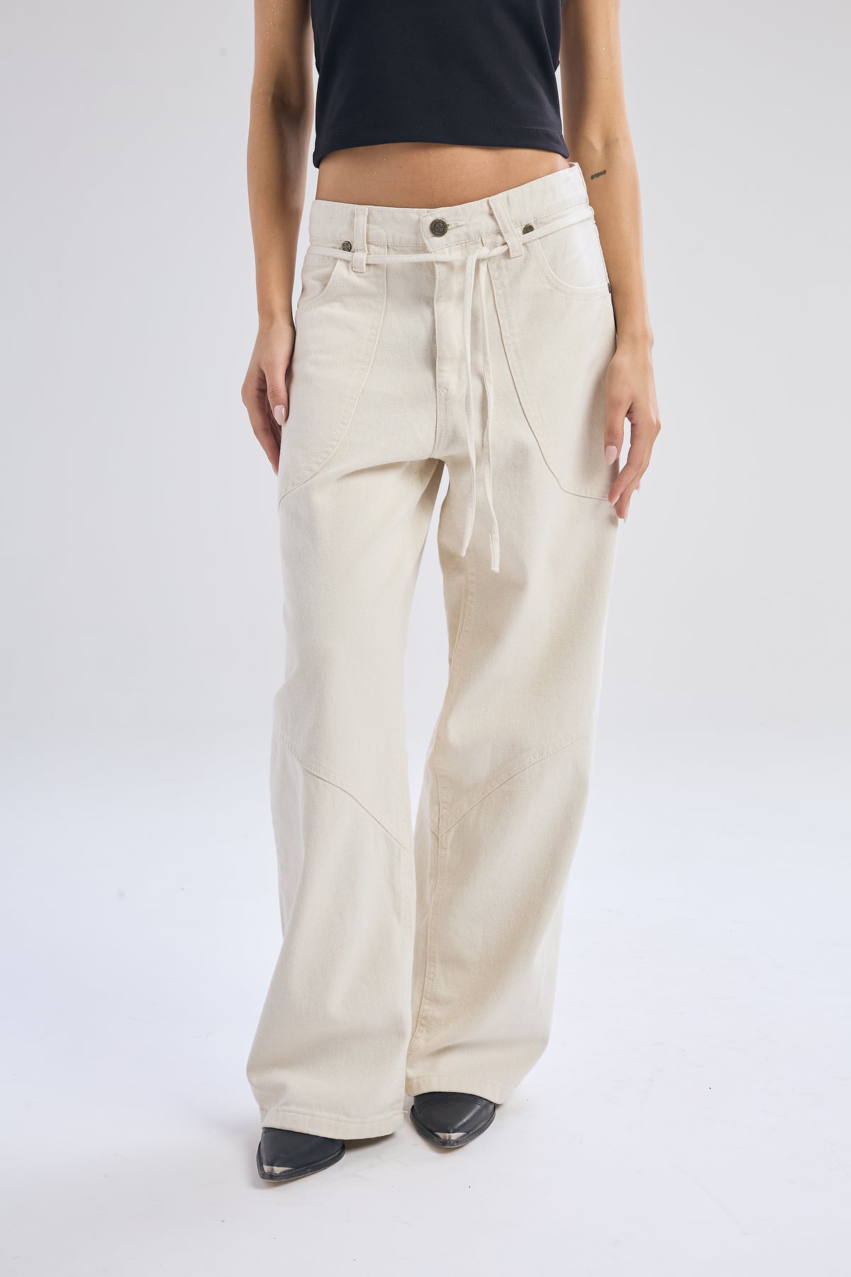 Jean "5 bolsillos", tiro medio y de corte Wide Leg. Confeccionado en denim 100% algodón en color crudo, suma el guiño fresco que el verano necesita. Su calce relajado combina recortes en piernas y detalle de lazo en cintura, el cual se sujeta con presillas dobles. Te proponemos usarlo un talle más grande al tuyo y experimentar un calce baggy y en tendencia. Amamos su color: fino y veraniego que nos recuerda a textiles nobles como el Lino!