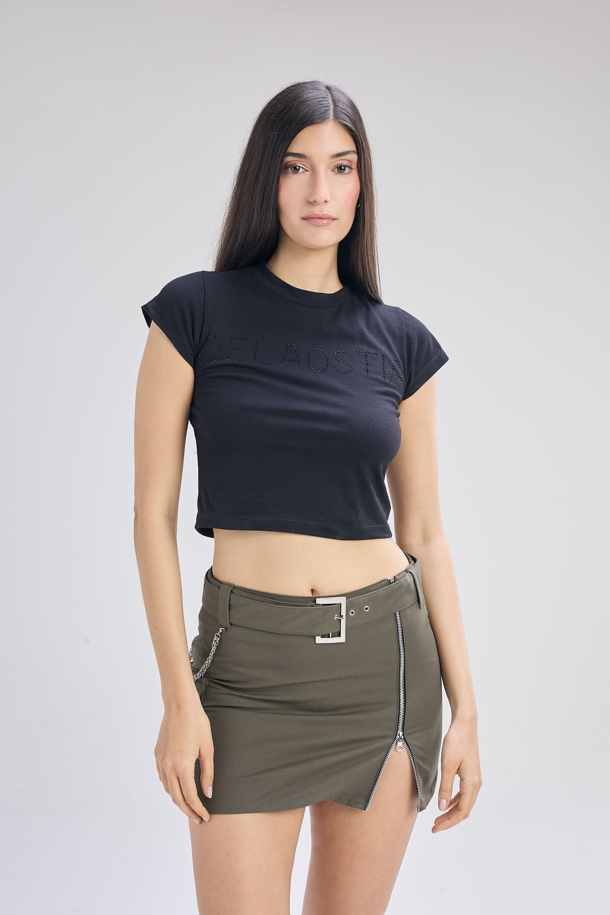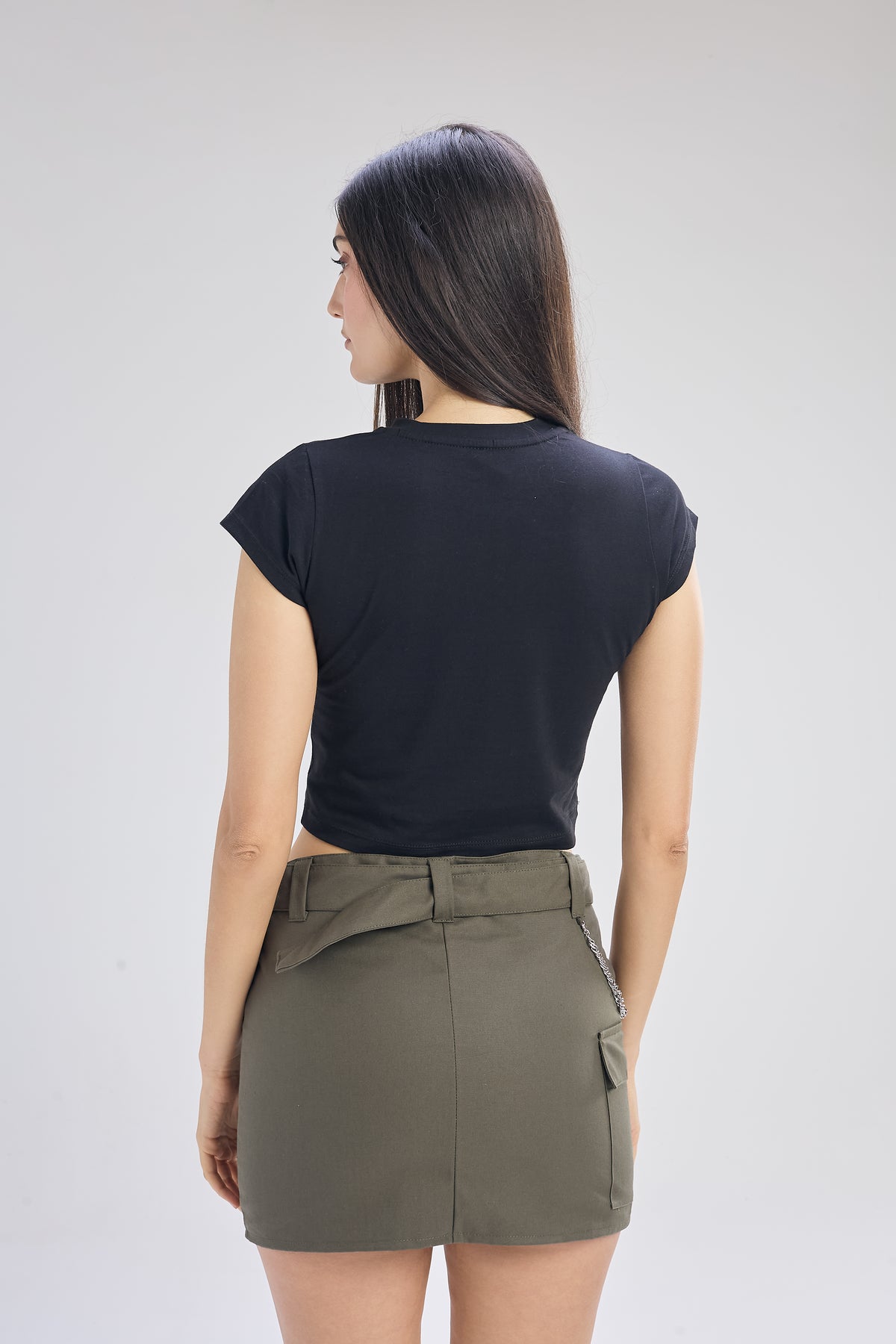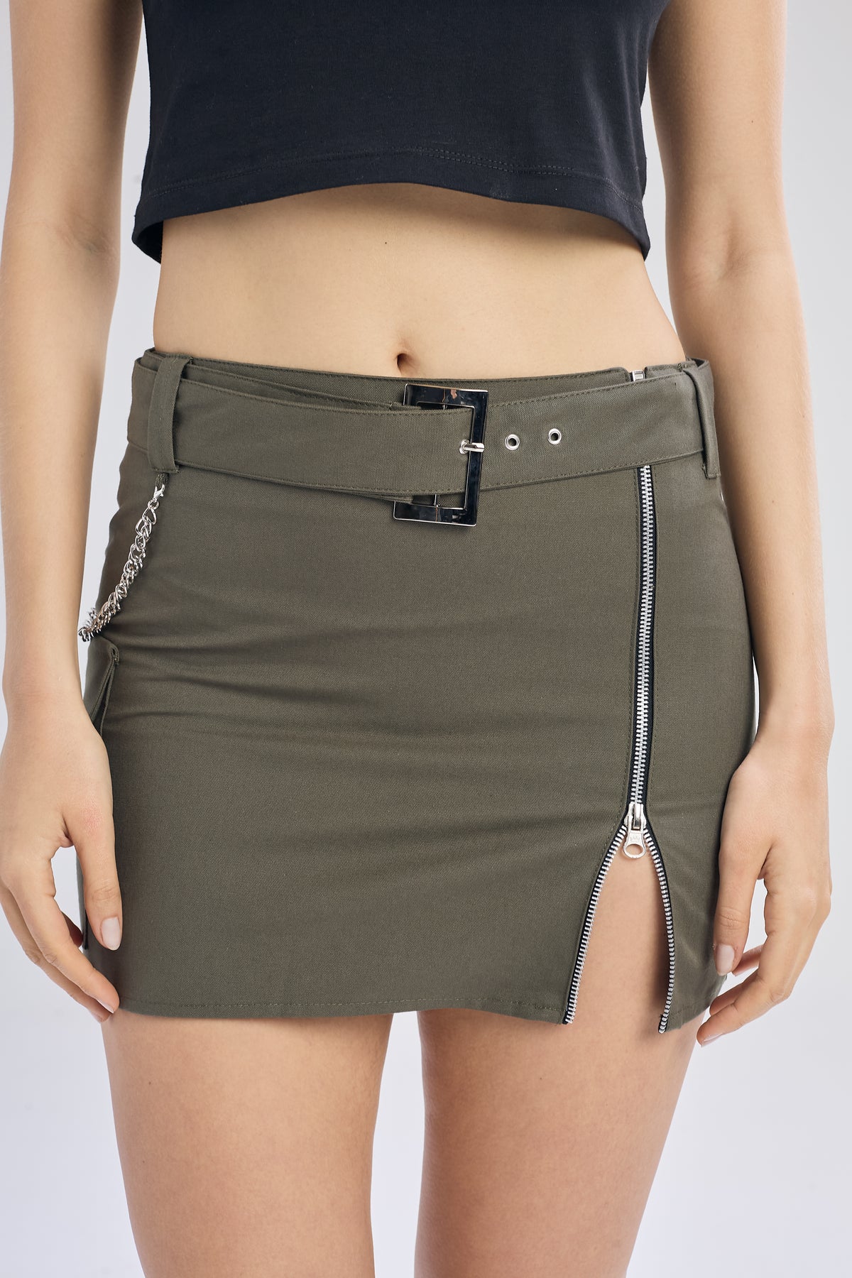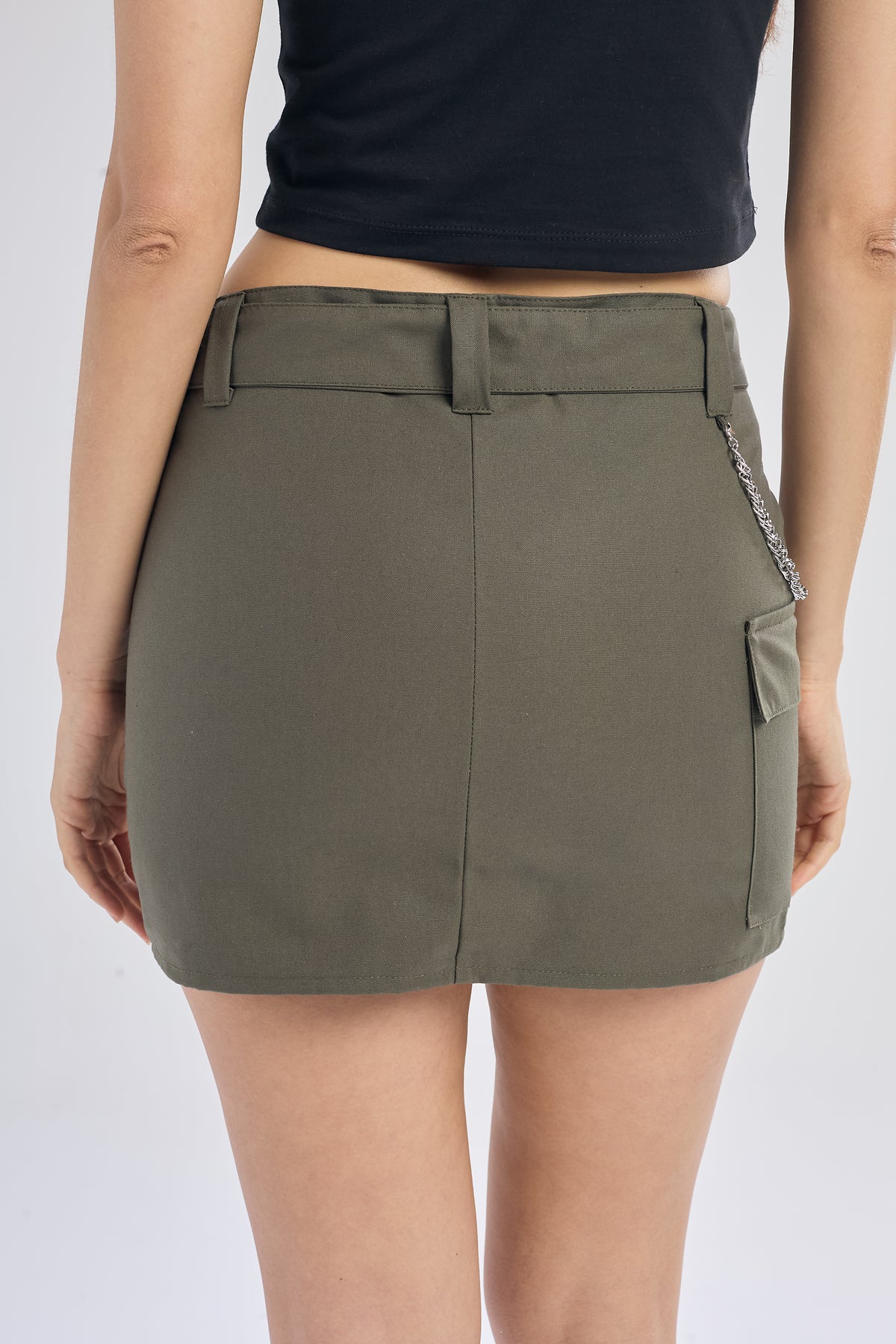 Falda corta de gabardina color verde militar, calce fit y tiro medio. Cintura con presillas y cinturón en tela base con hebilla metálica. Detalle de bolsillo cargo en lateral y cierre metálico para acceso en delantero.