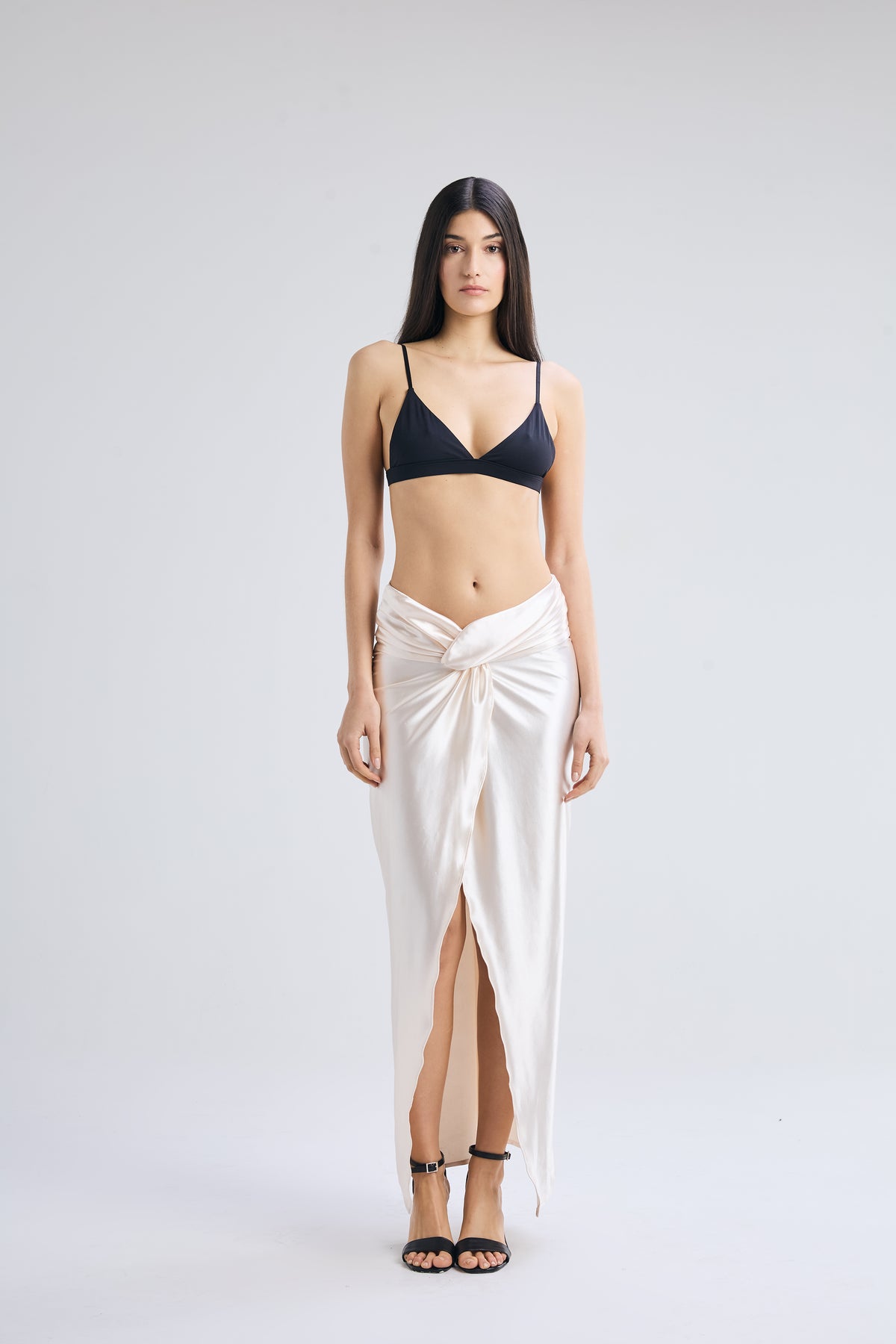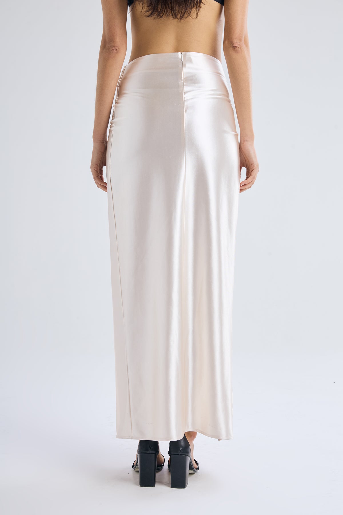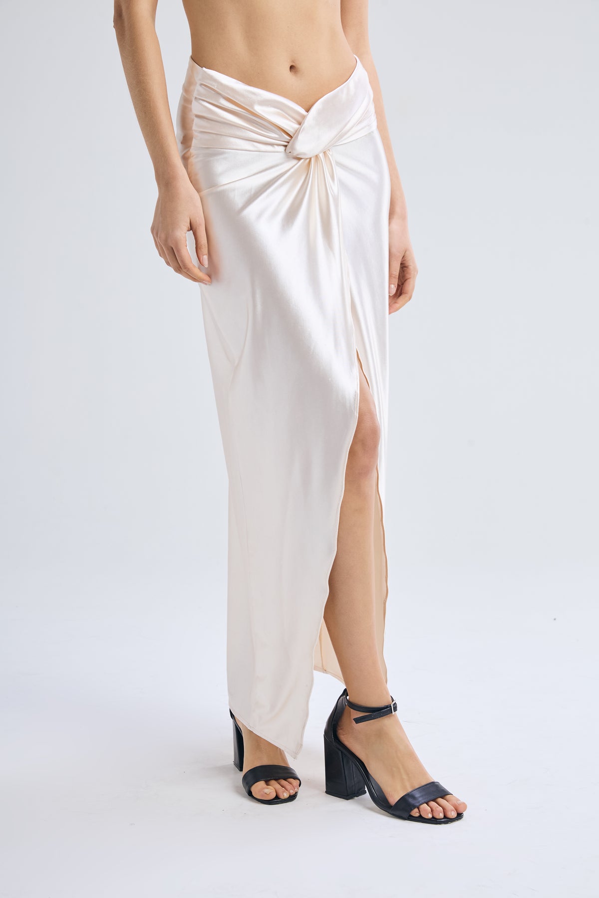 Falda larga de satén elastizado color crudo, calce fit y tiro bajo. Cintura con detalle de nudo central y tajo virado hacia la derecha. Acceso mediante cierre invisible en parte trasera de la prenda. Llévalo en conjunto con su top!