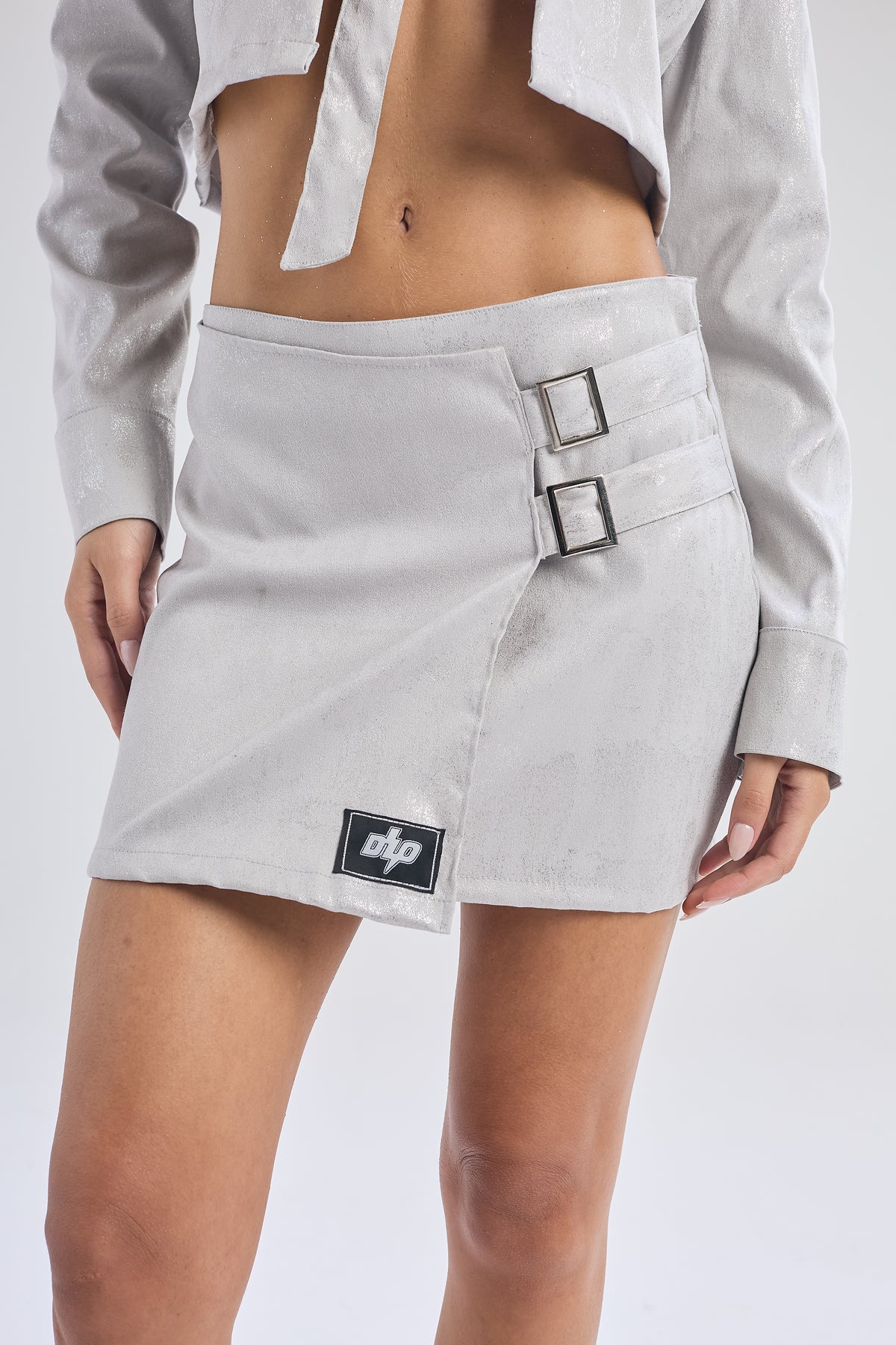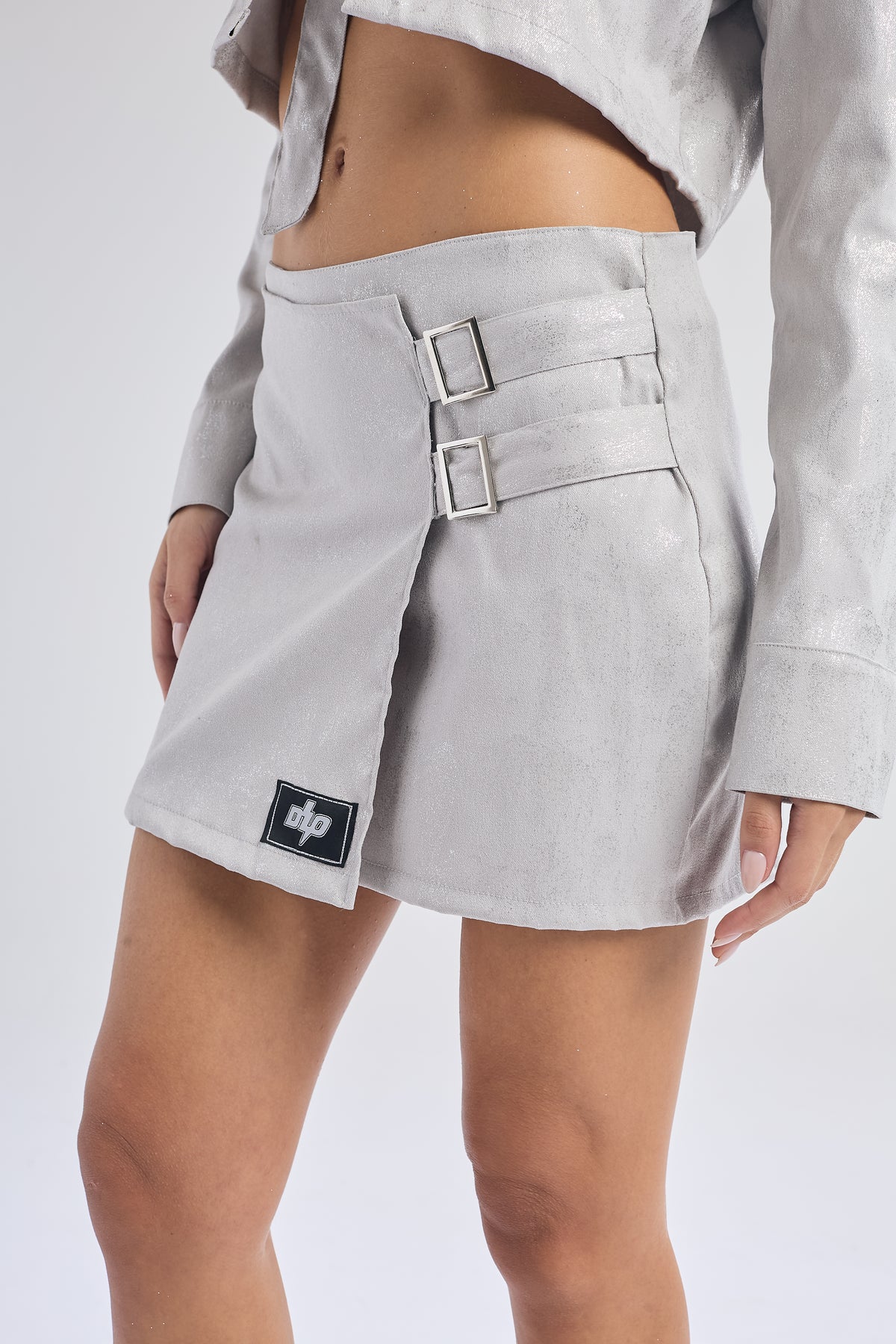 Falda corta de gabardina con foil color plata, calce fit y tiro medio. Cuenta con sobrefalda con hebillas metálicas y tiras regulables. Detalle de etiqueta tejida personalizada en sobrefalda. Acceso a la prenda mediante cierre en trasero . Llévalo en conjunto con su camisaco!