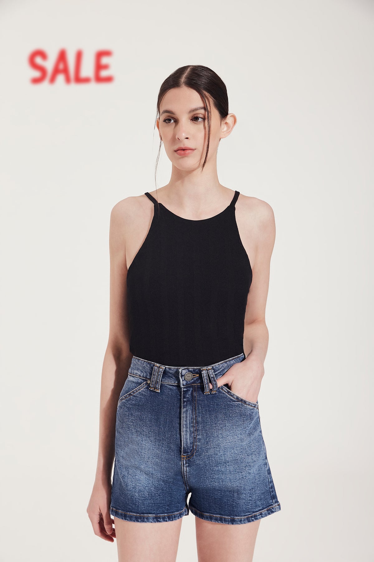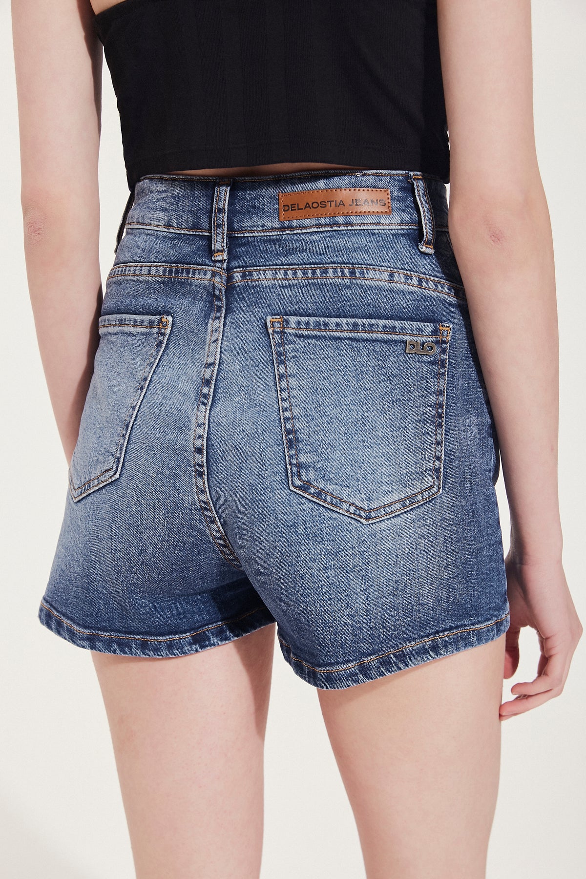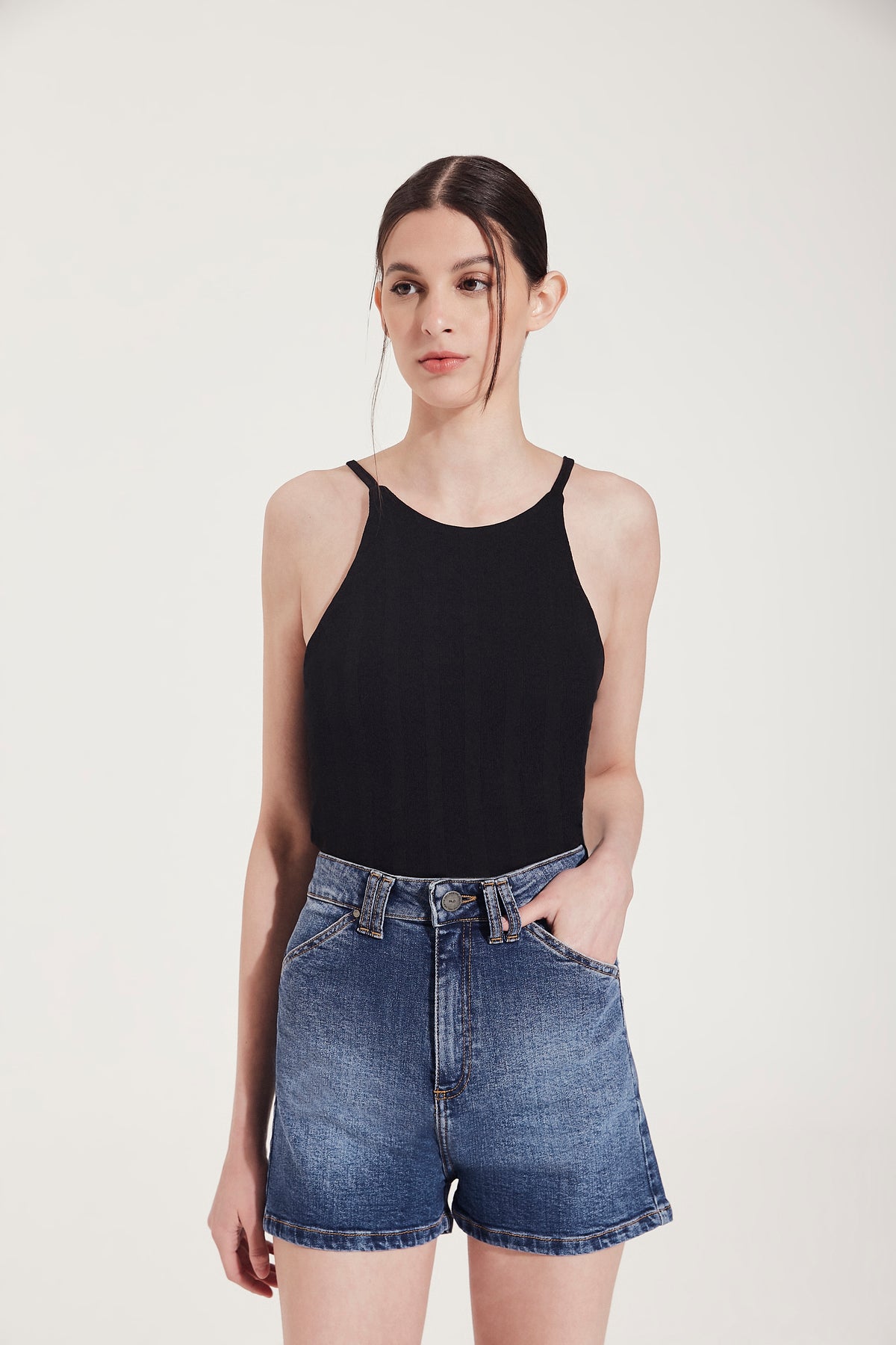 Short de denim tiro alto con doble presilla. Silueta: Slim. Largo modular: Pasando segunda cadera.