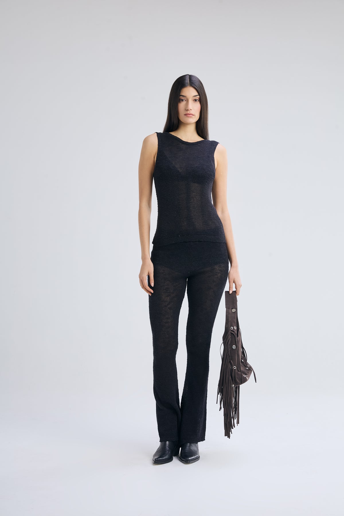 Pantalón Tejido en hilado de Algodón flame y lurex, color negro, calce tiro medio y corte Oxford. Cintura con elástico de 4 cm, pierna recta que en altura rodilla se hace Oxford. Ideal para combinar con su musculosa y estar fresca en las noches de verano.