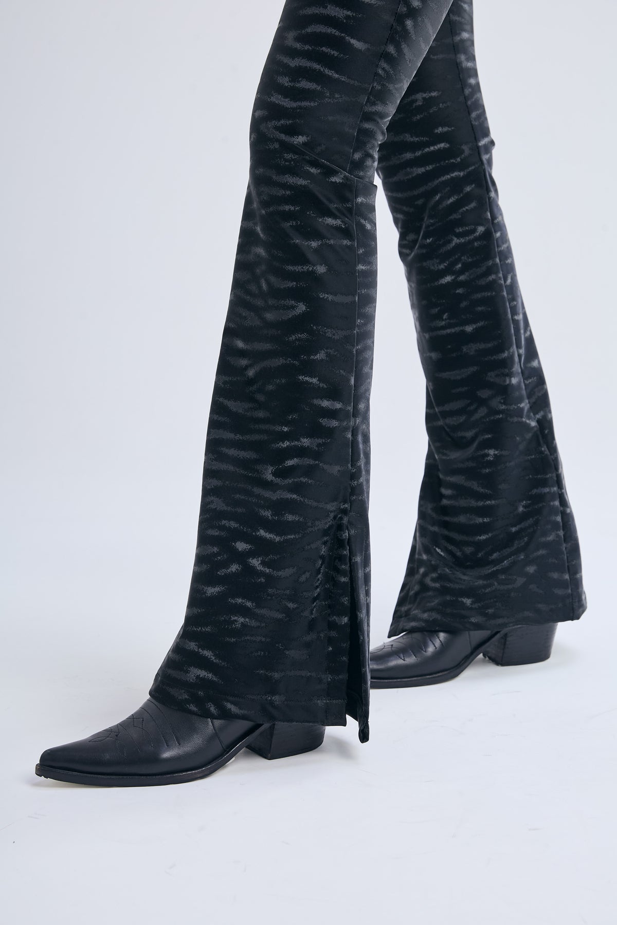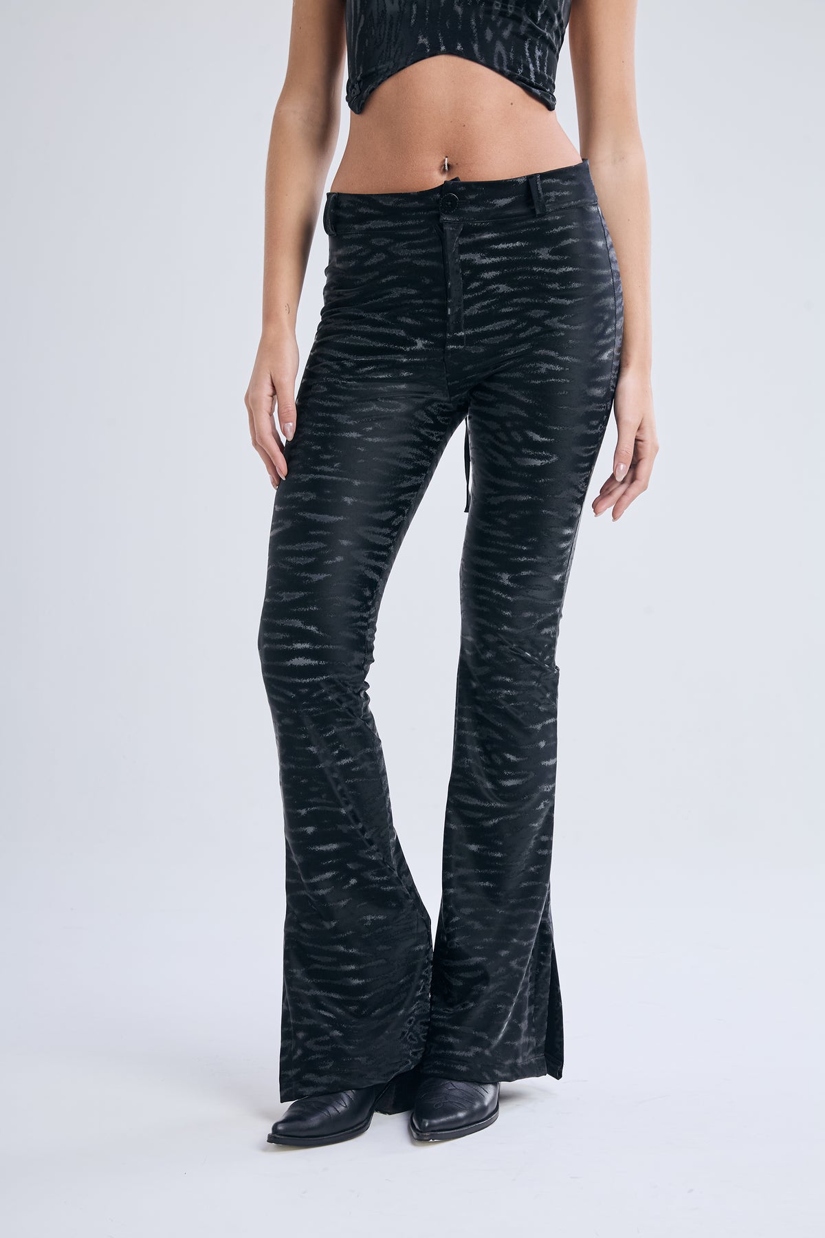 Pantalón elastizado, de tiro alto y calce Oxford. Cintura con pasacinto y cartera de cierre con botón metálico. Tela efecto engomado con motivo animal print. Pierna ajustada en la parte superior y detalle de tajo en botamanga de corte Oxford.