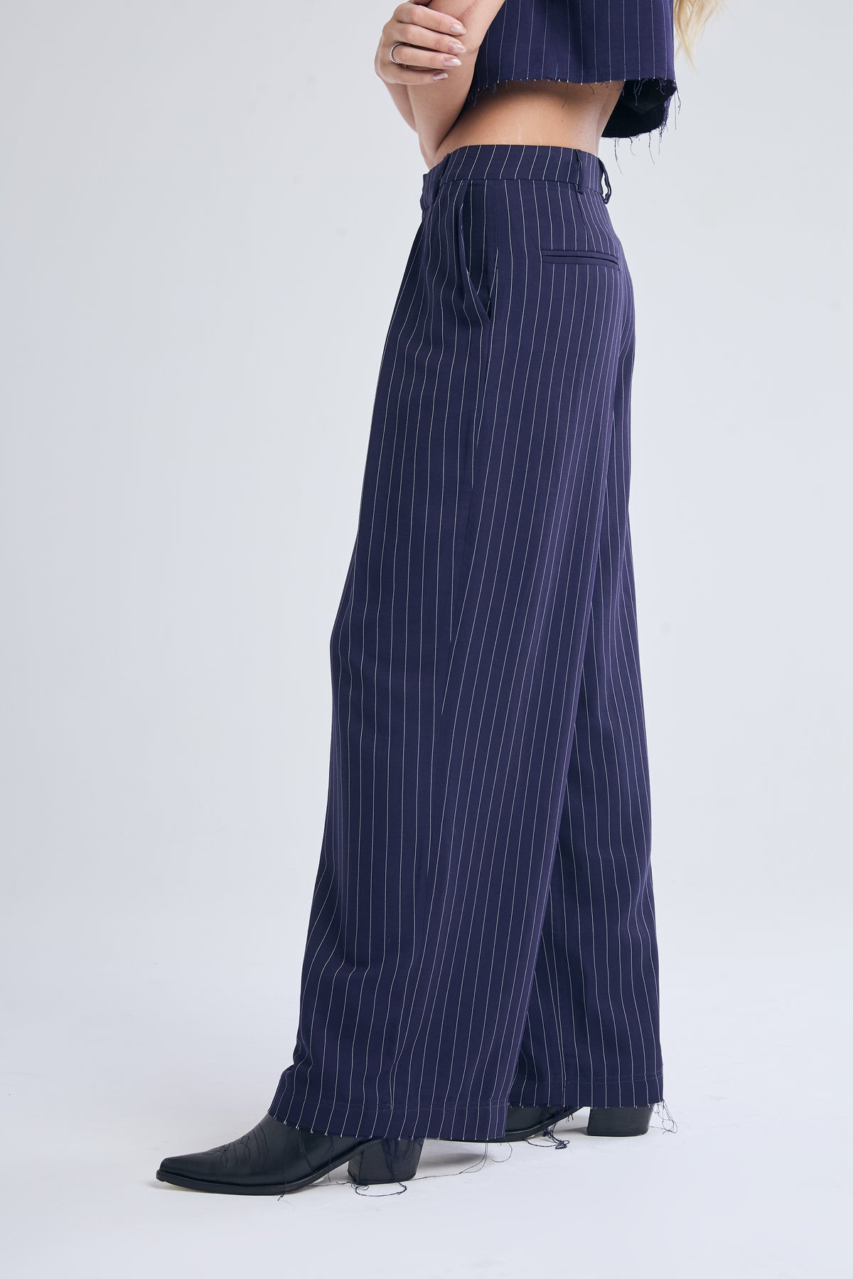 Pantalón sastrero rayado color azul, tiro medio con calce ancho tipo palazzo. Cintura con pasacinto y cartera de cierre con broche pantalonero. Bolsillo delantero lateral, Pierna amplia y ancha que termina con ruedo deshilachado con pespunte de refuerzo. Largo hasta el tobillo. Llevalo con su chaleco en conjunto!