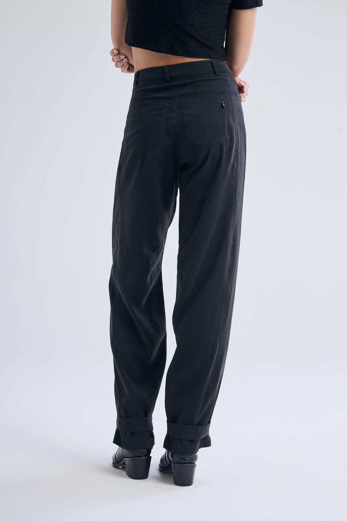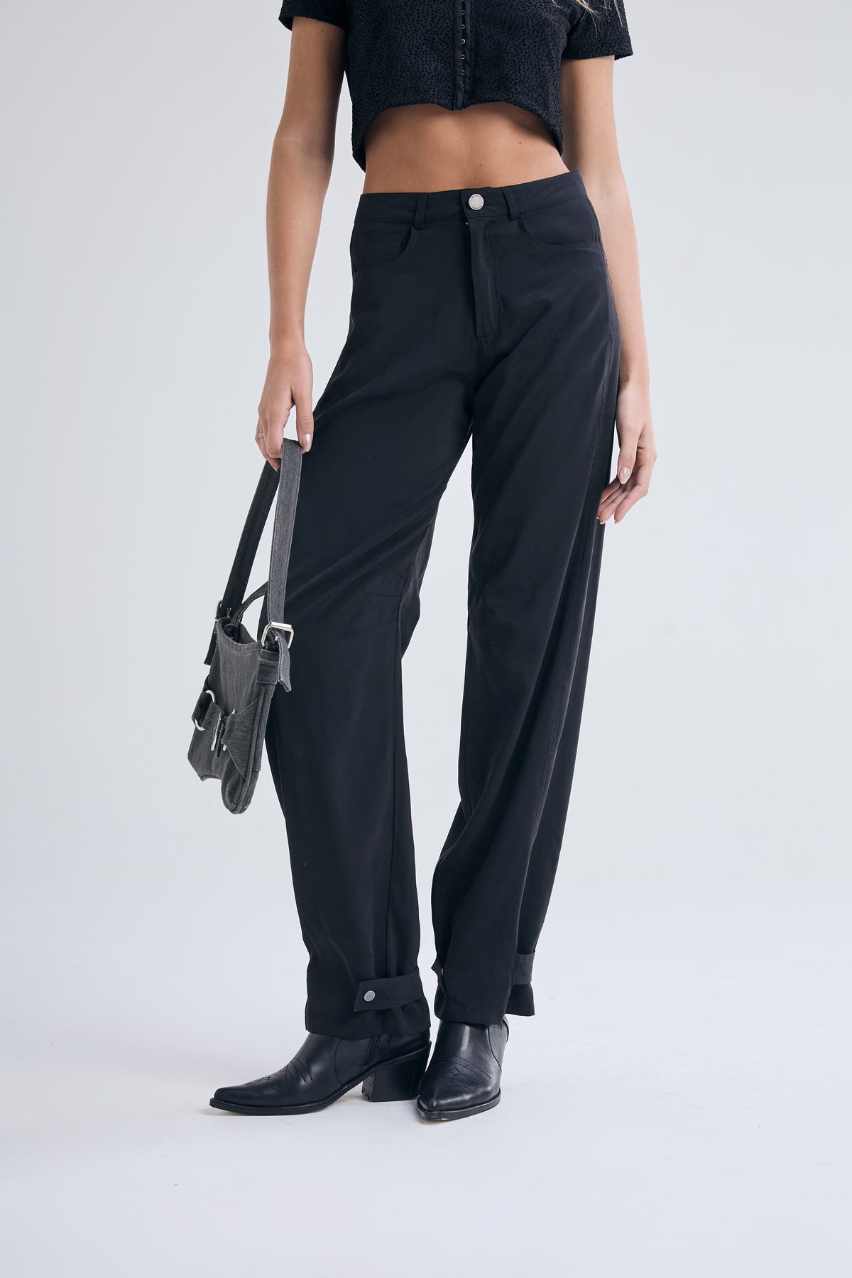 Pantalón corte baloon, color negro, tiro medio. Cintura con pasa cinto, cartera de cierre y botón metálico. Bolsillos delanteros laterales y en espalda tipo plaqué. Pierna con recorte en laterales a lo largo de toda la prenda, por donde sale presilla con broche a presión para ajustar en bota píe. largo hasta el tobillo.