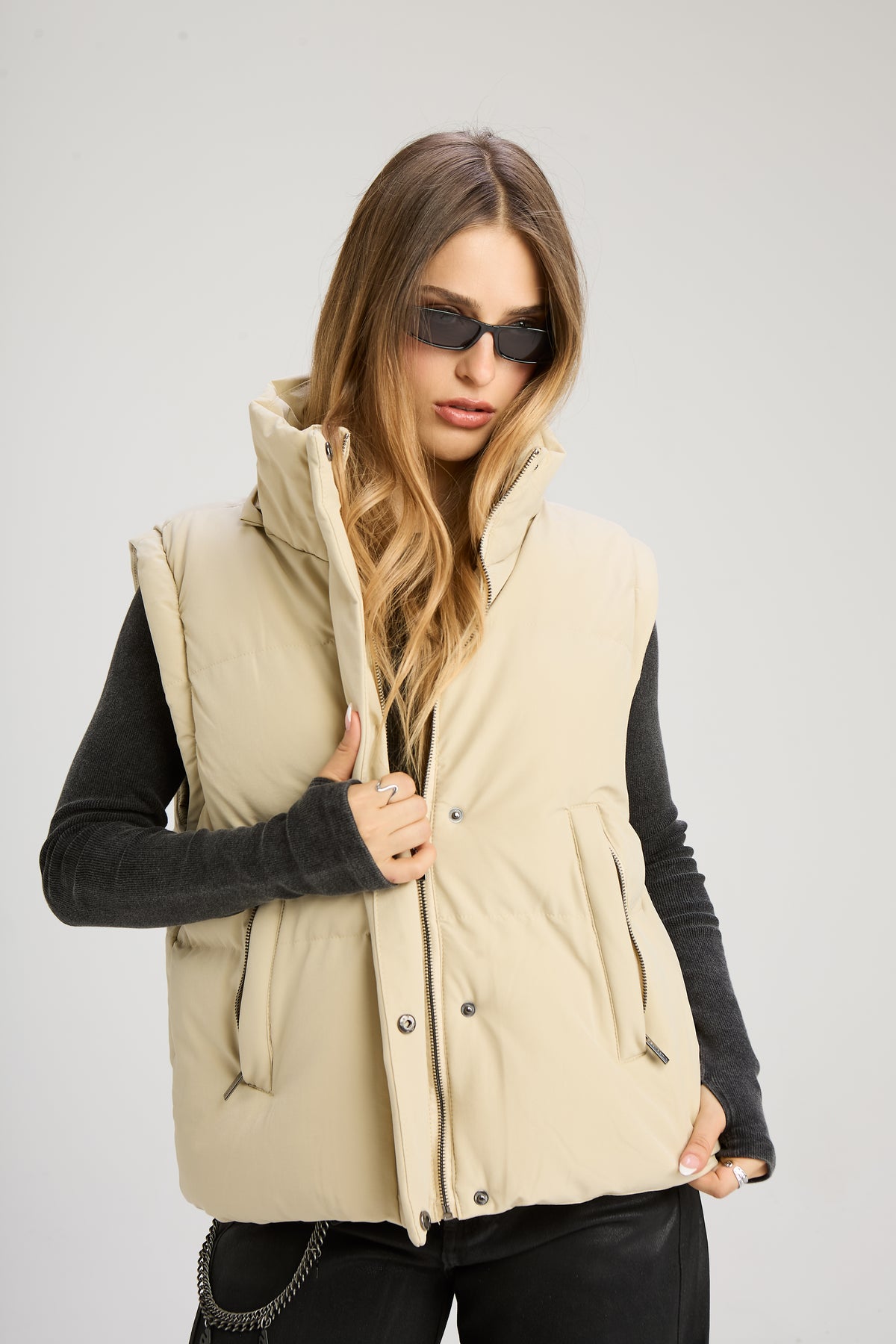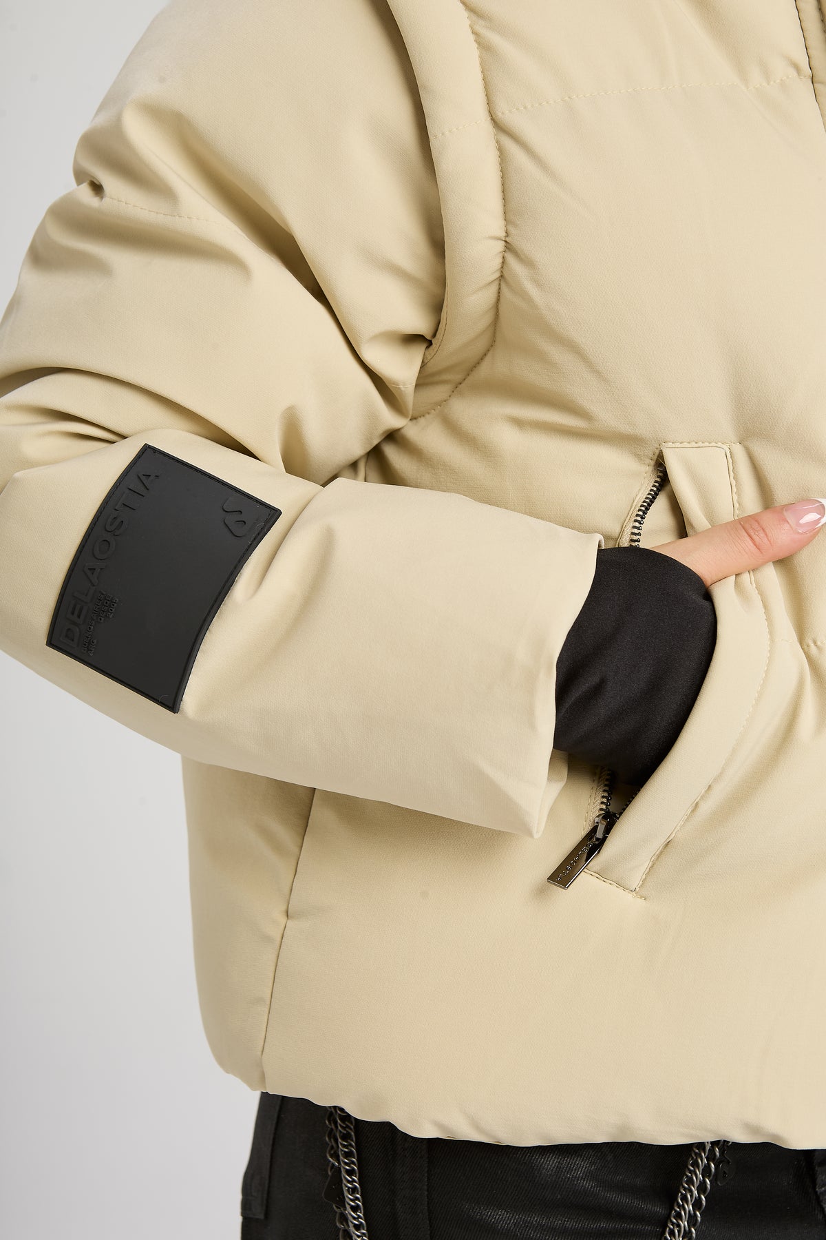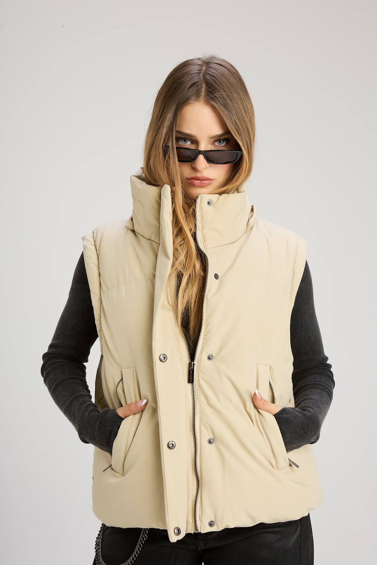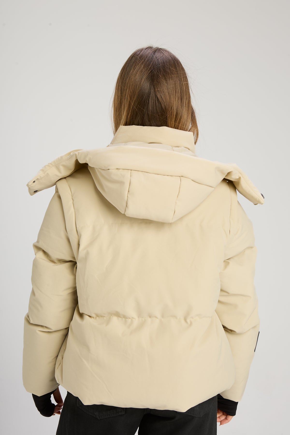 Campera puffer con mangas desmontables, capucha y bolsillos externos e internos. En cintura cuenta con tancas ajustables.