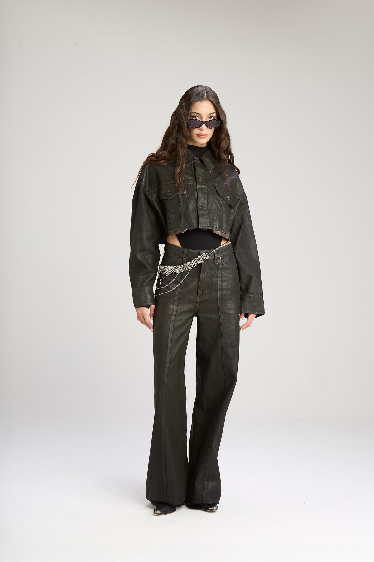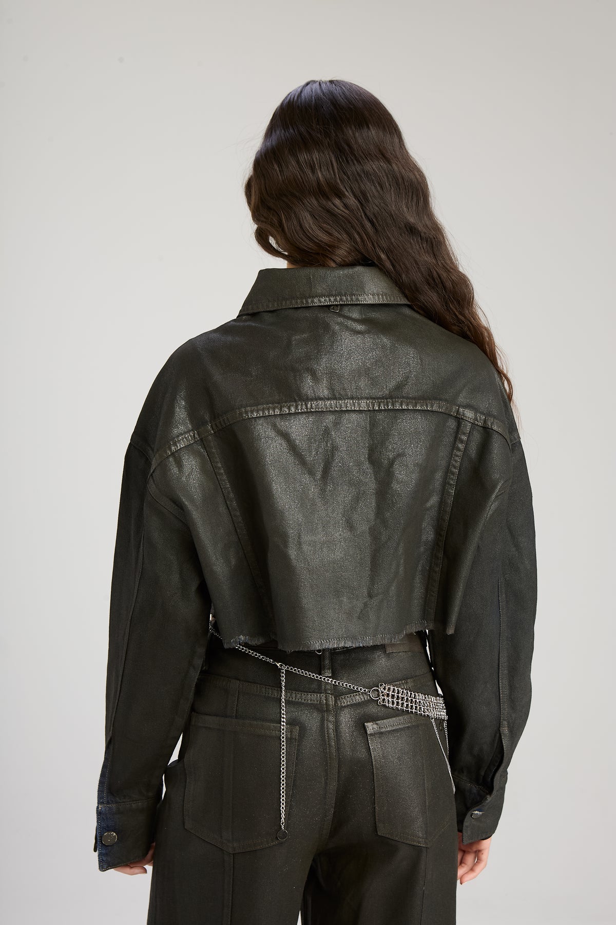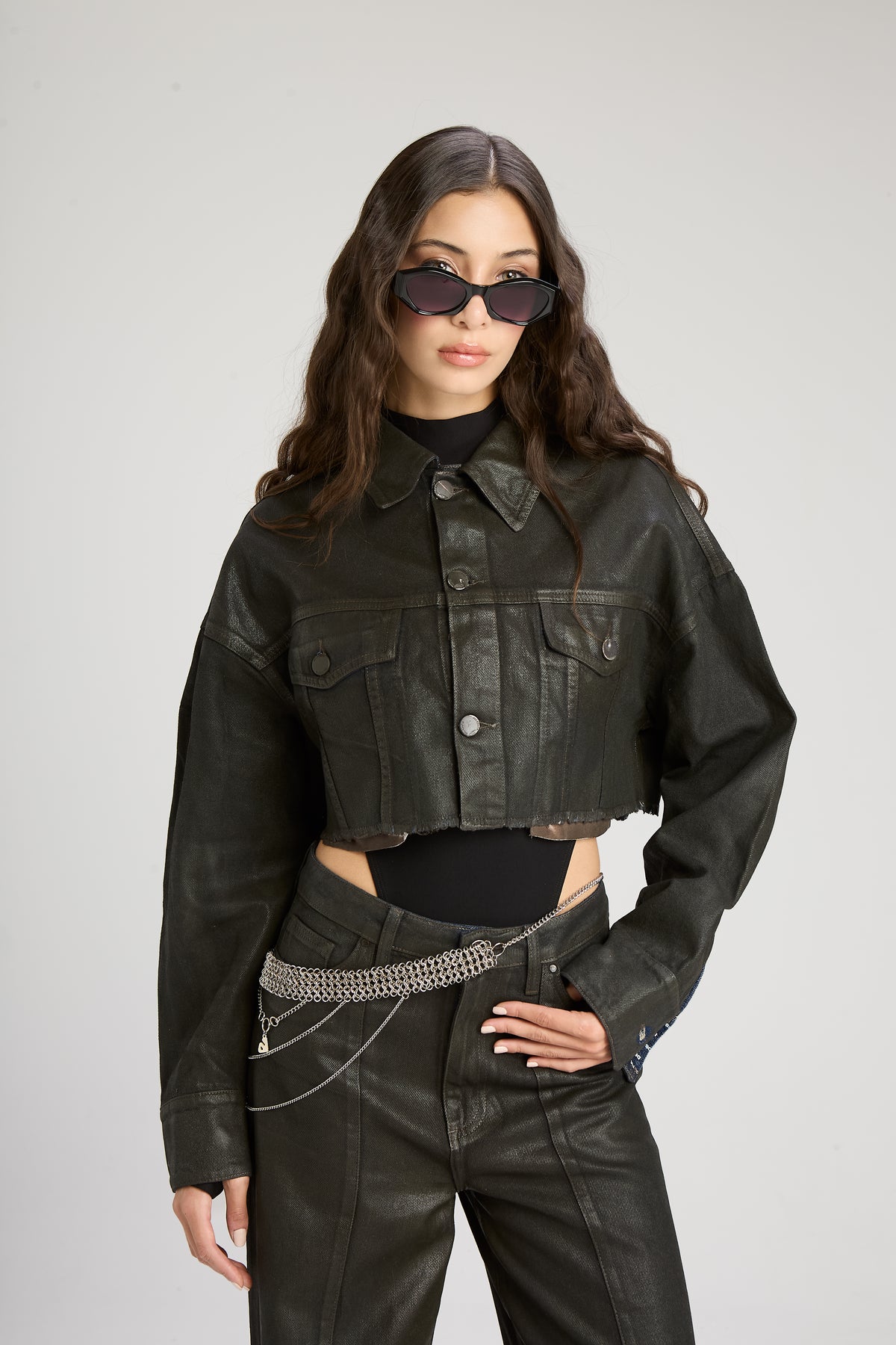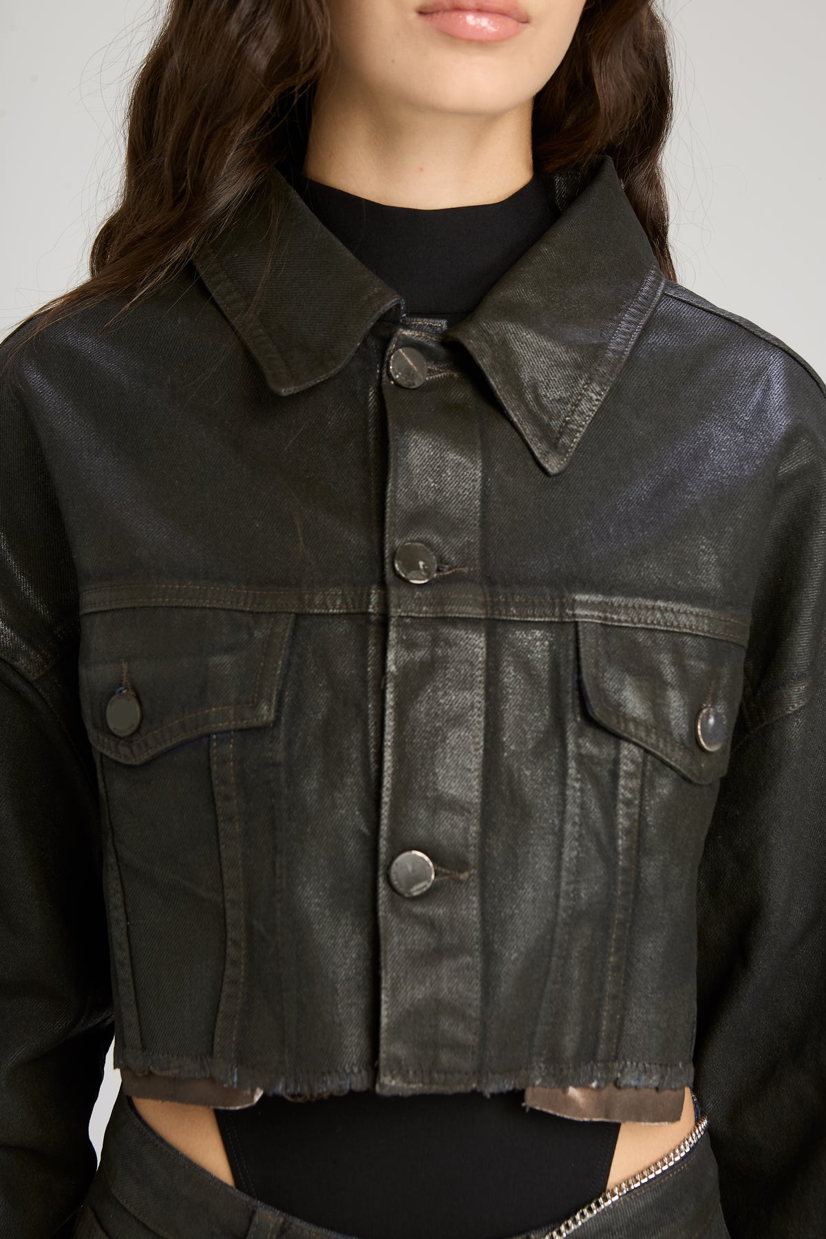 Campera de denim, calce oversized corta. Confeccionado en denim 100% algodón, con un proceso de engomado en color chocolate oscuro. Avíos personalizados y etiqueta tejida en color blanco. Llevalo en conjunto con su pantalón para un total look bien rockstar!