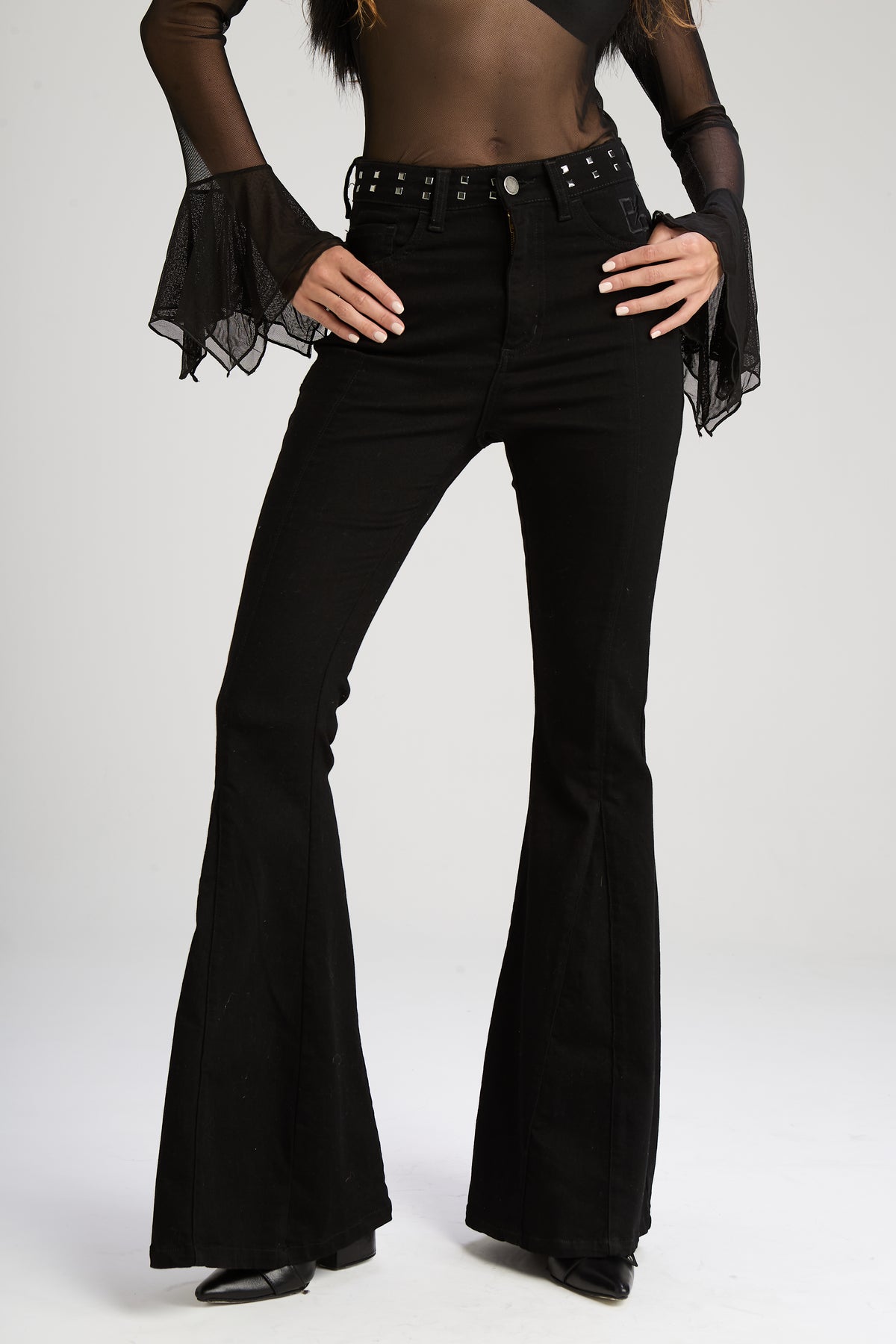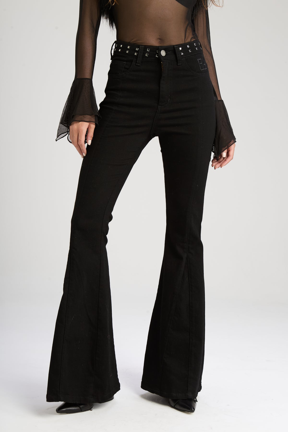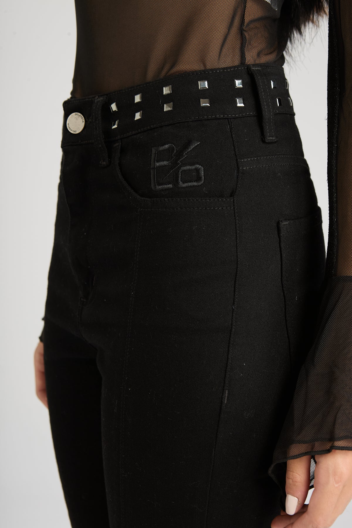 Jean "5 bolsillos", tiro alto corte flair con recortes. Confeccionado en denim 98% algodón y 2% elastano, con un lavado negro pleno. Avíos marcarios en color niquel y detalle de hotfix tipo tacha niquel en cintura y bordado en bolsillo delantero a tono de la prenda.
