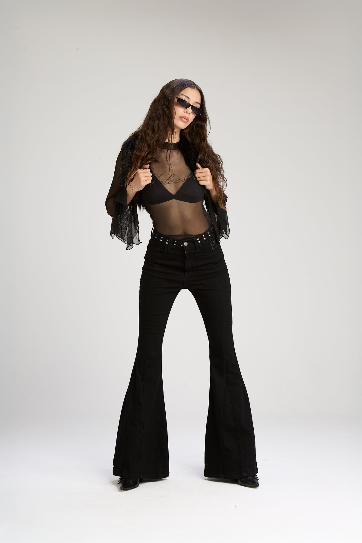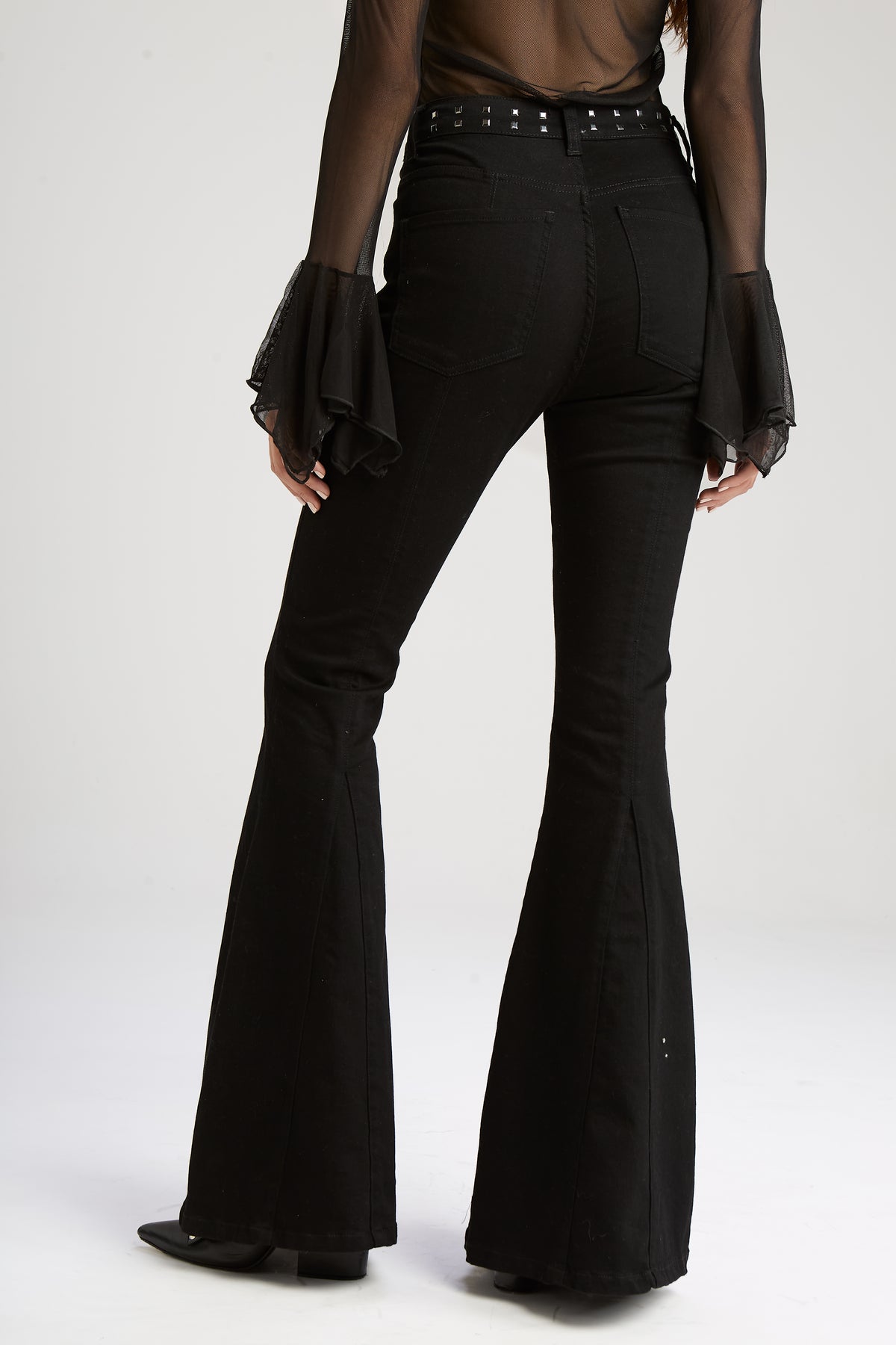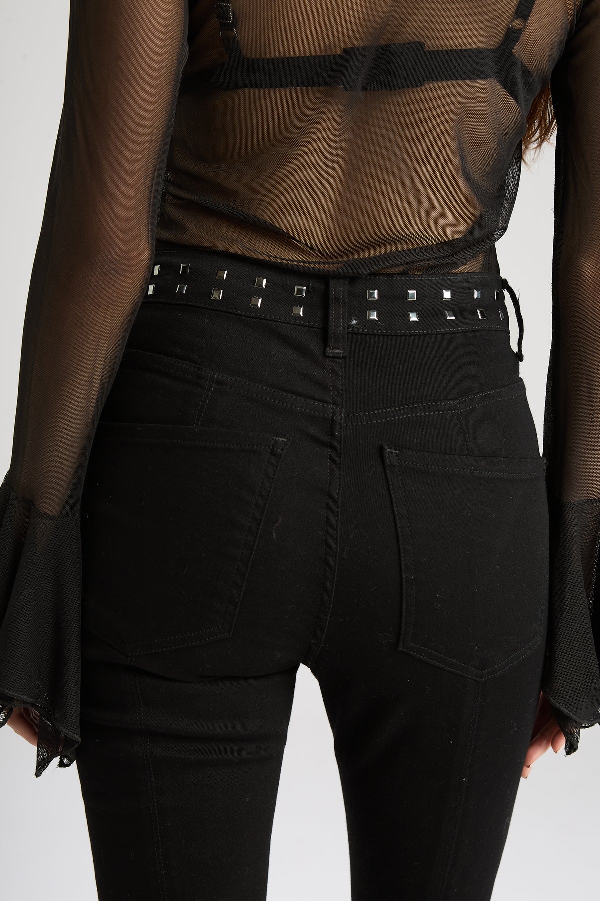 Jean "5 bolsillos", tiro alto corte flair con recortes. Confeccionado en denim 98% algodón y 2% elastano, con un lavado negro pleno. Avíos marcarios en color niquel y detalle de hotfix tipo tacha niquel en cintura y bordado en bolsillo delantero a tono de la prenda.