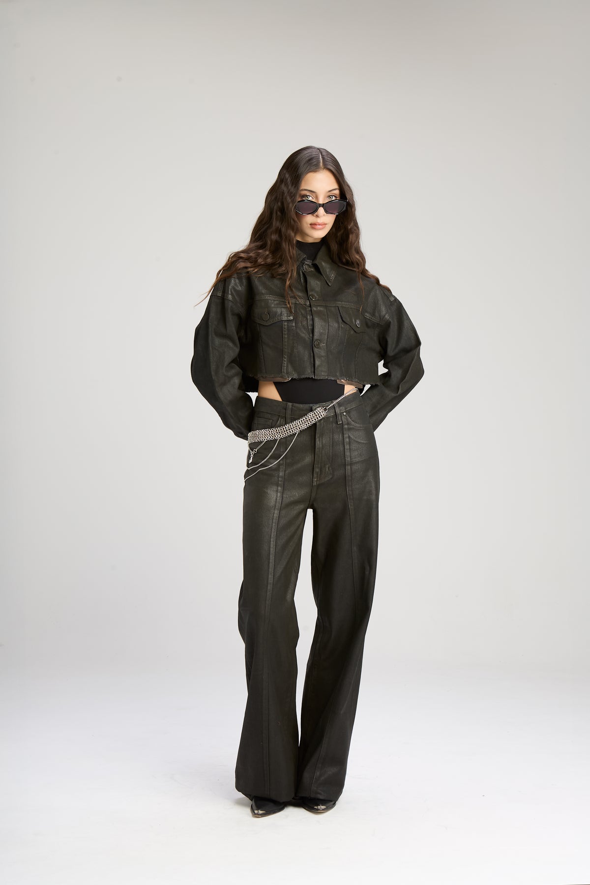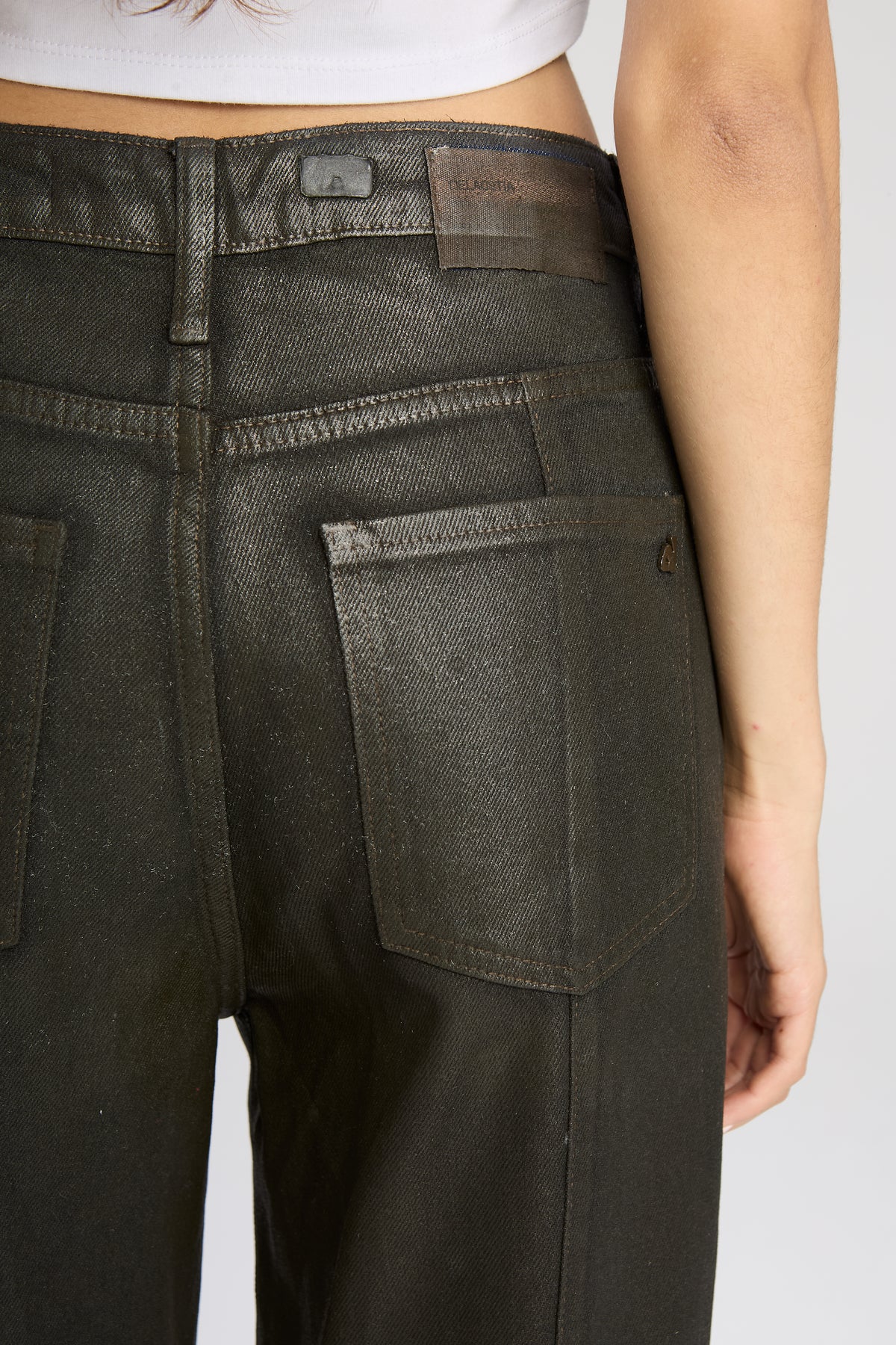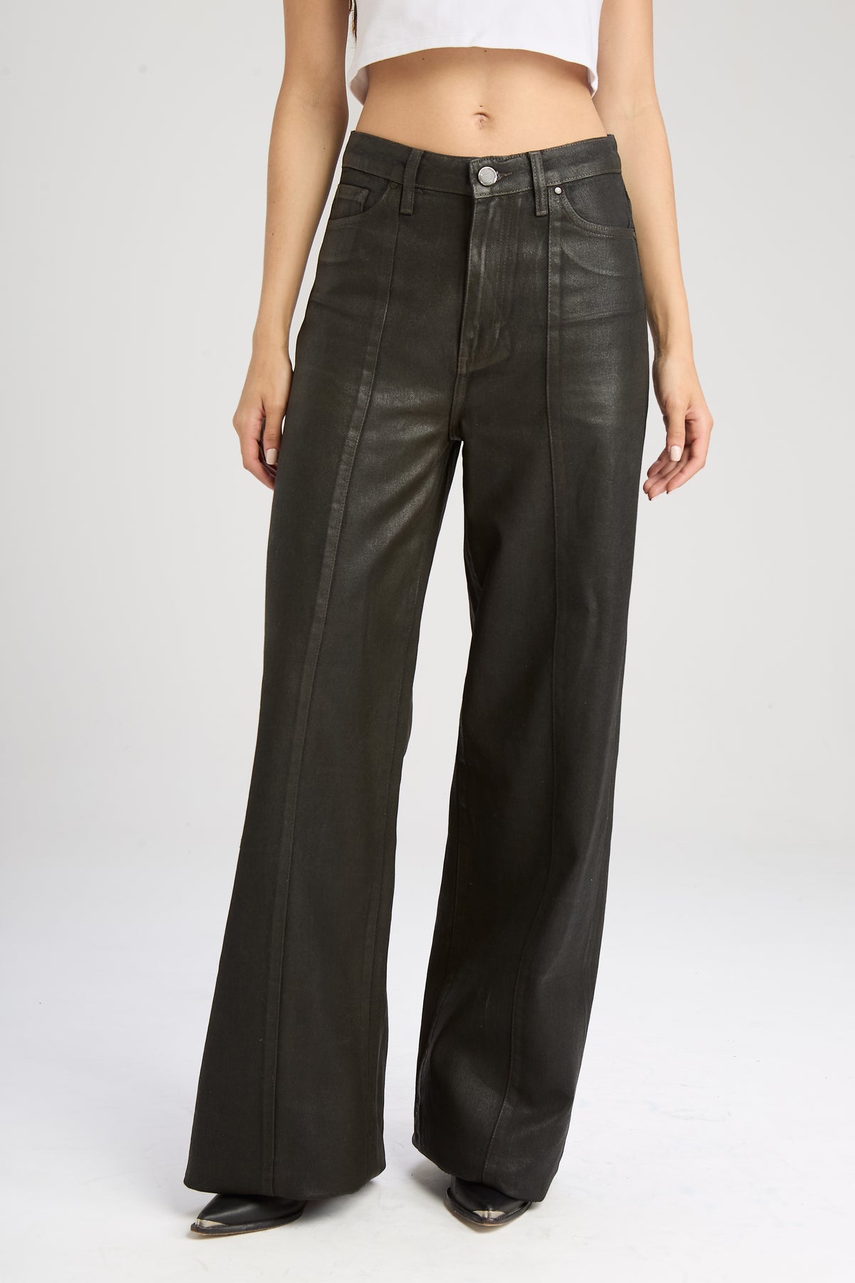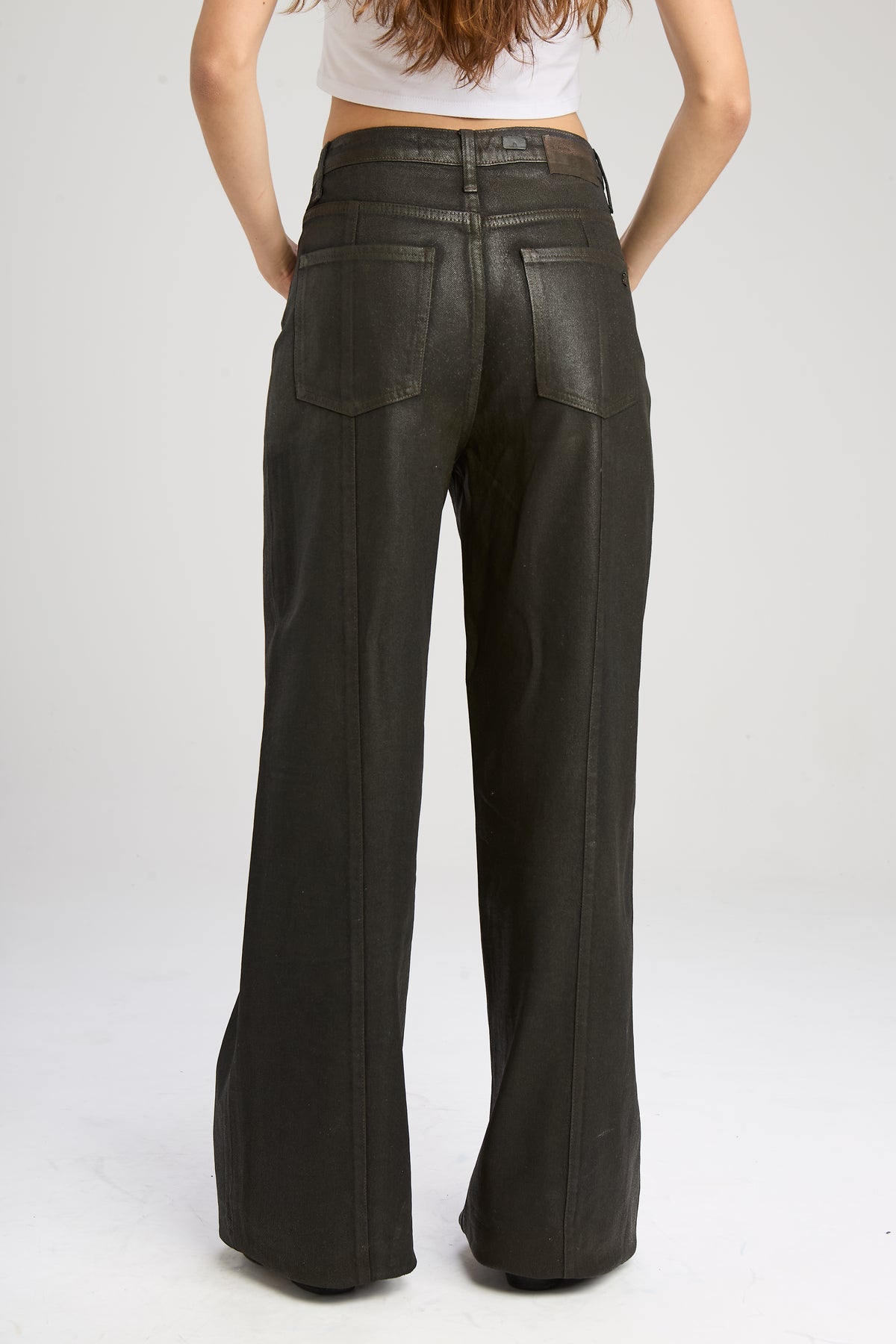 Jean "5 bolsillos", tiro medio corte wide leg. Confeccionado en denim 100% algodón, con un proceso de engomado en color chocolate oscuro.