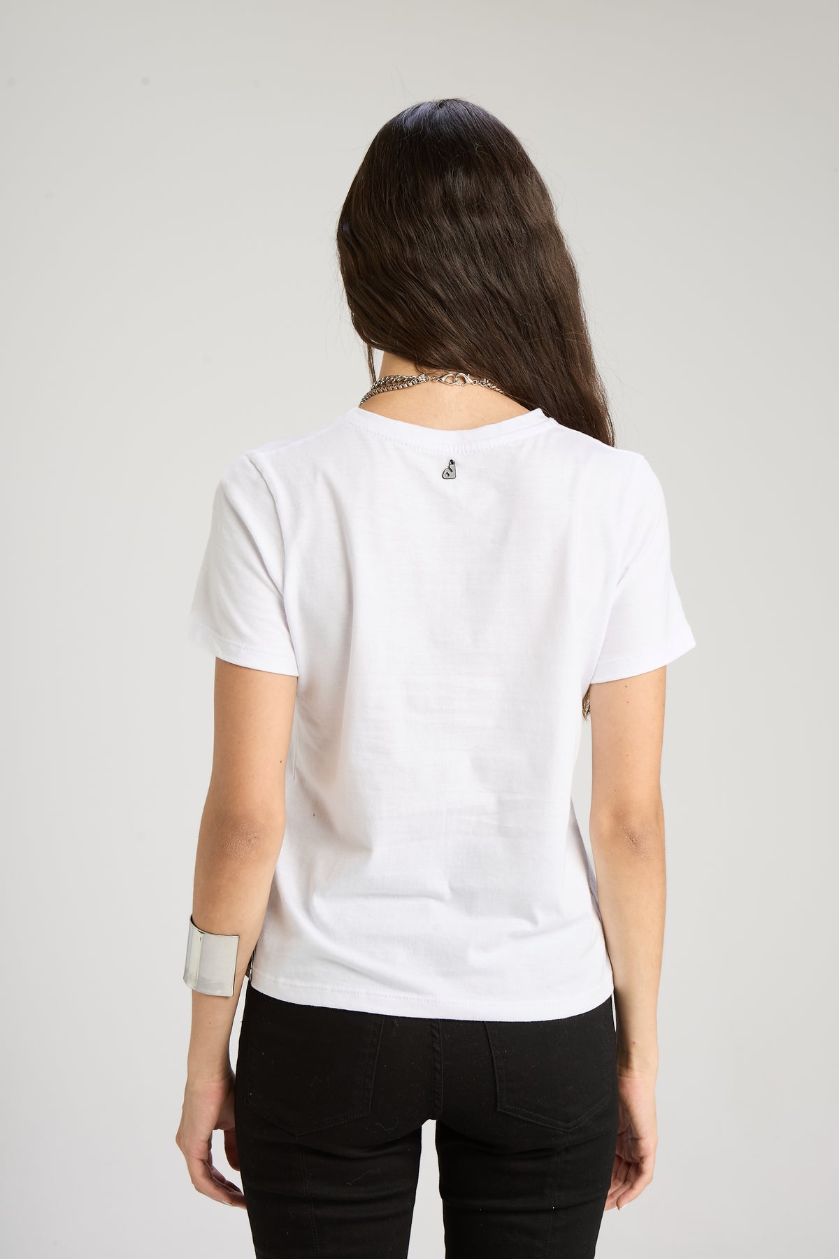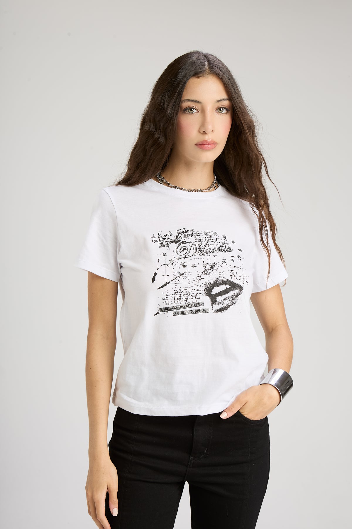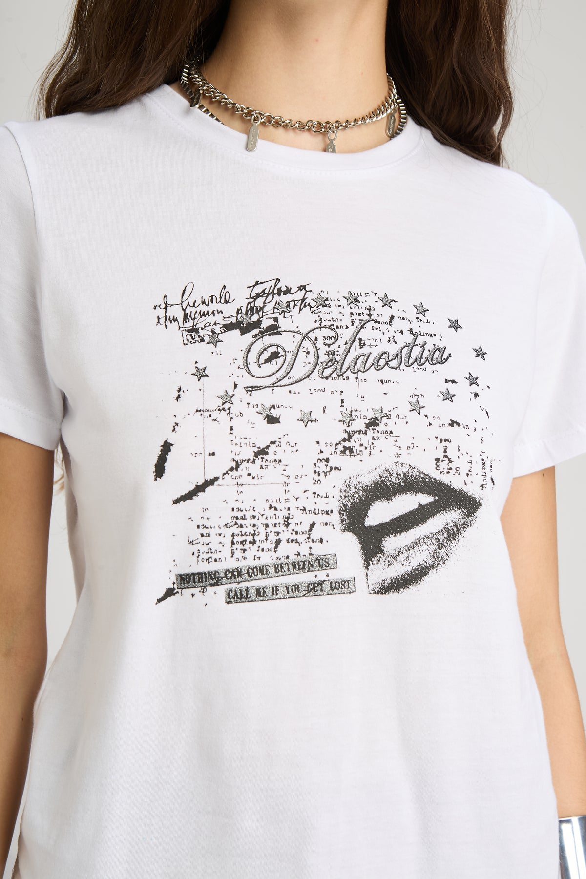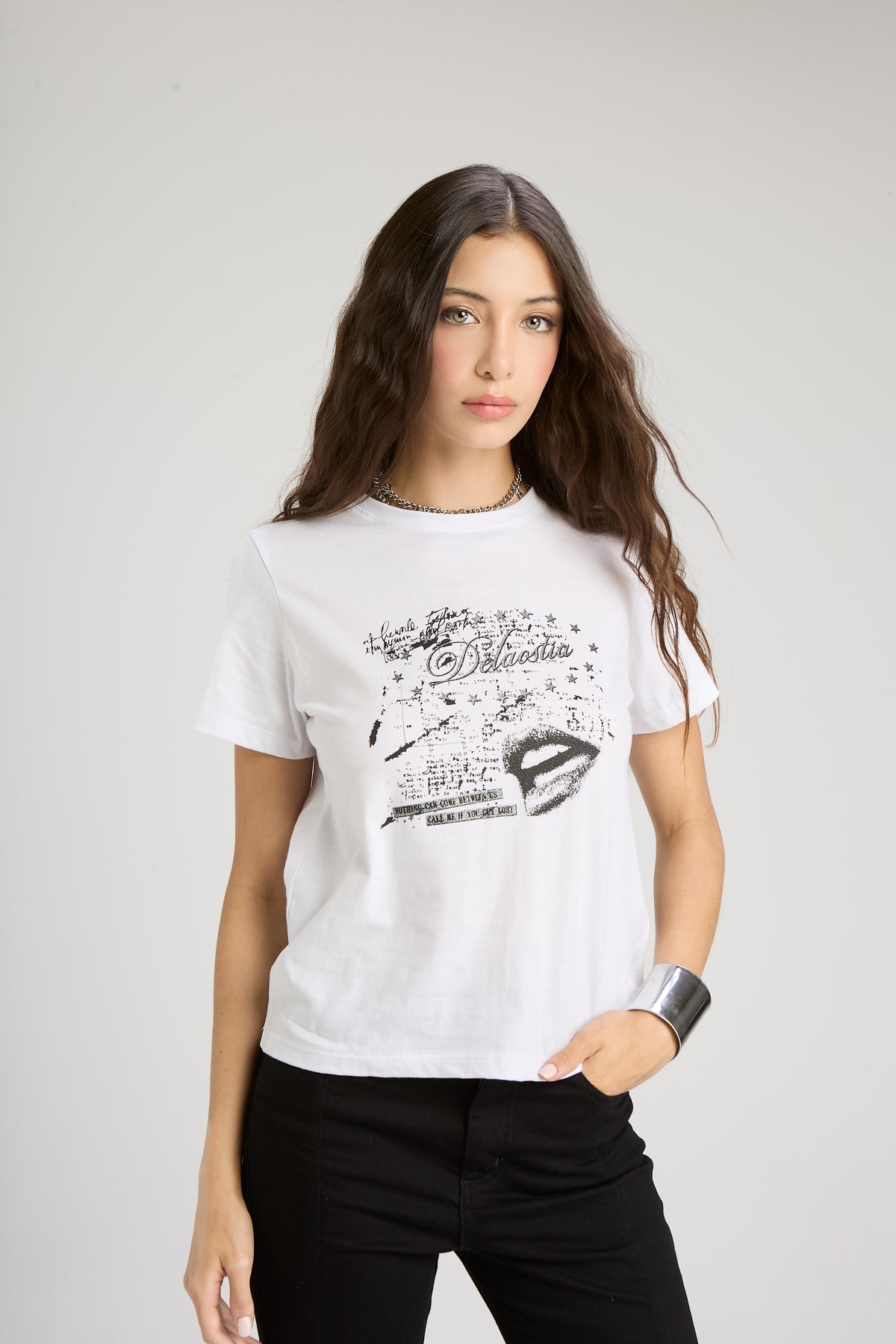 Remera de jersey de algodon blanca, calce regular, cuello base con manga corta. Detalle de estampa ilustrada negra con glitter en delantero. Calce regular y largo a la primer cadera. Conseguila en negro lavado y blanco.