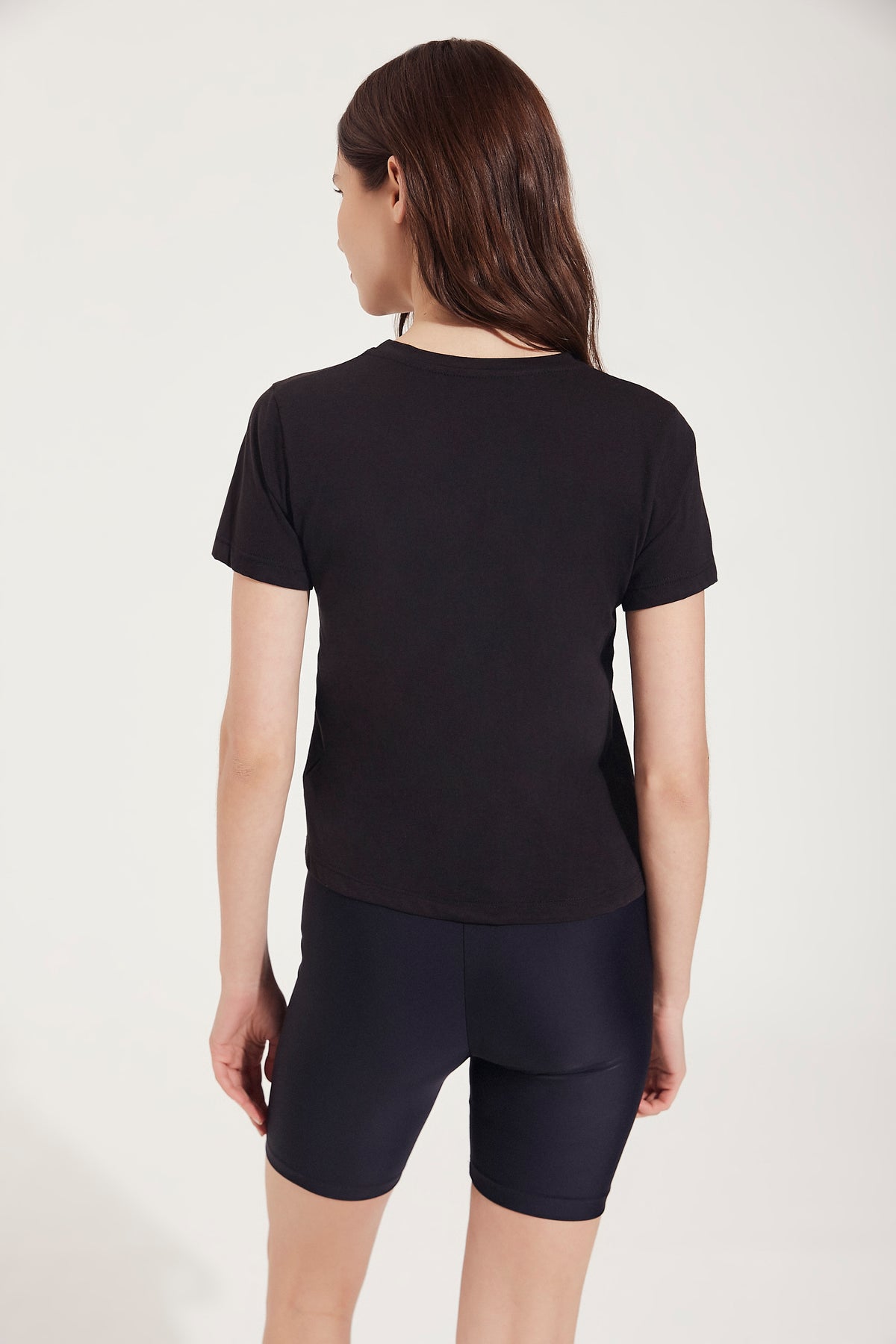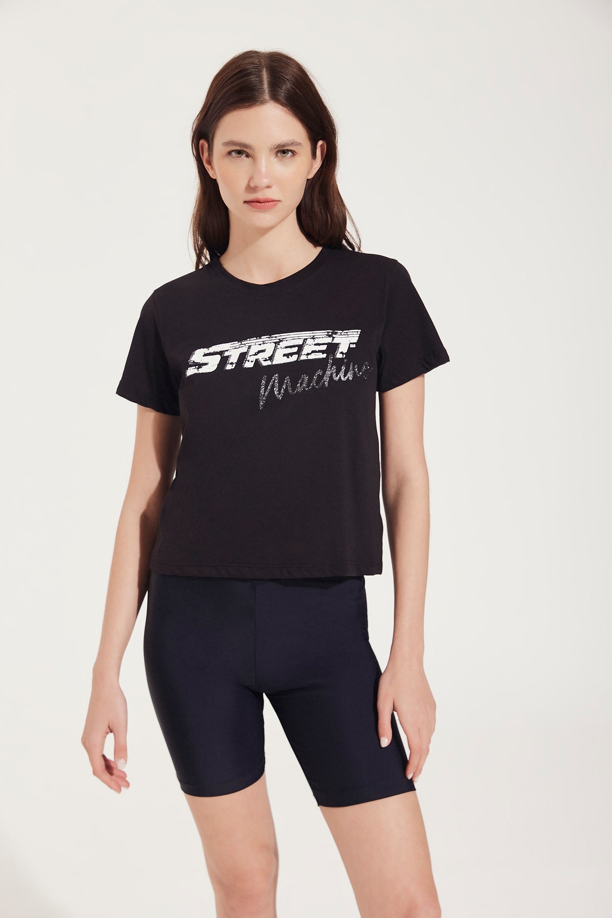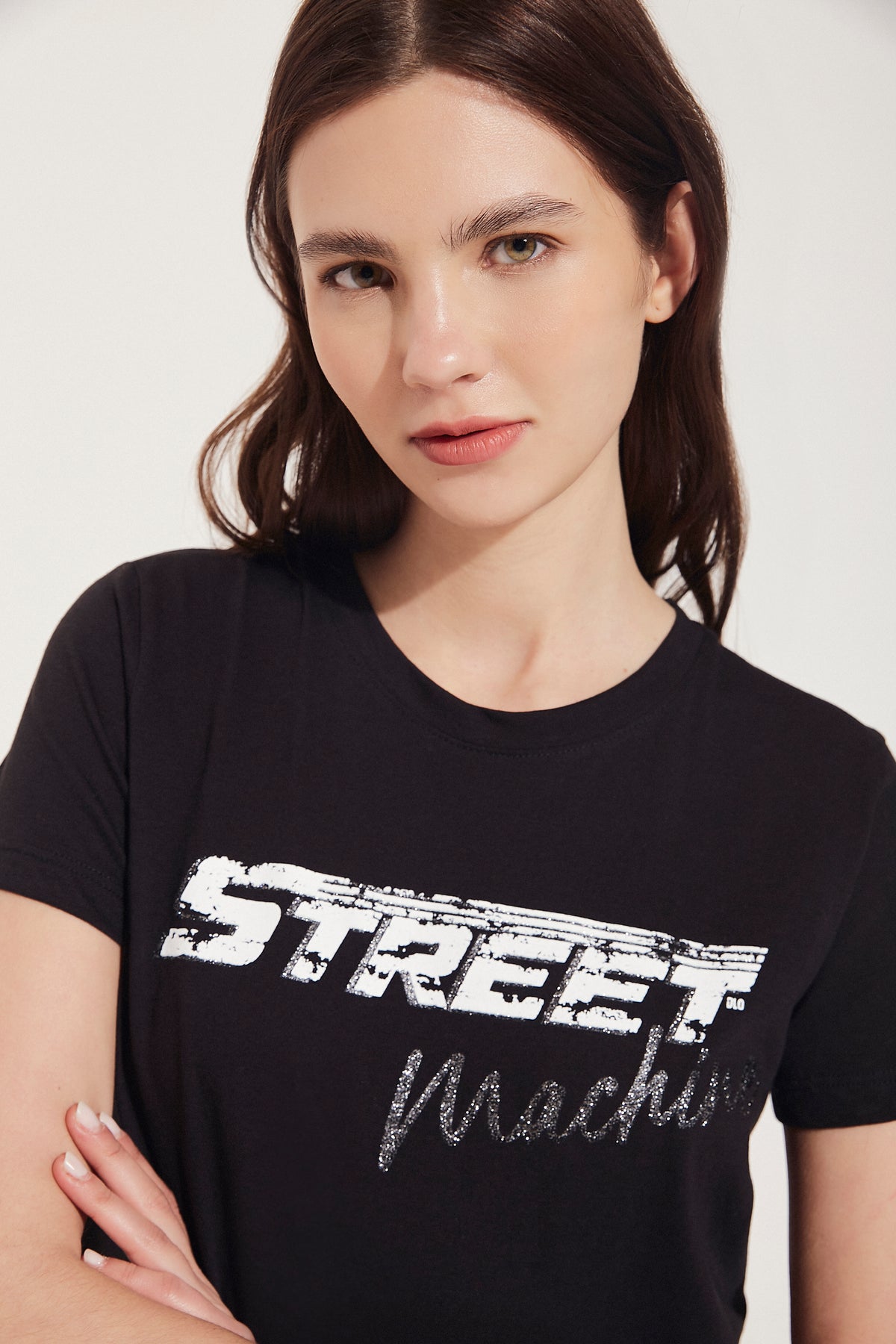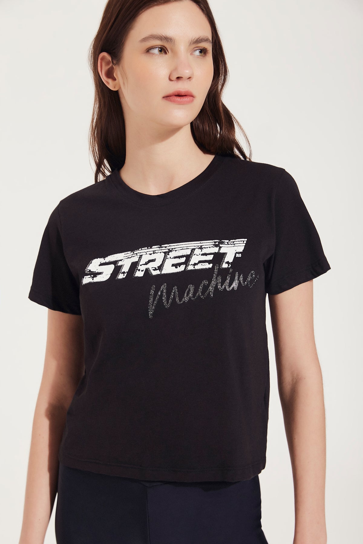 Remera de jersey manga corta cuello redondo con estampa en delantero. Silueta regular. Largo modular hasta cadera.
