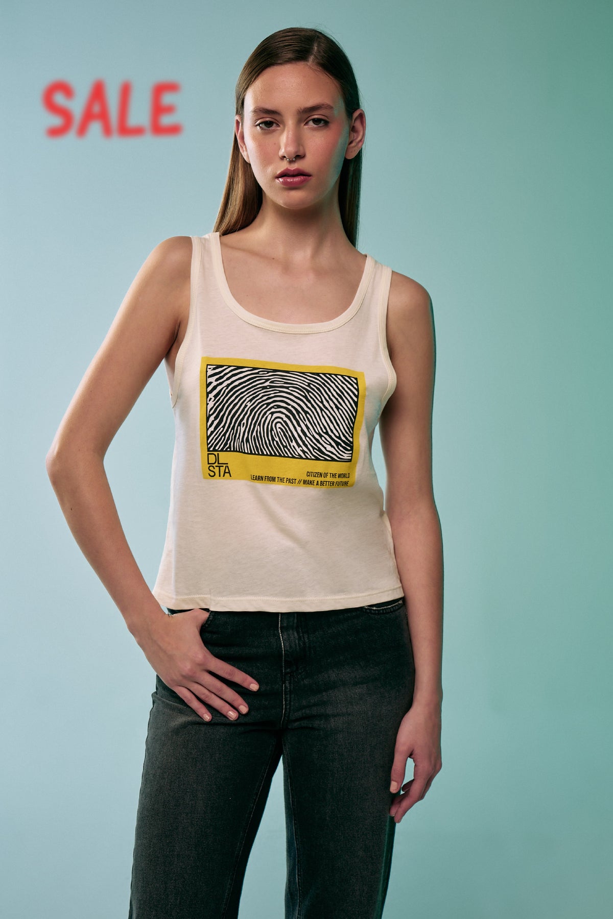 Musculosa de jersey escote redondo con estampa en delantero. Silueta regular. Largo modular hasta cadera.