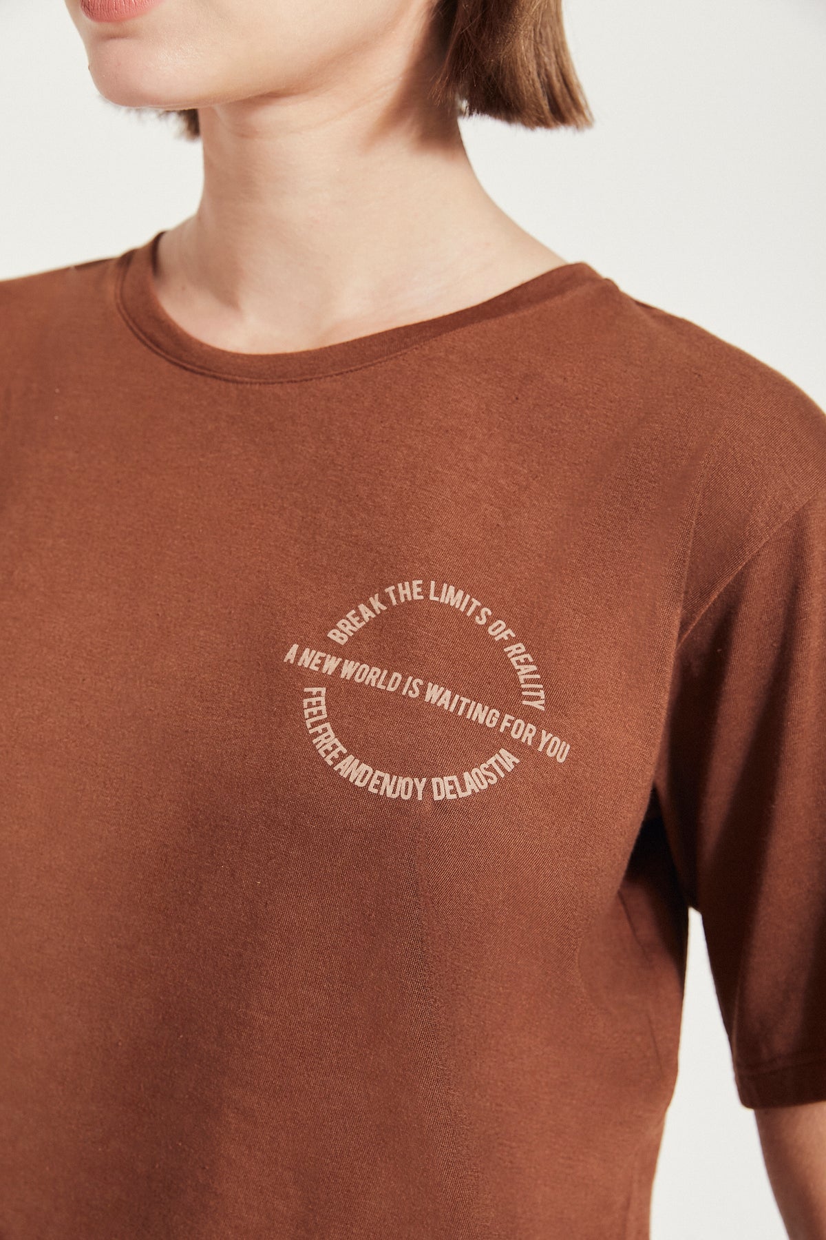 Remera de jersey manga corta cuello redondo con estampa en delantero. Silueta crop. Largo modular hasta primer cadera.