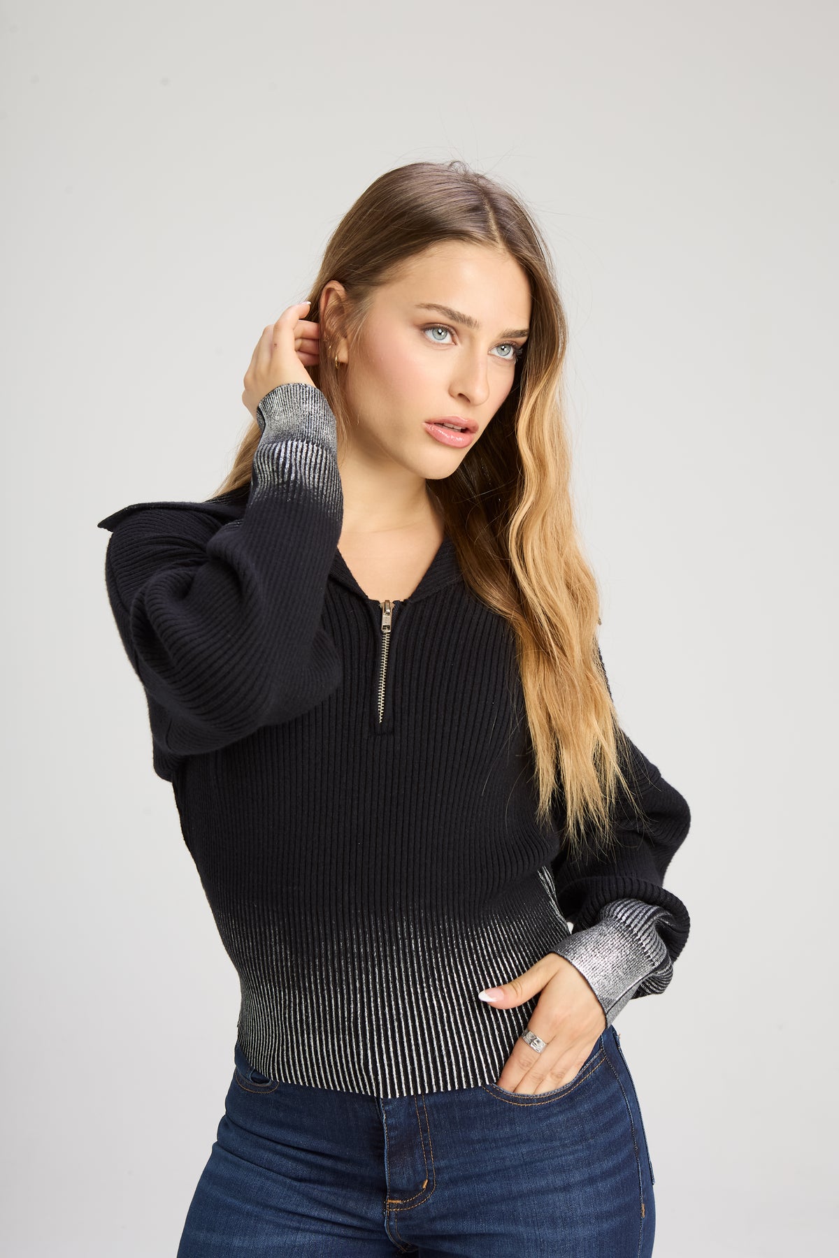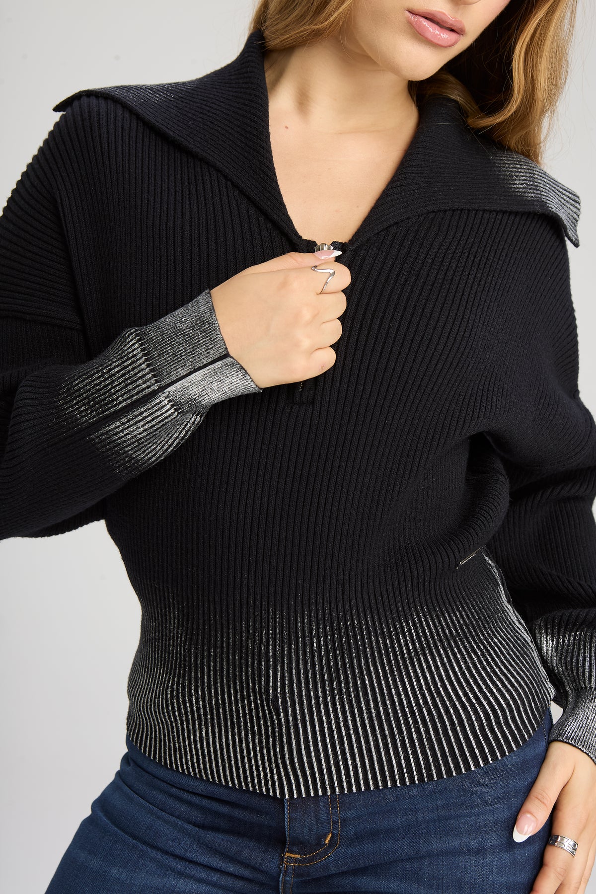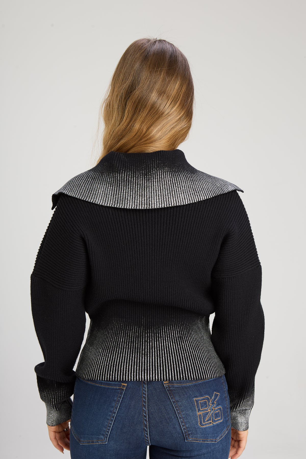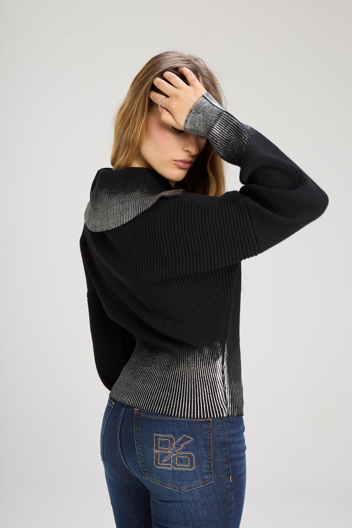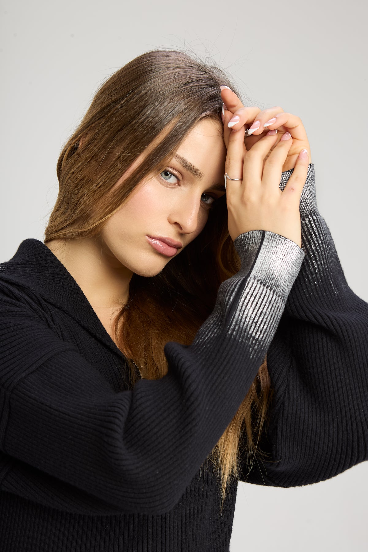 Sweater de viscosa y algodon con cuello amplio y cierre, cuenta con una silueta despega del cuerpo, Tanto en mangas como en cintura el sweater lleva un proceso de foil en color plata muy sutil en fomra lineal, este proceso es 100% artesanal.