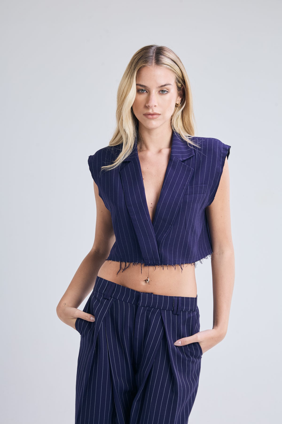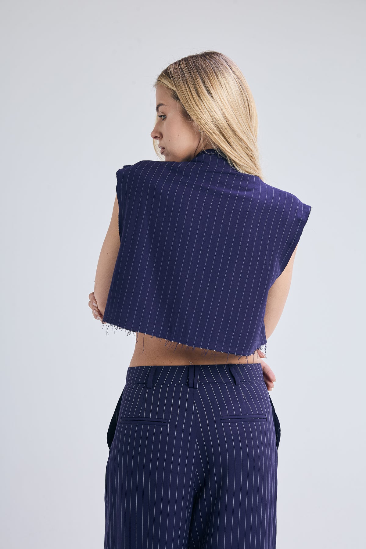 Chaleco sastrero rayado color azul marino, calce holgado, largo por la cintura. Cuenta con cuello solapa y sin mangas. La prenda viene forrada. Detalle de terminaciones al corte y prendedor personalizado institucional en cuello solapa. Acceso a la prenda mediante botón escondido en frente. Llevalo en conjunto con su pantalón o short!
