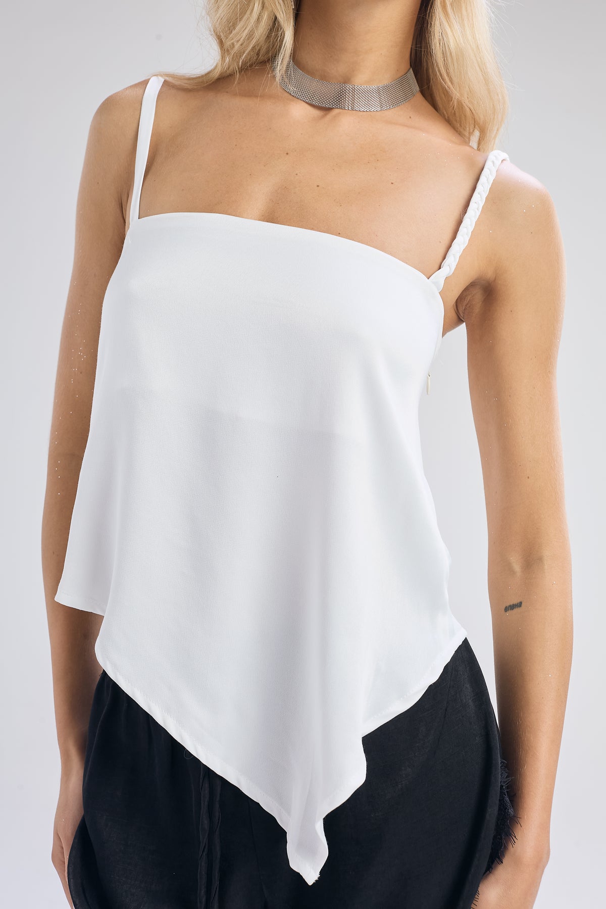 Top de satén color off white, calce recto y largo a la cadera. Top tipo bandó simulando pañuelo, por ende tiene una forma triangular o de pico en la parte del ruedo delantero. Posee breteles en tela base, uno liso y otro trenzado.