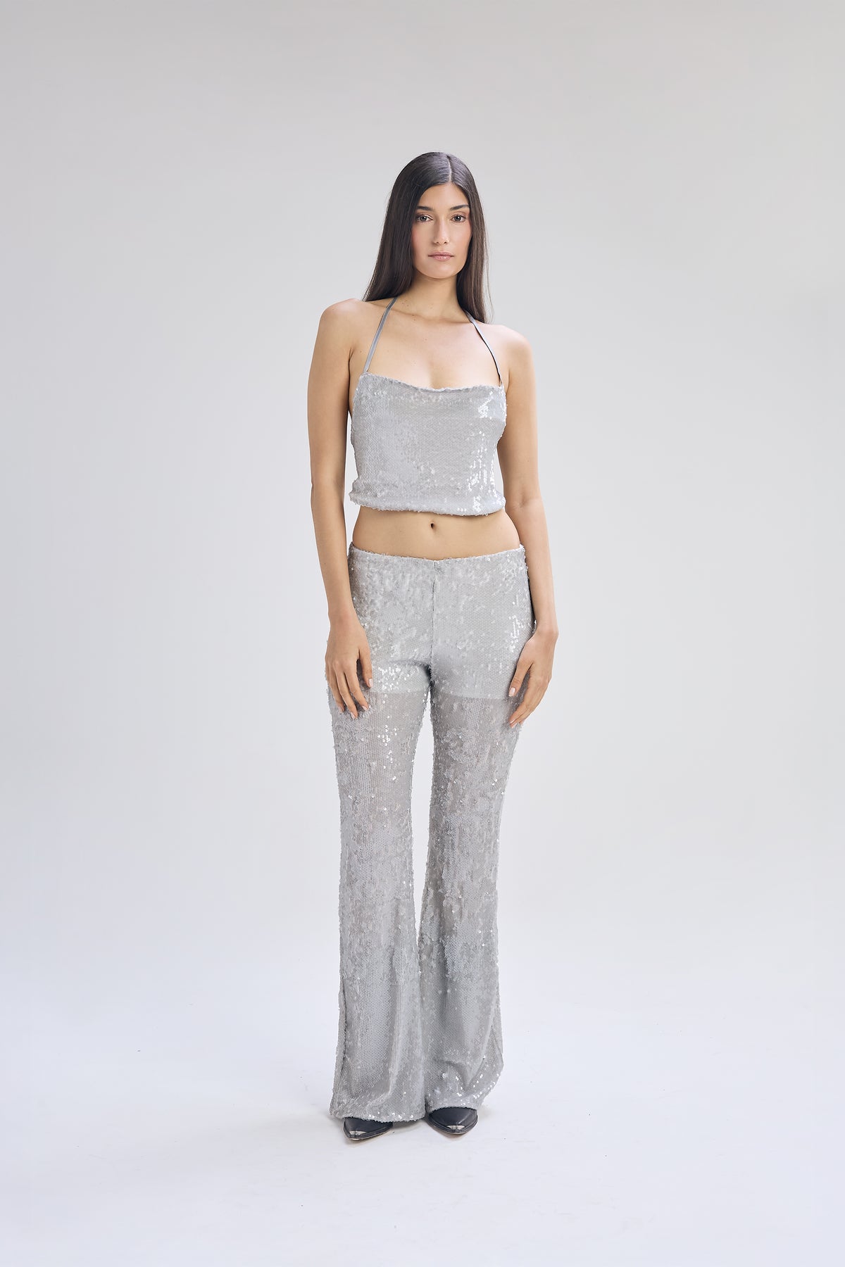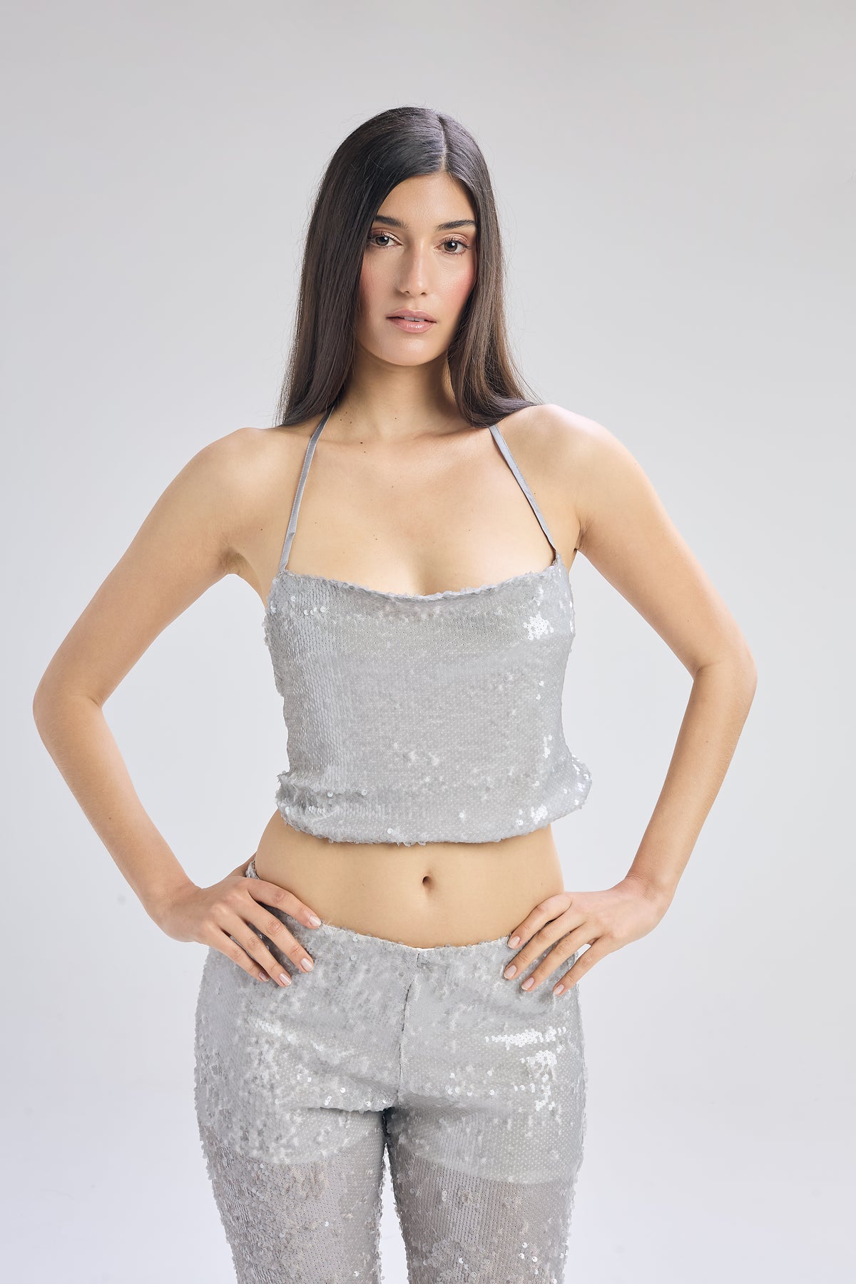Top de lentejuelas gris con un brillo sutil, calce al cuerpo, largo a la cintura y espalda descubierta. Se destaca por el brillo sutil y efecto visual del textil. Llévalo en conjunto con su pantalón o short!