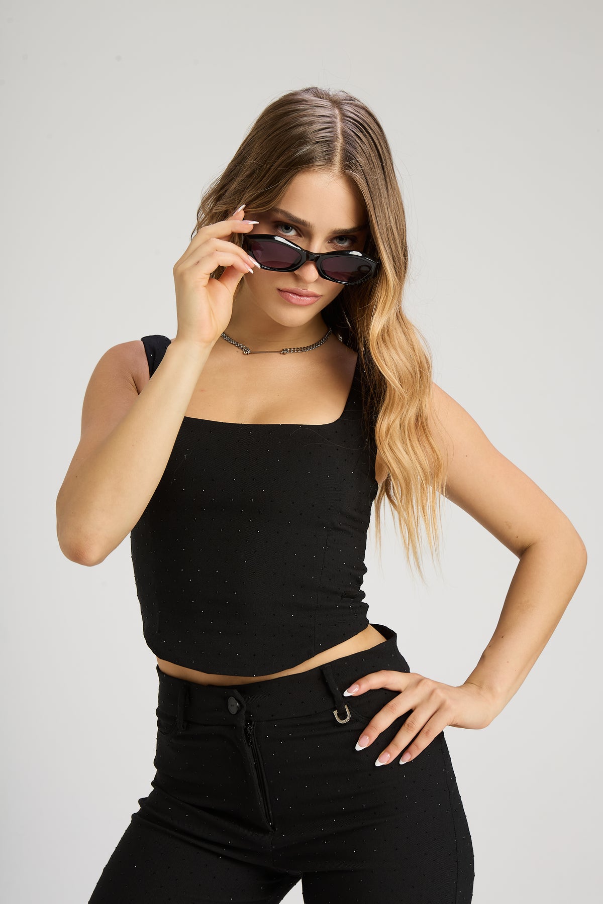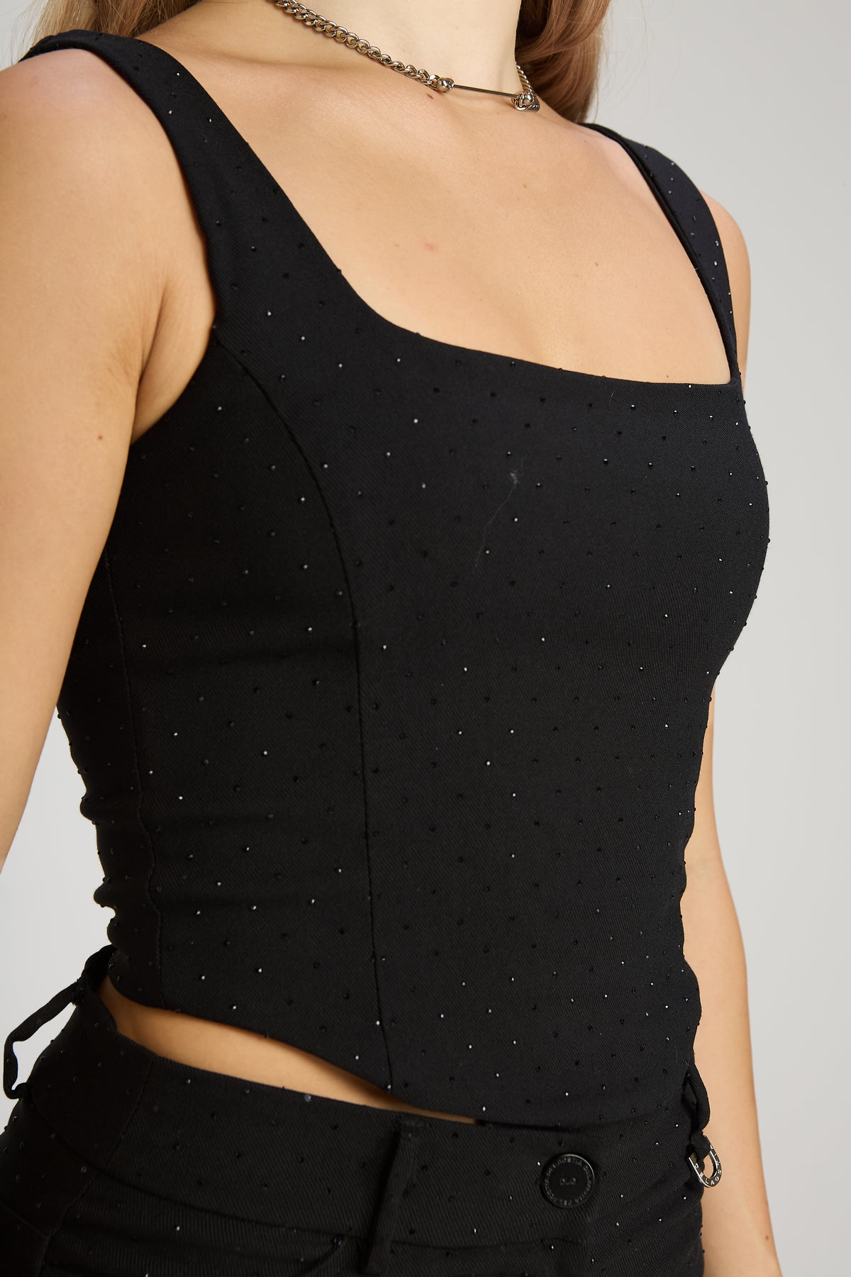 Top de bengalina con hotfix de strass, calce al cuerpo estilo corsetero marcando y acompañando la silueta. Escote recto con breteles anchos. Acceso por tira corsetera en espalda. Top con calce al cuerpo y largo por debajo de la cintura. Viene con su Pantalón y Camisaco en conjunto.