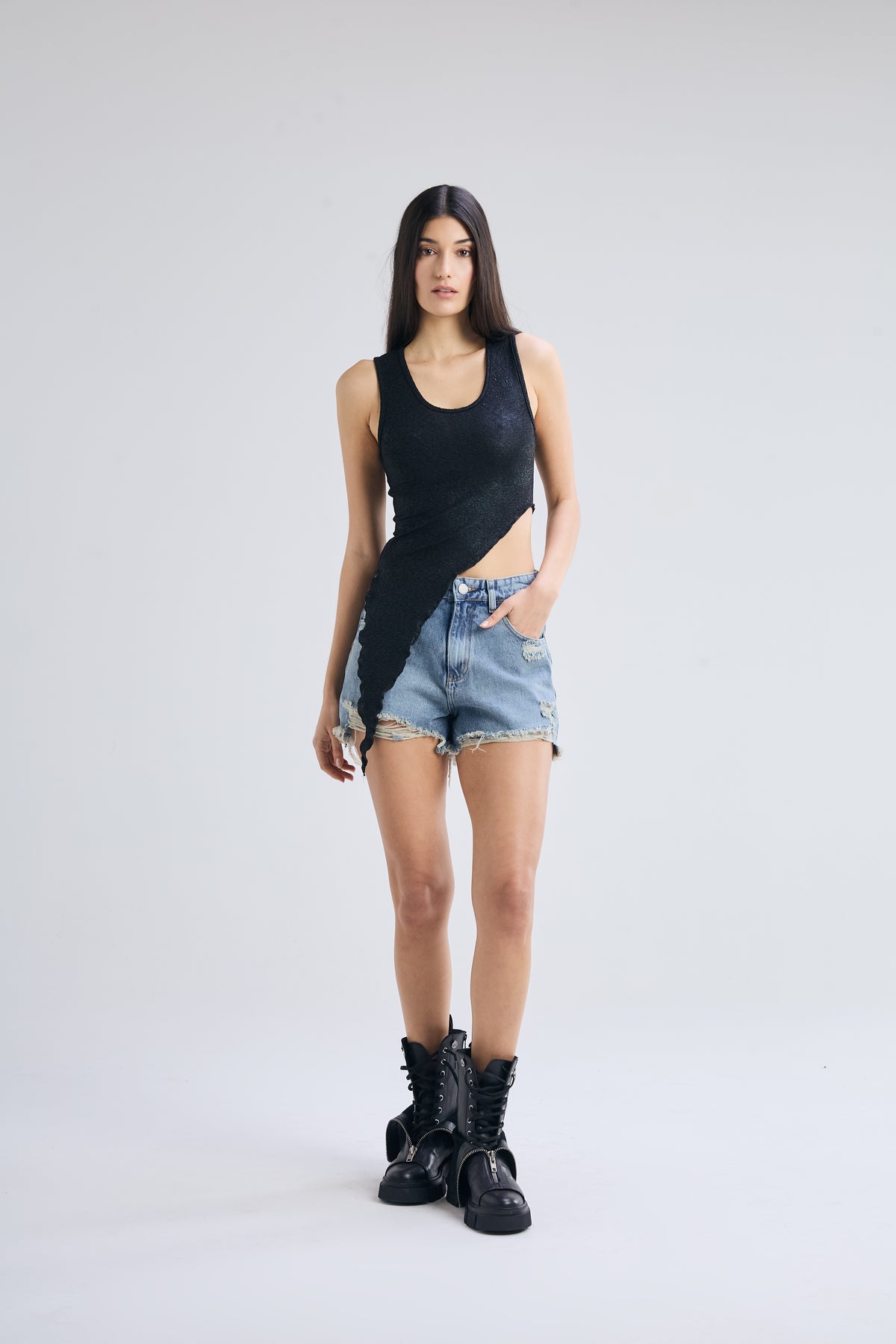 Top musculosa, color negro con brillos de lurex, calce al cuerpo y largo asimétrico hasta 2° cadera. Musculosa con cuello a la base y escote redondo, con pico asimétrico que recorre la mitad del cuerpo desde la cintura hacia abajo de la 2°da cadera.
