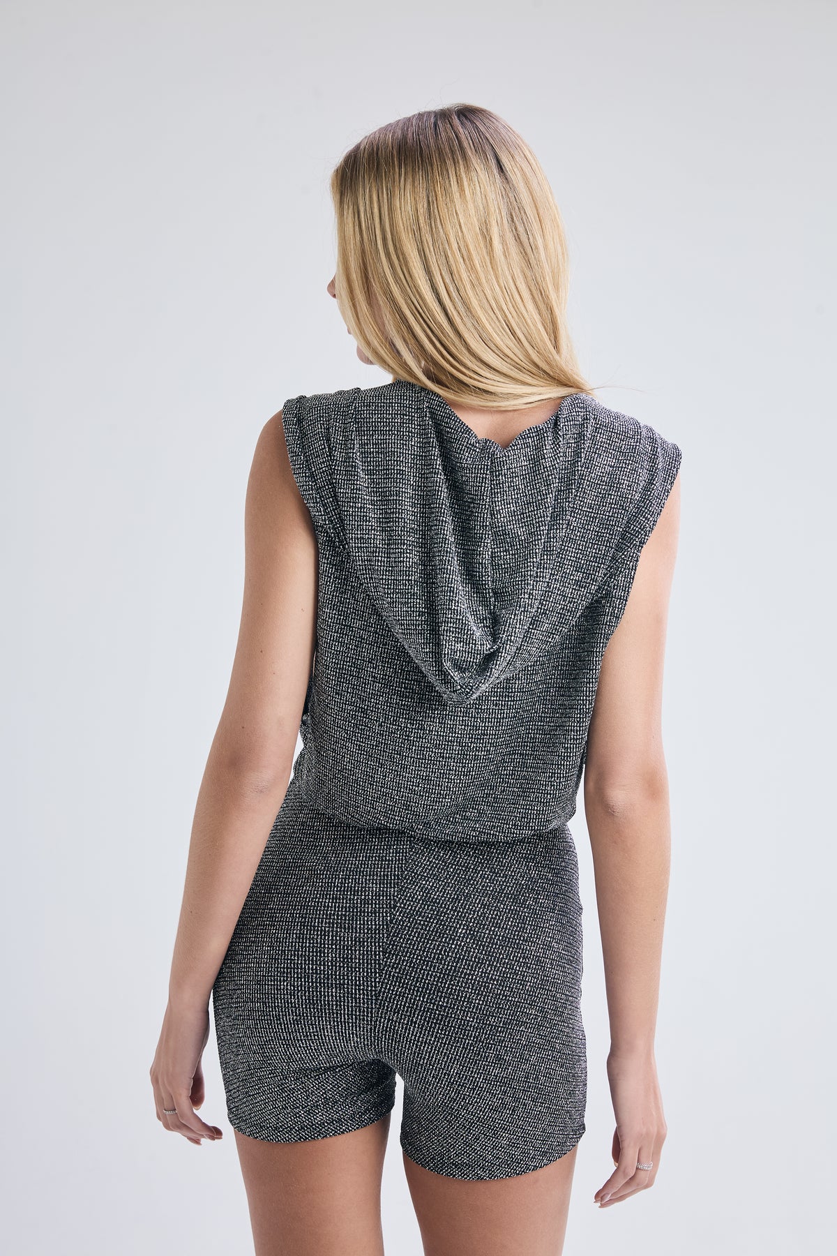 Mono corto de lurex color plata, calce holgado en torso y fit a partir de la cintura. Escote en v, capucha y sin mangas. Detalle de acceso por broche a presión en centro de escote.