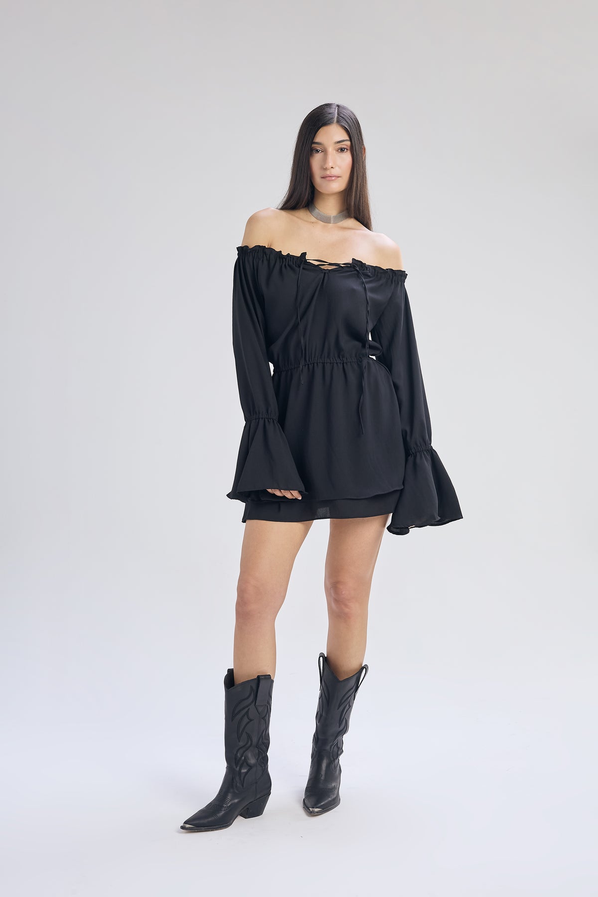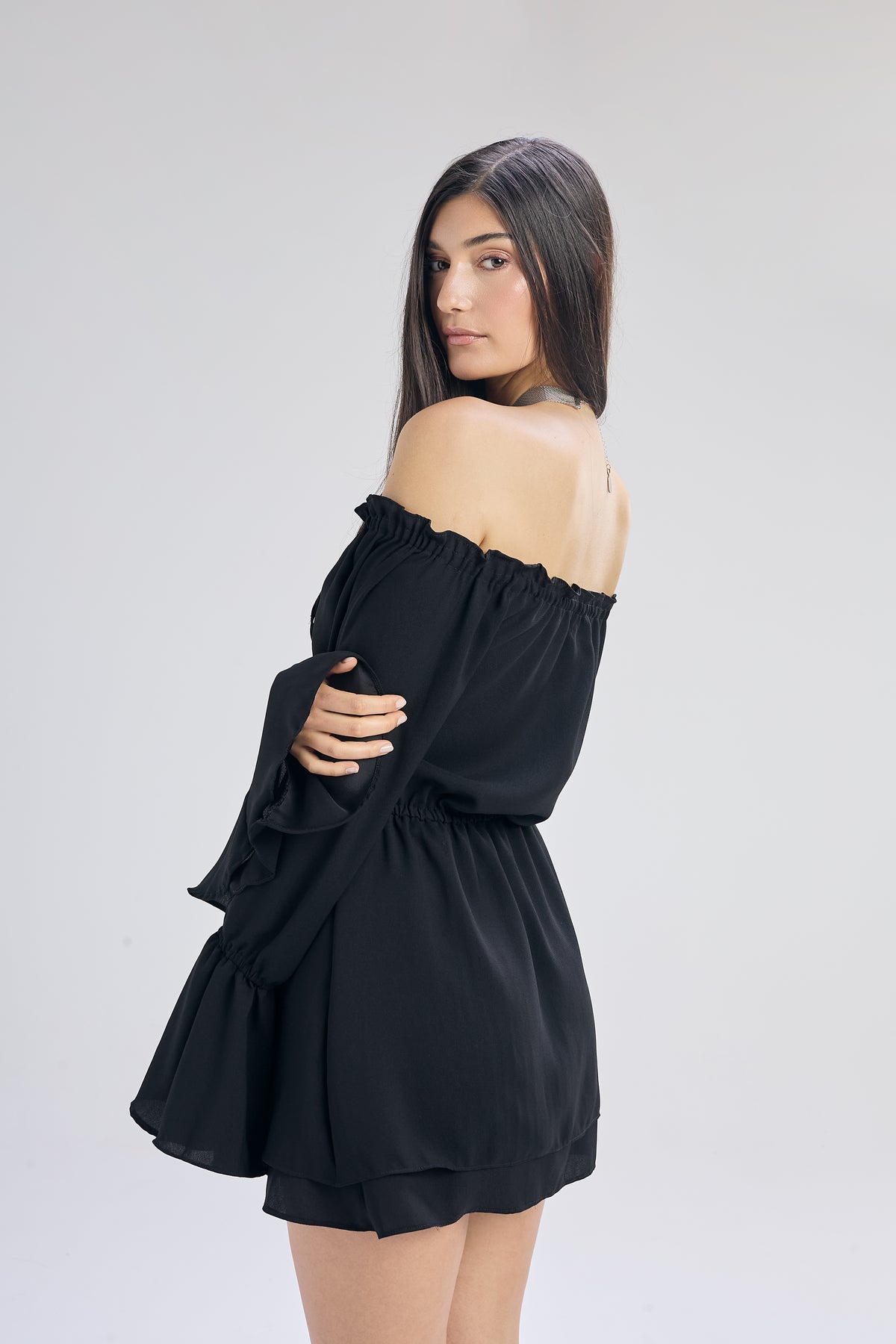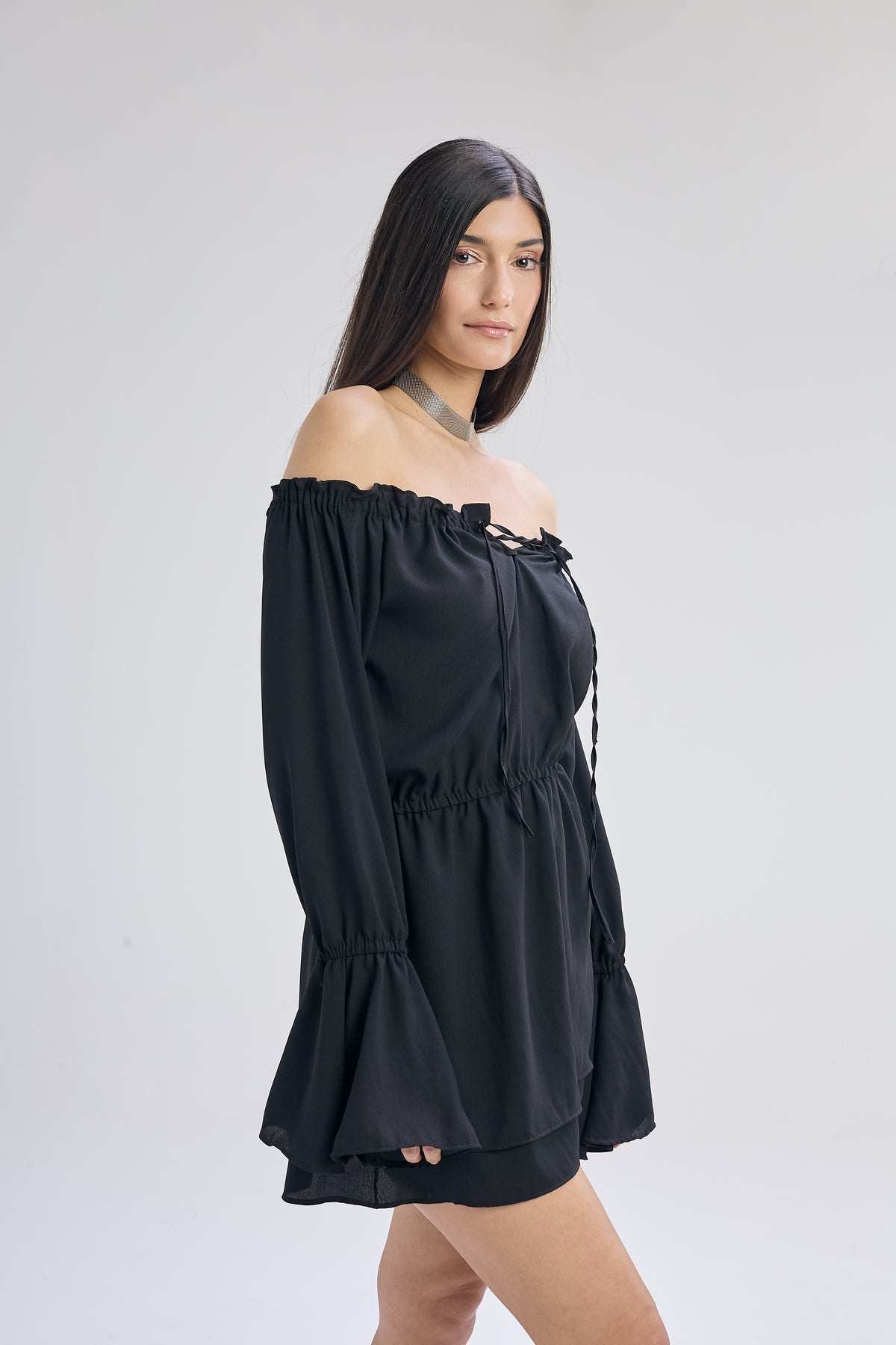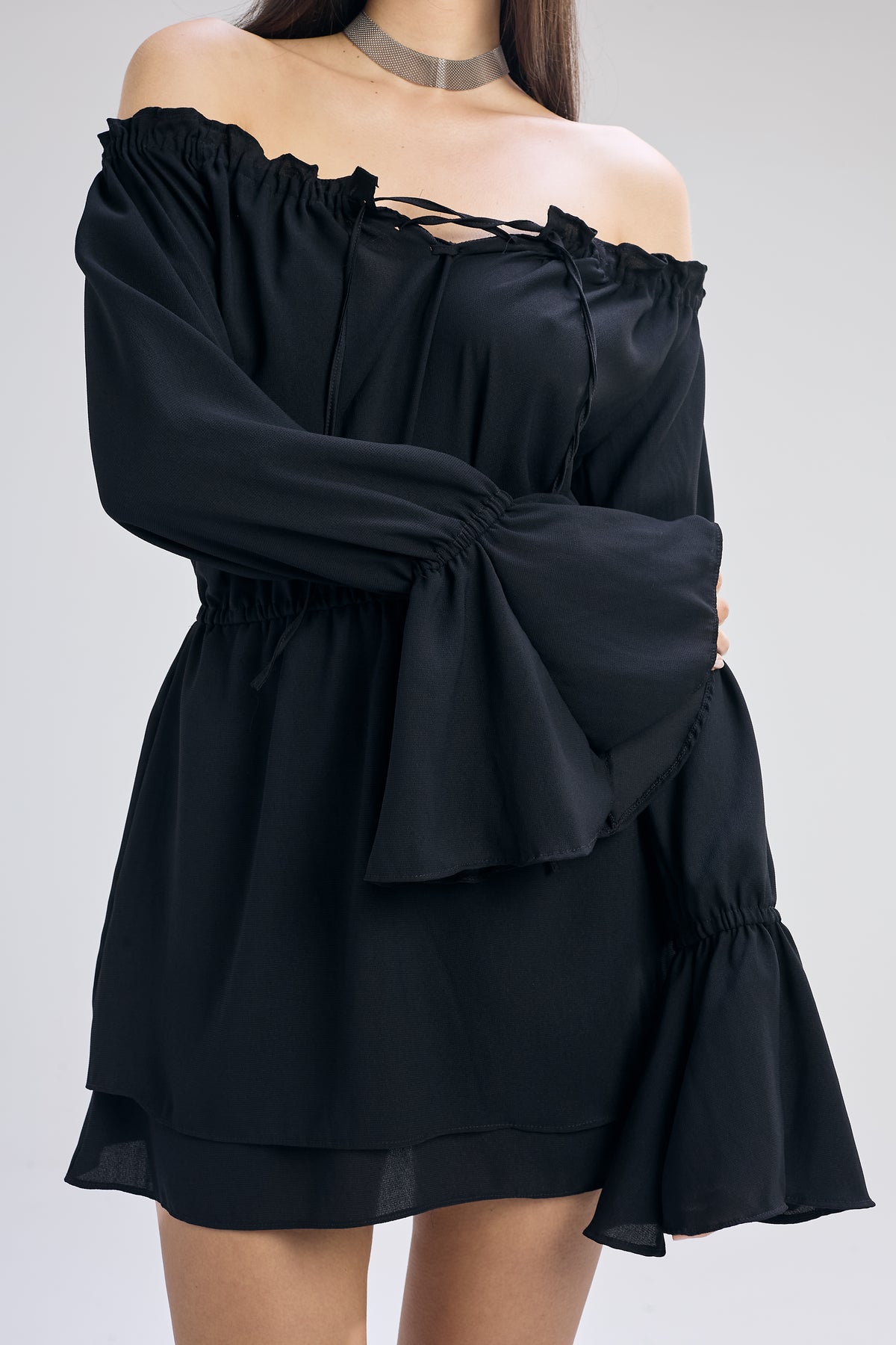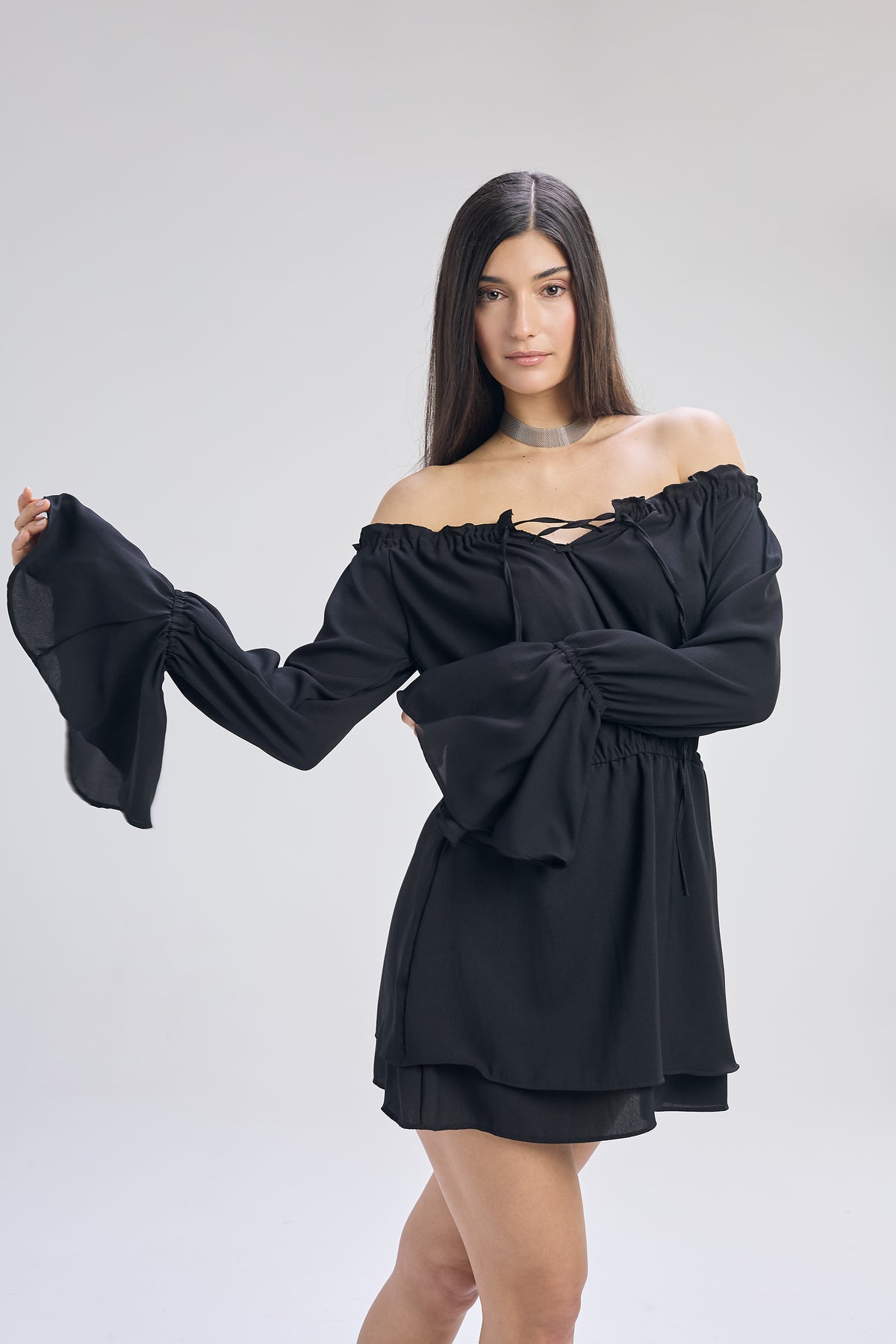 Vestido corto de voile color negro, calce holgado con ajuste en la cintura. Cuello bote con frunce, falda en capas y mangas estilo Oxford. Detalle de acordonado en frente y elástico en antebrazo, cintura y escote.