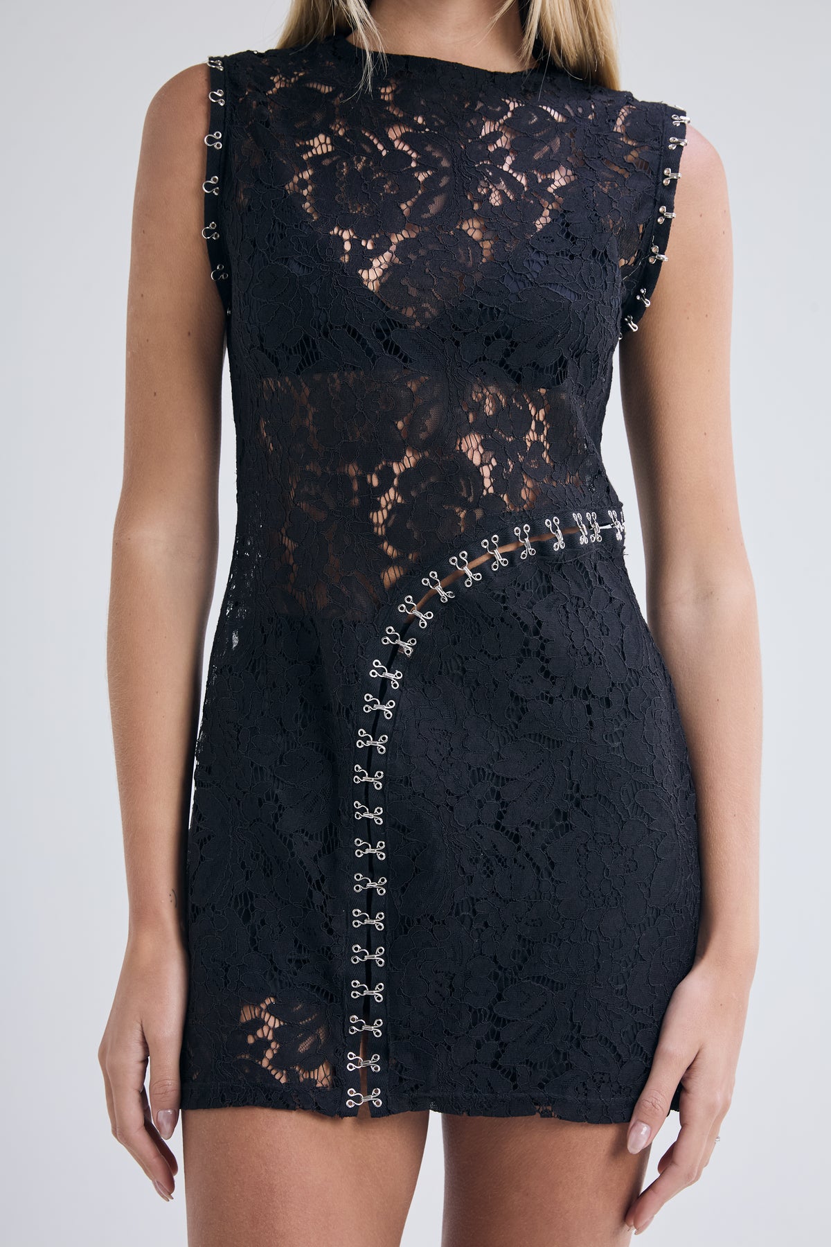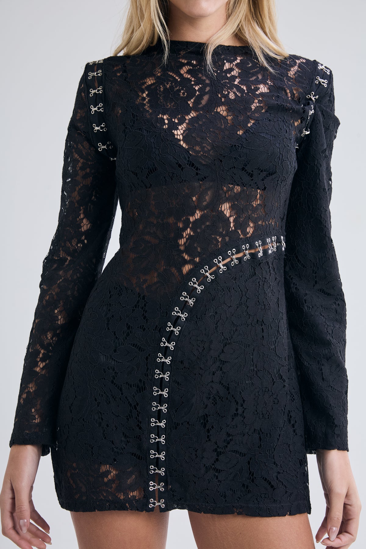 Prenda desmontable 3 en 1. Vestido de encaje color negro, calce al cuerpo y largo debajo de la cola. Pieza con cuello a la base y escote redondo. Mangas desmontables por medio de broches metálicos tipo corseteros, haciendo de este un vestido Manga larga o Musculosa; adaptándolo a tu gusto. En la parte inferior tiene un recorte asimétrico bordeando la cintura, permitiendo desmontarlo para transformarlo en top. Prenda muy versátil, se adapta a toda ocasión.