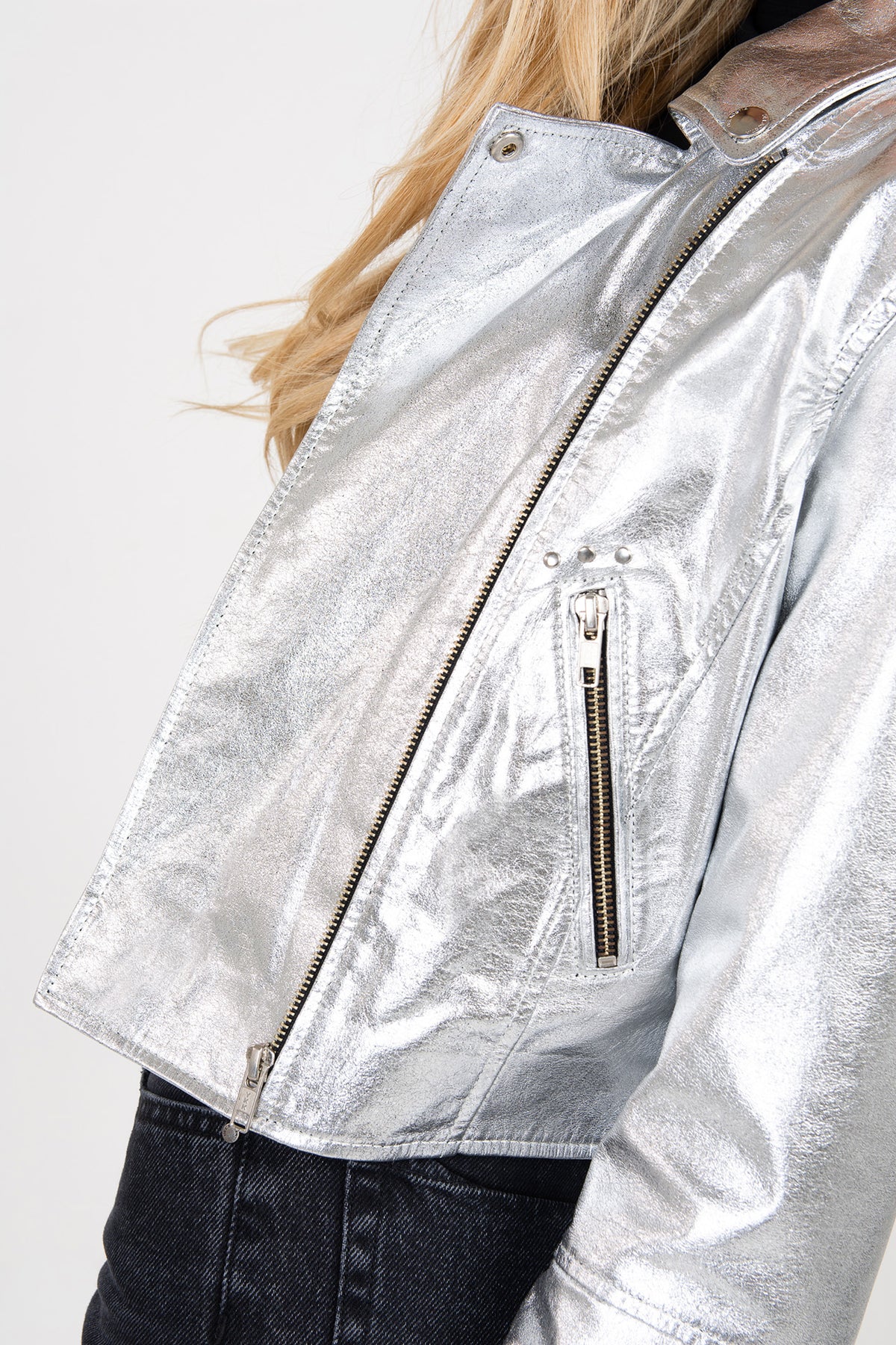 Descubrí nuestra Campera Glow con silueta slim y largo a media cintura, este look crop combina estilo y modernidad. La tela y los detalles de tachas en el delantero ofrecen un look moderno y canchero.
