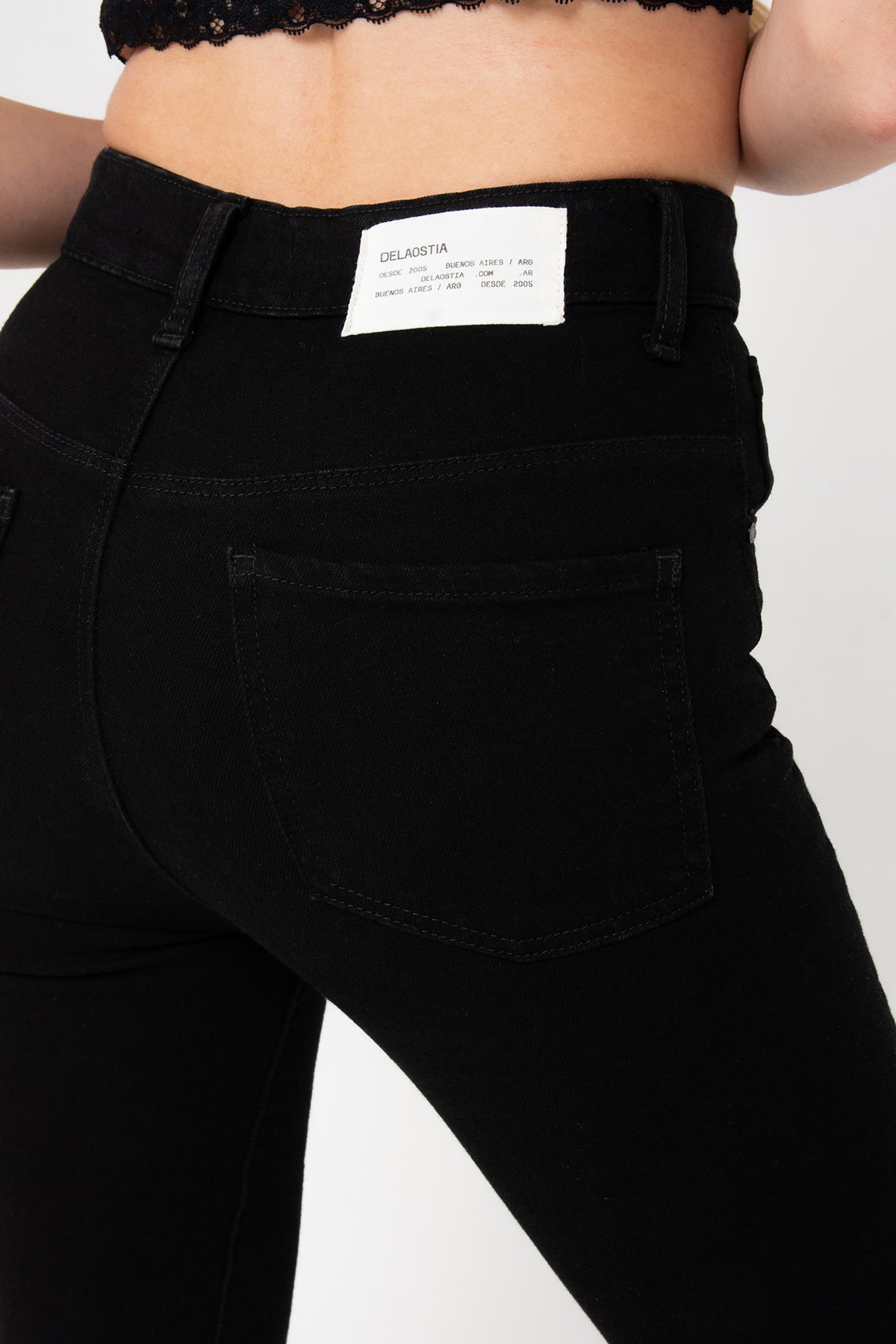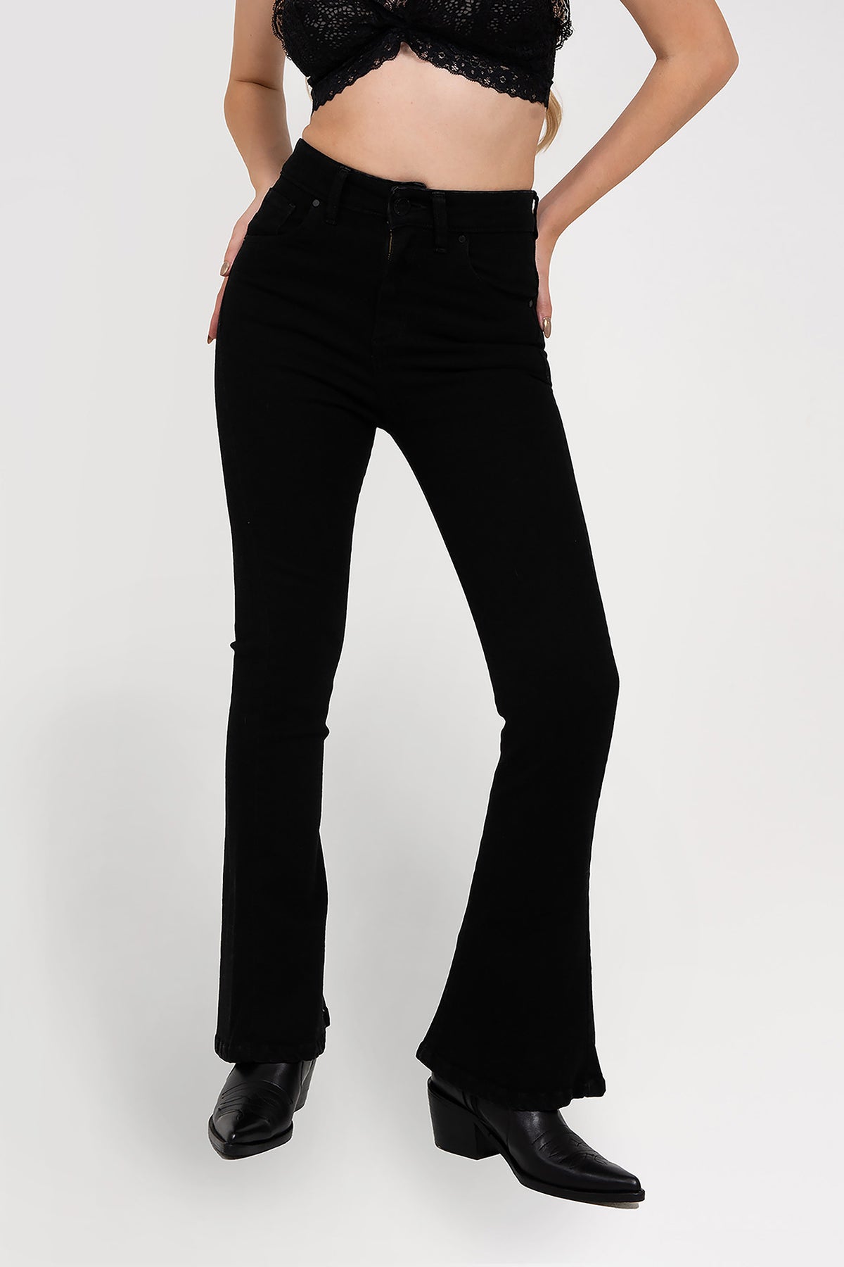 Pantalón de jean negro, tela con elasticidad. Tiro alto. Silueta Flare.