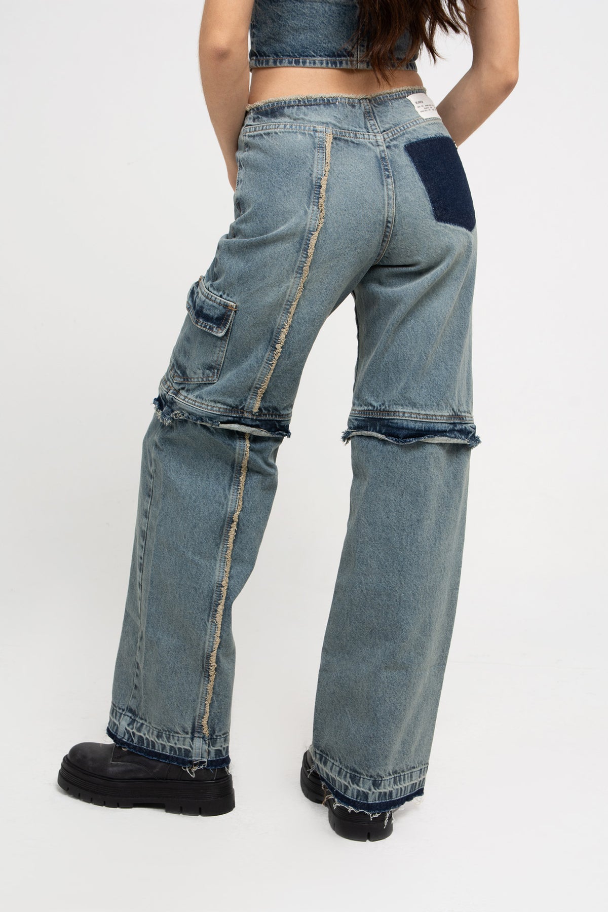 Pantalón de Jean azul óxido sin cintura desflecado, con cierre en rodillas para desmontar.
