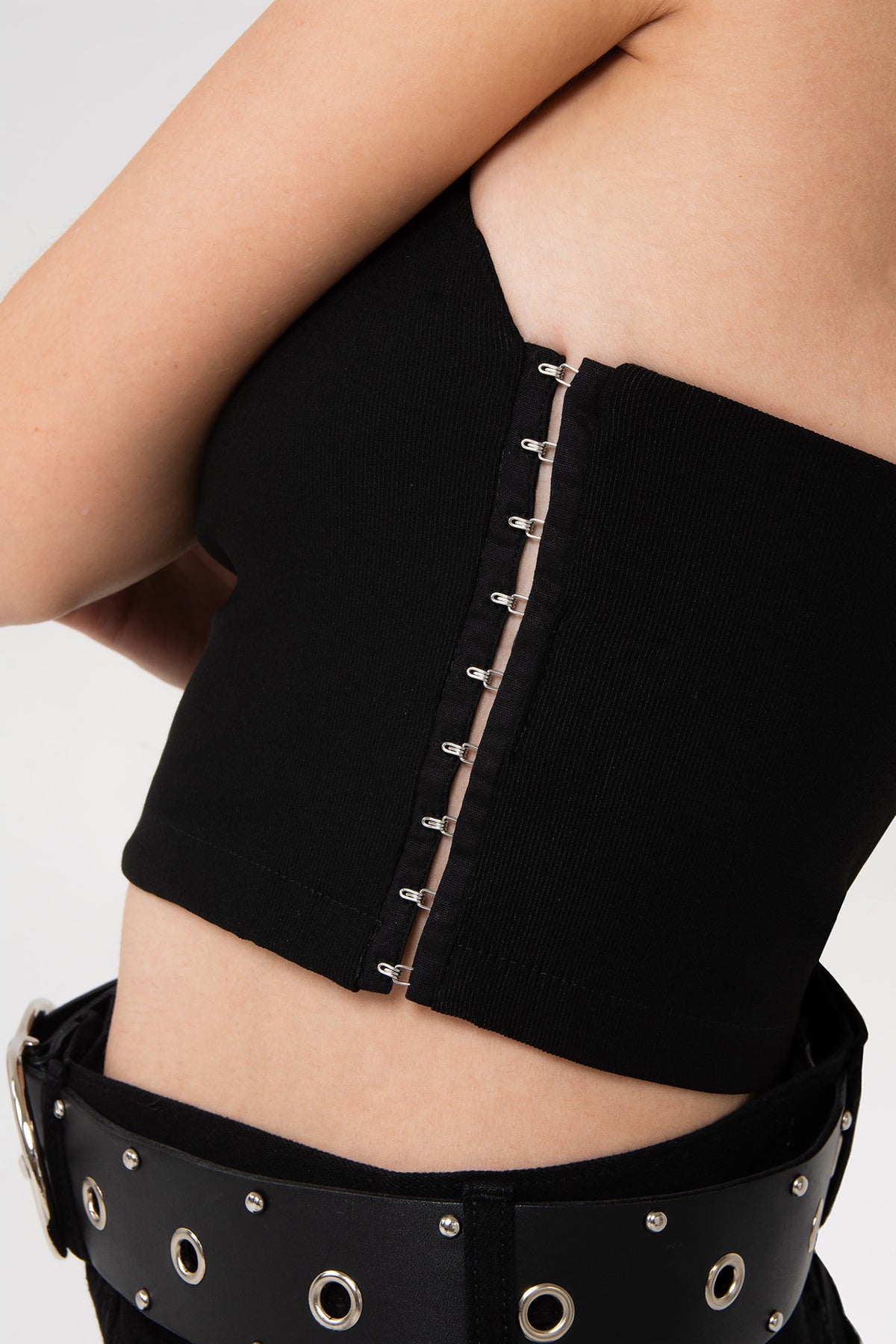 Musculosa de laterales abiertos con ganchitos corseteros. Sophie cuenta con un largo modular hasta la cintura y su silueta es slim. Ideal para un look de día.