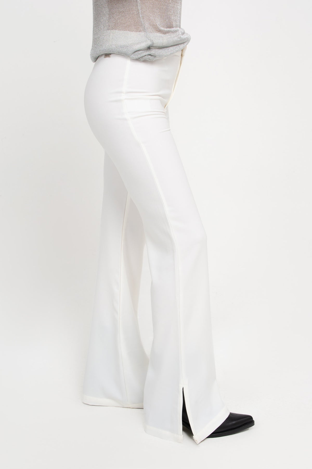 Pantalón de botamanga ancha con tajo en lateral. Silueta Slim. Tiro alto y largo modular.