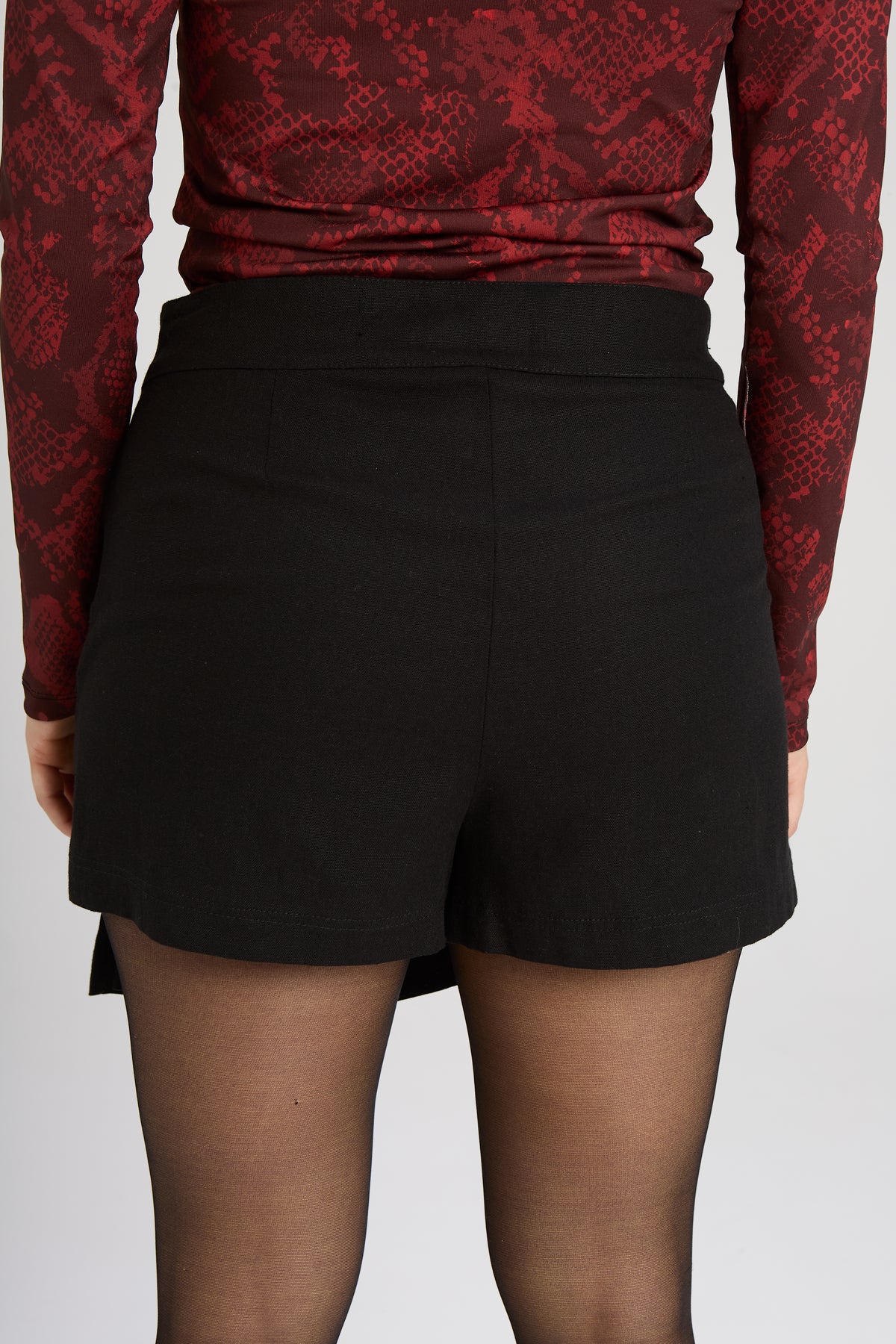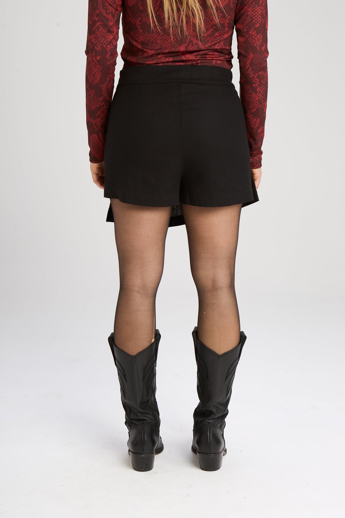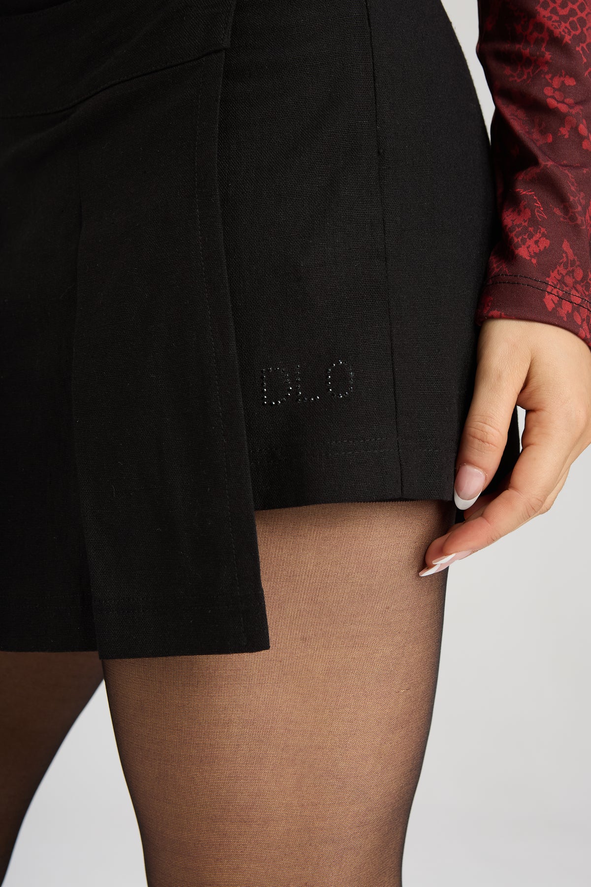 Pollera pantalon de lino color negro, calce holgado y tiro medio. Cintura asimetrica cruzada con tableado ancho unida a la prenda por gancho pantalonero. Detalle de estampa institucional en hotfix a tono en delantero izquierdo. Acceso mediante cierre invisible a tono en lateral. Llevalo en conjunto con su camisa!