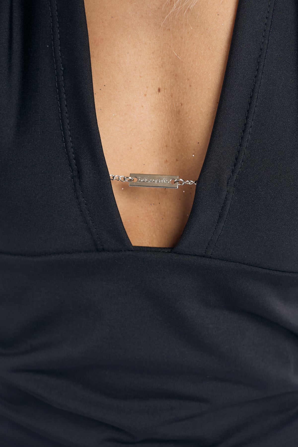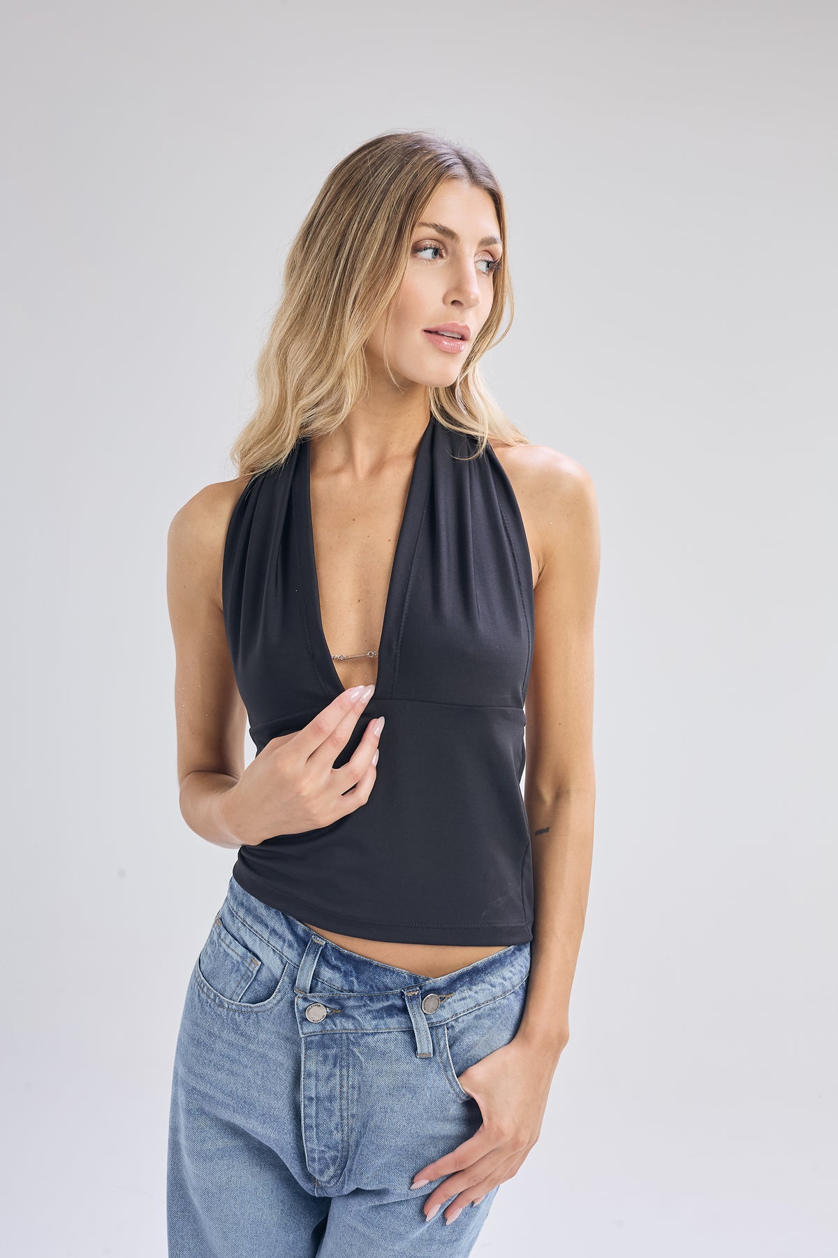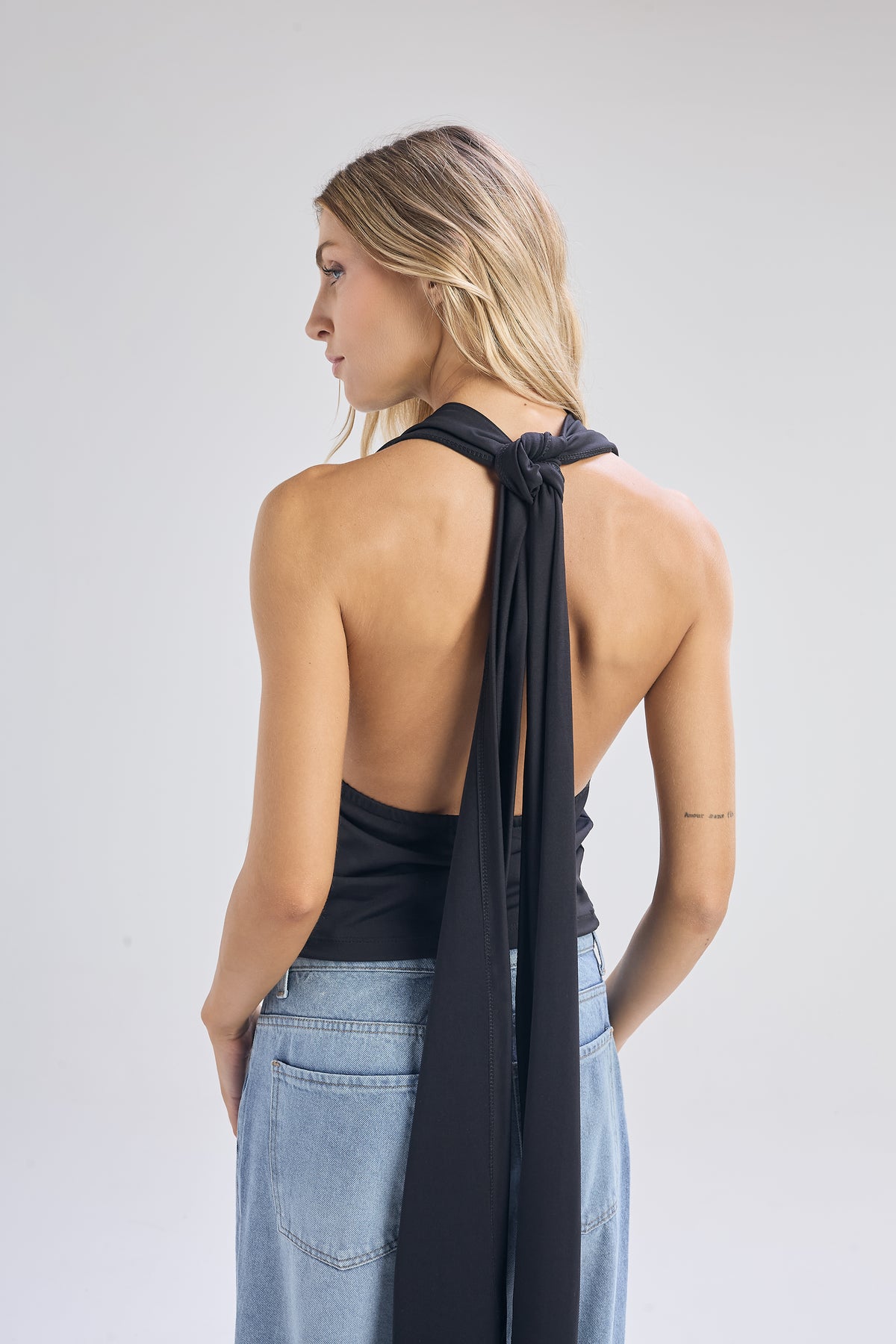 Top con tiras largas para ajuste en cuello, varias formas de utilizar. Esta hecho en tricot, cuerpo ajustado, largo a la primer cadera.