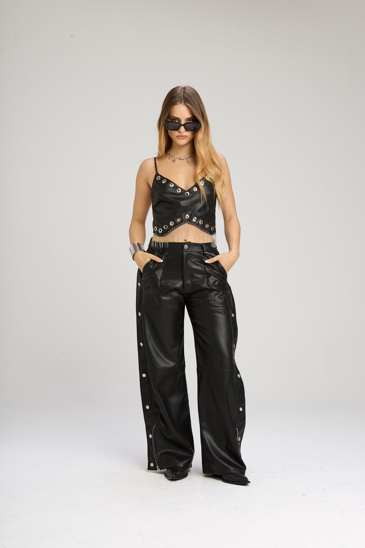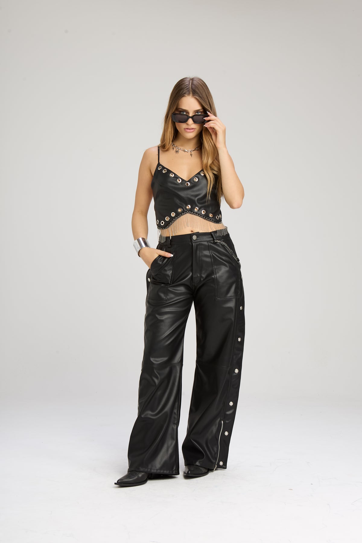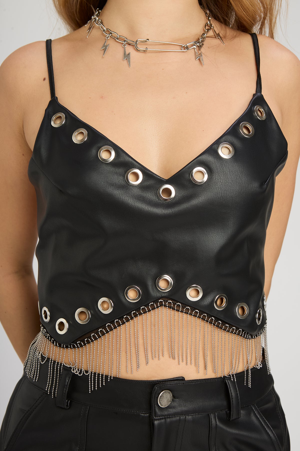 Top con Pu, color negro, calce al cuerpo y largo a la cintura. Top tipo corset con escote en v, remaches en todo el contorno de busto y parte inferior de ruedo, jugando con el recorrido y distintos tamaños de aplique. Posee embutido en la parte del ruedo una tira de flecos perlita que le otorga movimiento y un plus rocker a la prenda. La espalda se encuentra totalmente descubierta con un regulador para ajustar a medida.