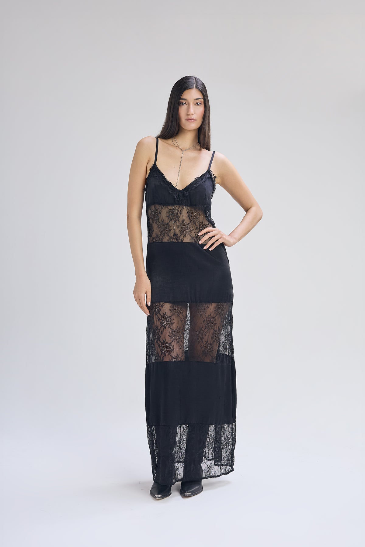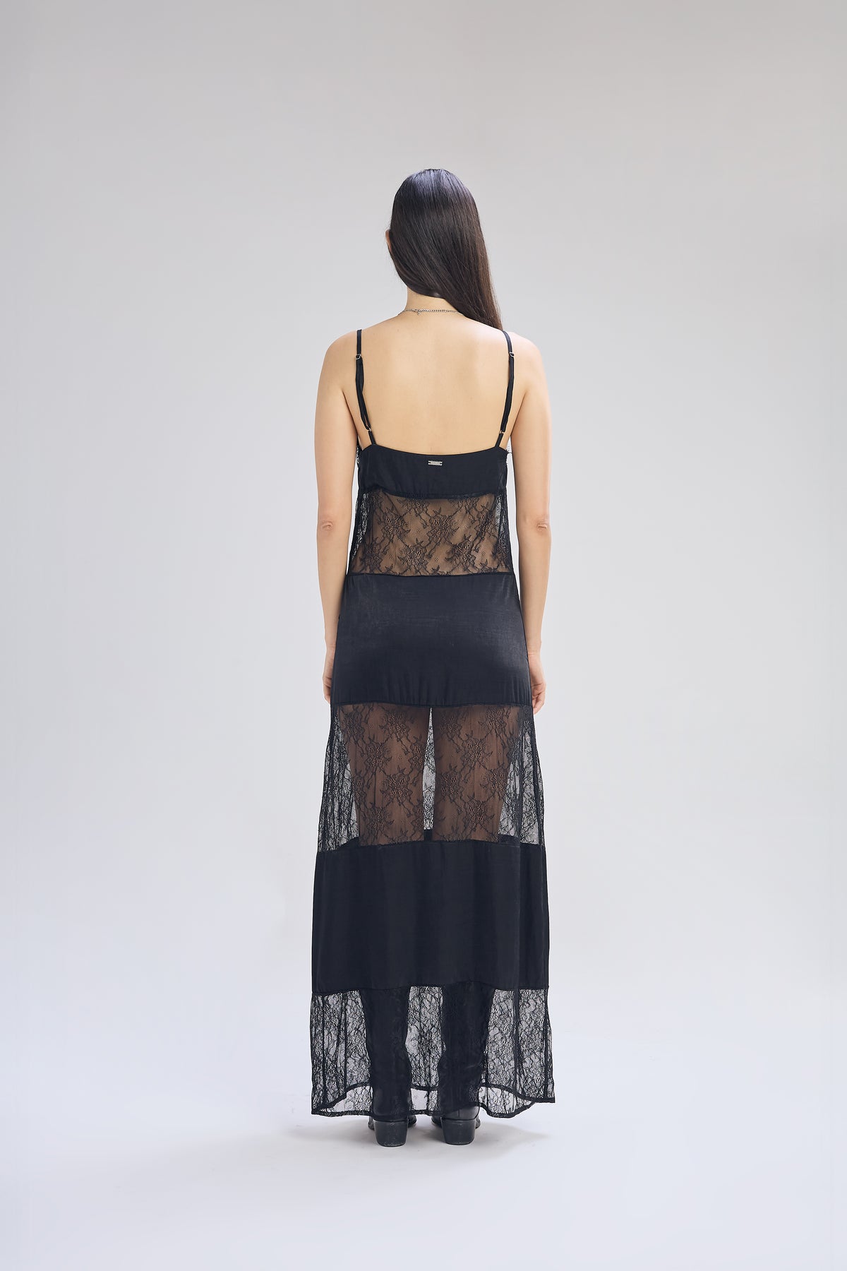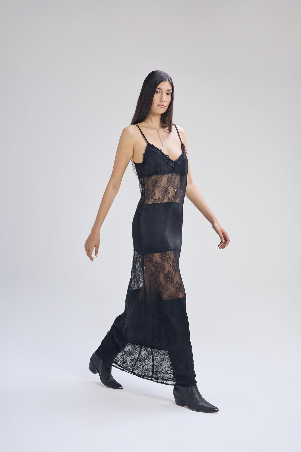 Vestido tipo lencero de satén y encaje color negro, con calce entallado en busto y amplio hacia abajo. Vestido escote en v con breteles para regular y puntilla en doto el contorno de busto. Vestido con combinación de tela alternando entre una y otra por medio de recortes a lo largo de toda la prenda. Largo hasta el tobillo.
